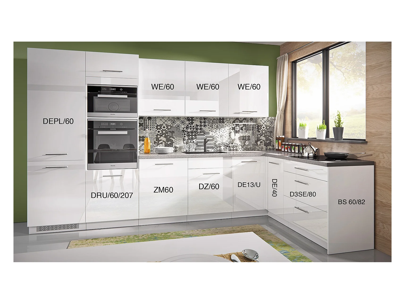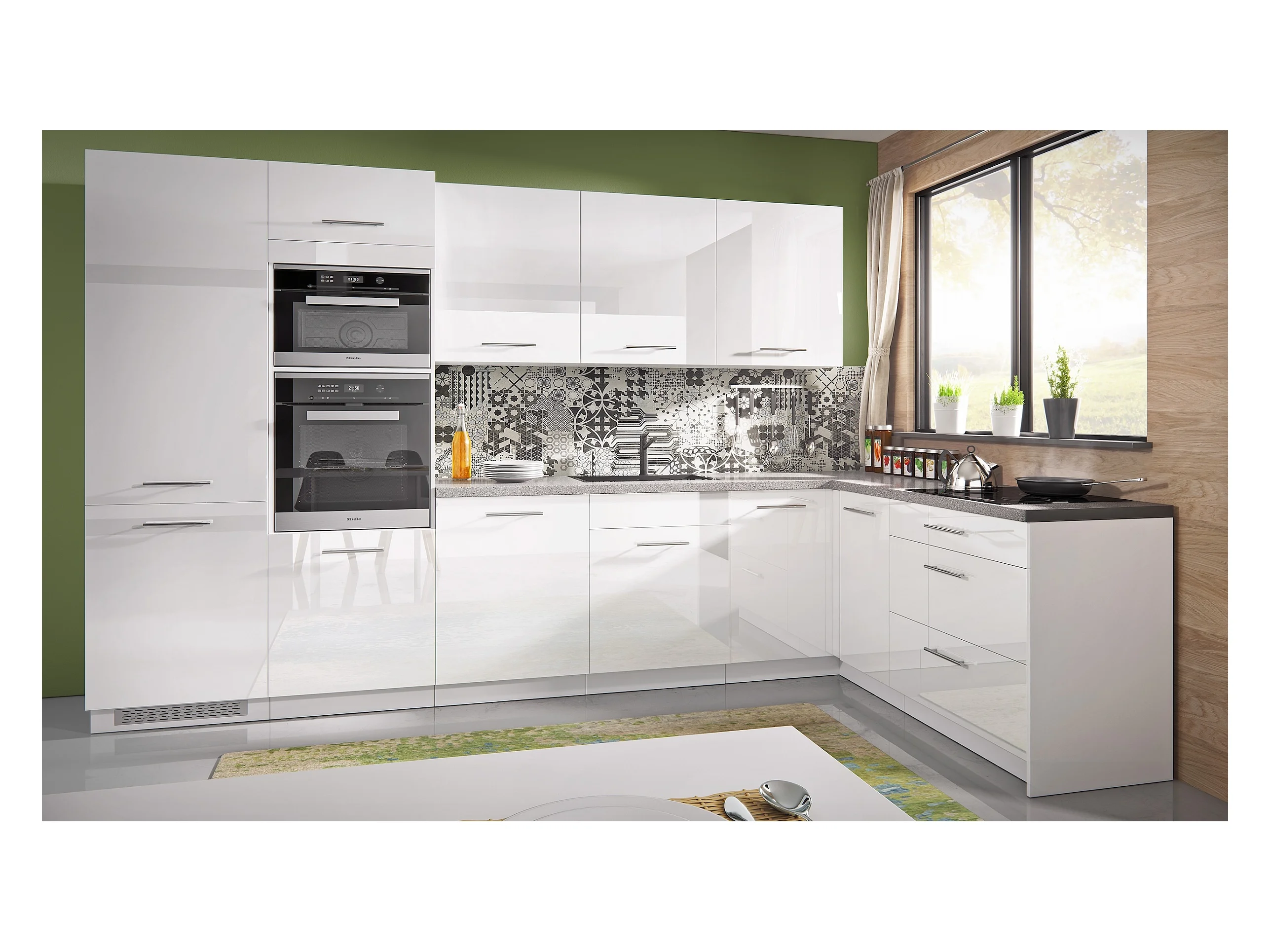 L-FORM KÜCHENZEILE Essen Trend 10-teilig Perlweiß / Weiß Hochglanz 345 / 190 / 207 cm