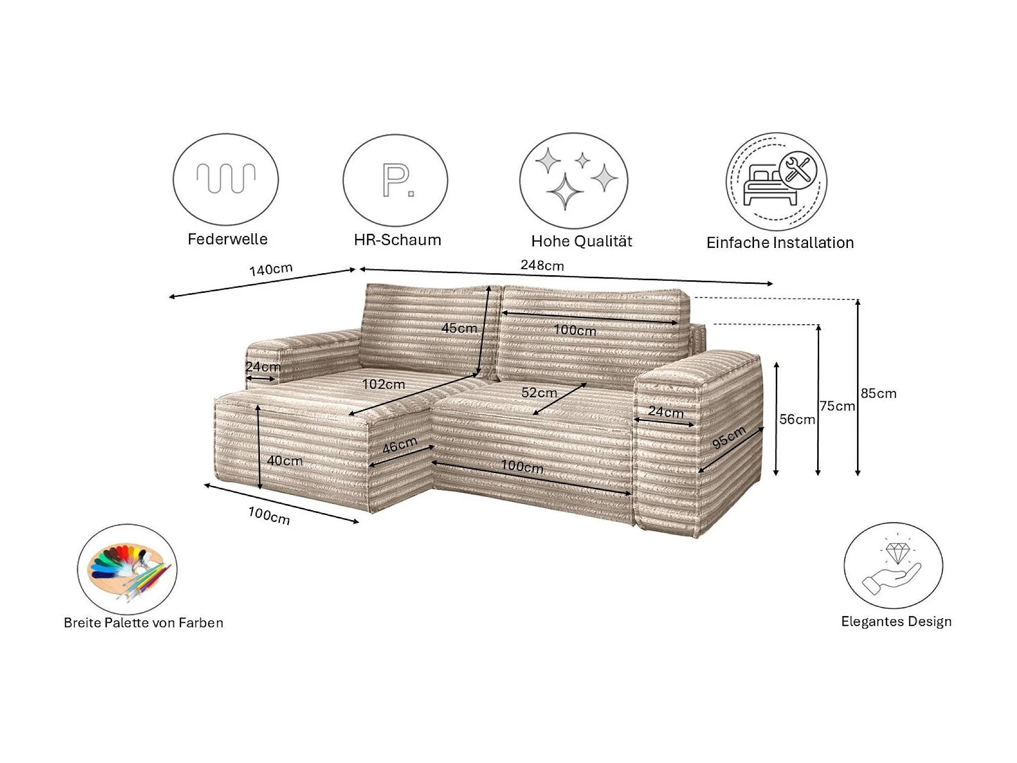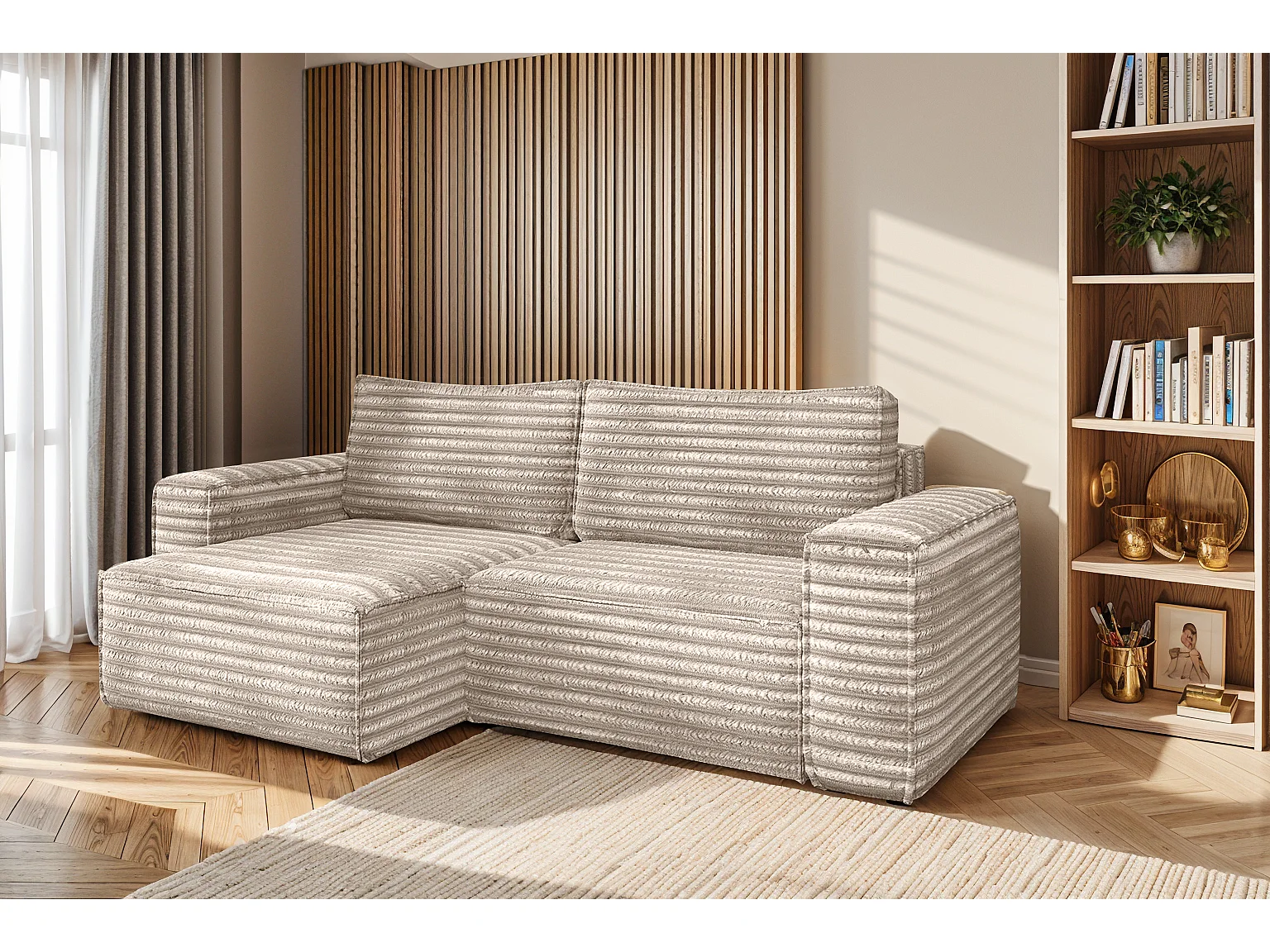 L-förmiges Bohoo-Ecksofa mit Schlaffunktion, Stoff Velo, Beige, Links