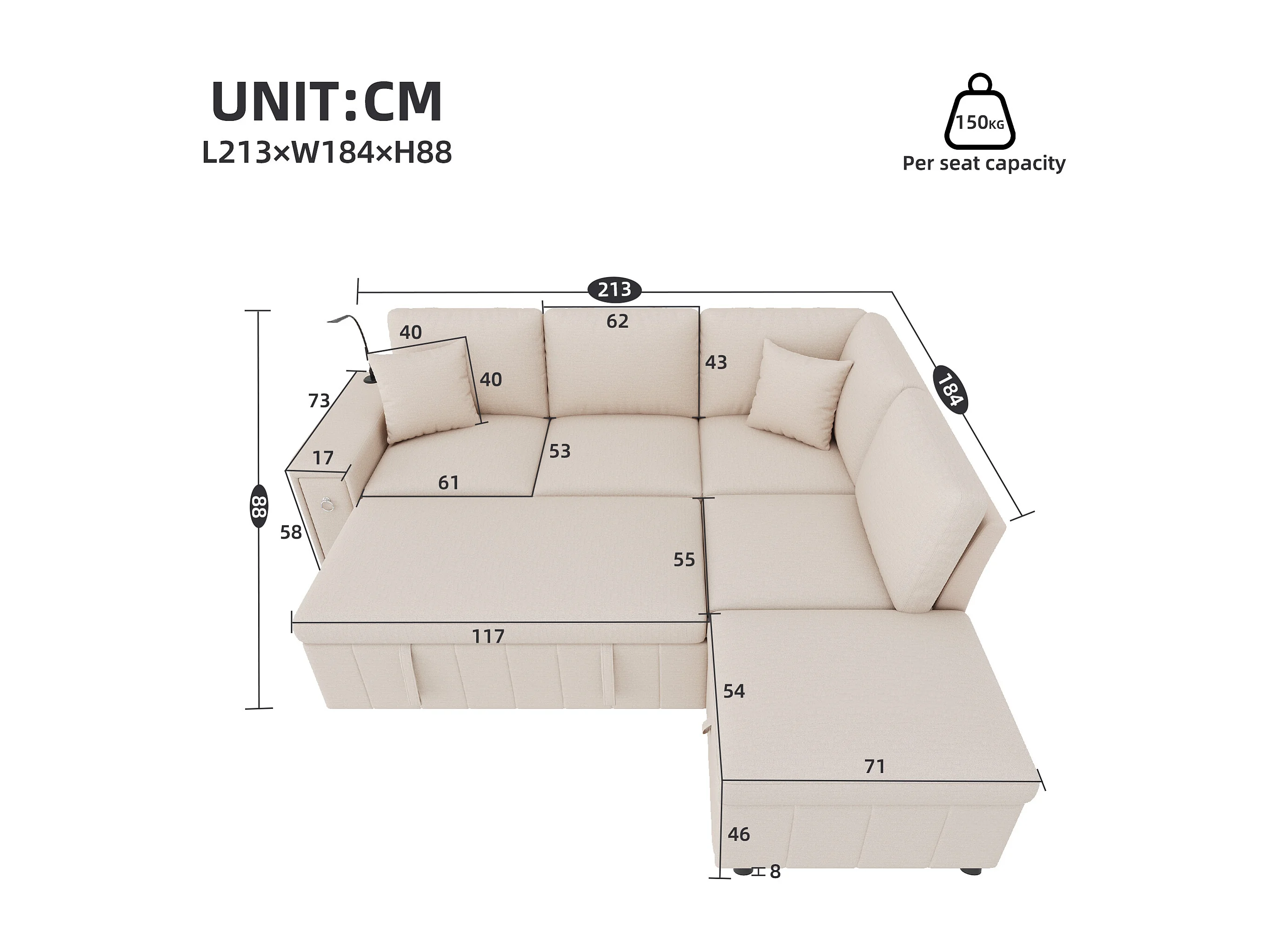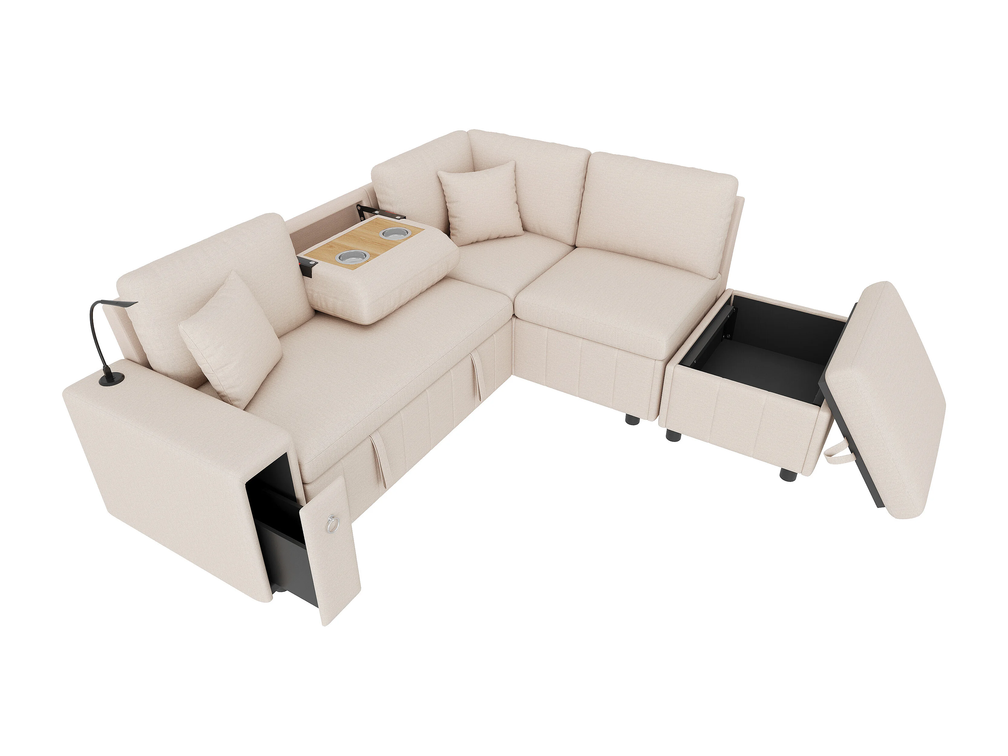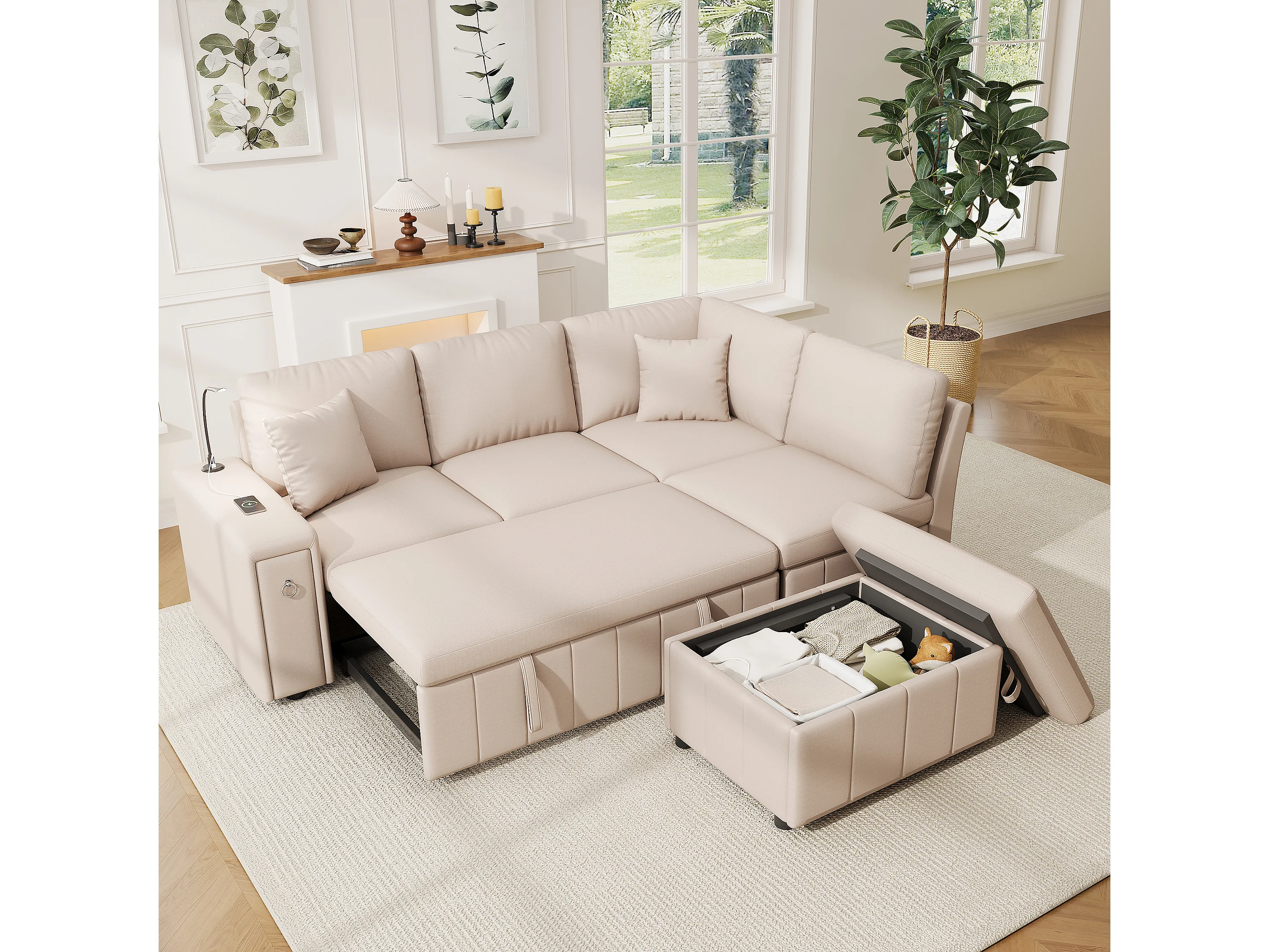 L-förmiges Eckschlafsofa – 213 x 184 x 88 cm – mit Stauraumhocker, USB-Anschluss und 2 Kissen – Leinen – Beige