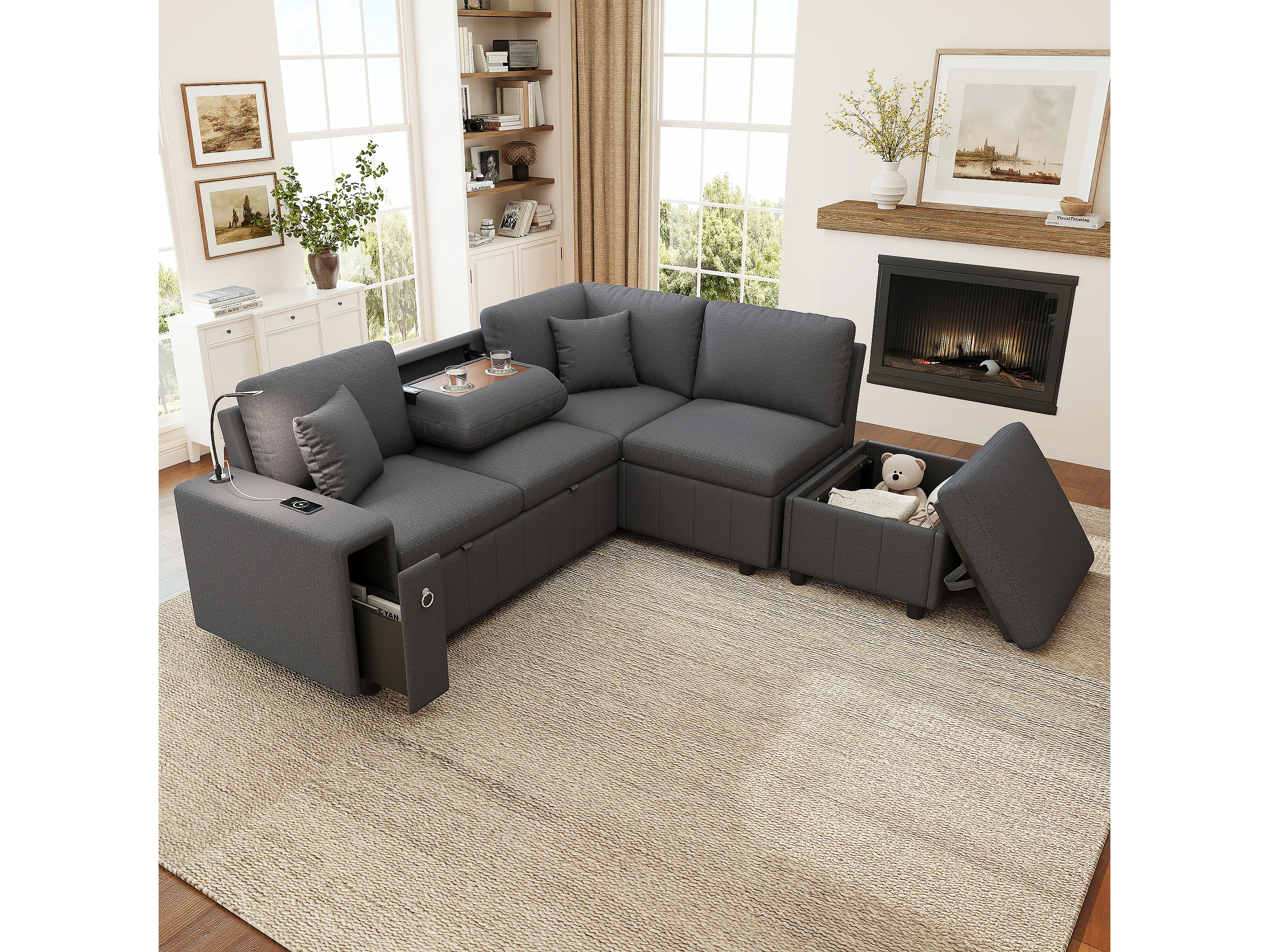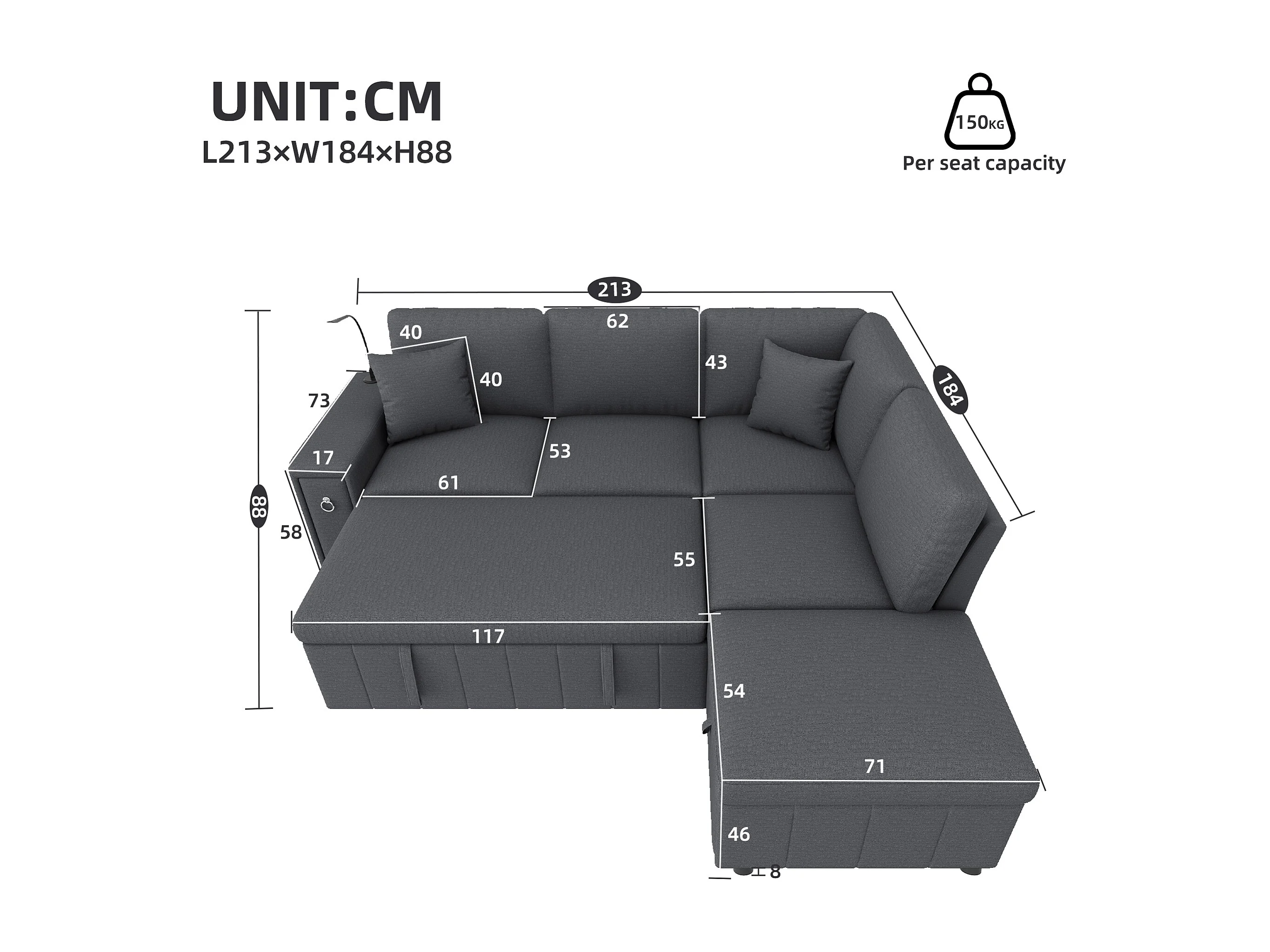 L-förmiges Eckschlafsofa – 213 x 184 x 88 cm – mit Stauraumhocker, USB-Anschluss und 2 Kissen – Leinen – grau
