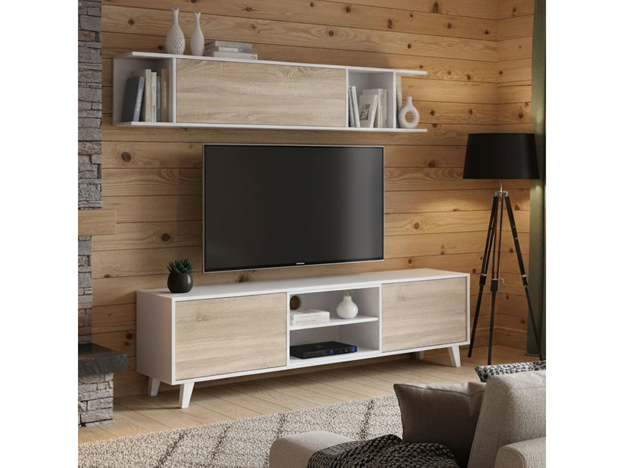 Lagerwand Buffalo, TV-Ständer für Wohnzimmer, Wohnzimmerkomposition mit Wohnwand, 180x41h51 cm, Weiß und Eiche