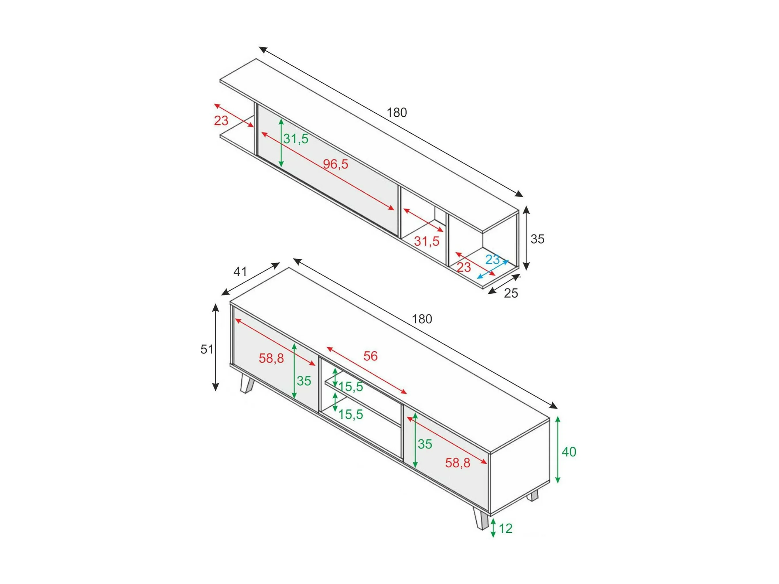 Lagerwand Darcole, TV-Ständer für Wohnzimmer, Wohnzimmerkomposition mit Wohnwand, 180x41h51 cm, Weiß und Eiche