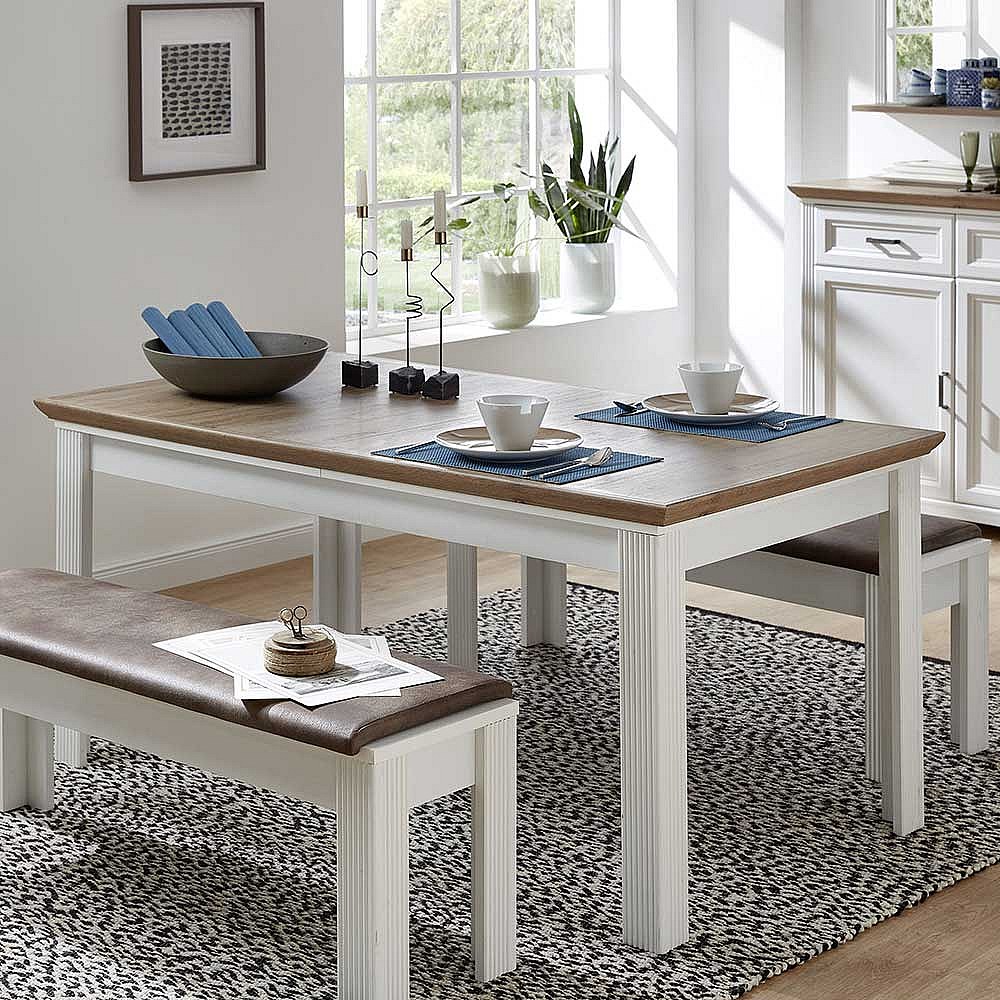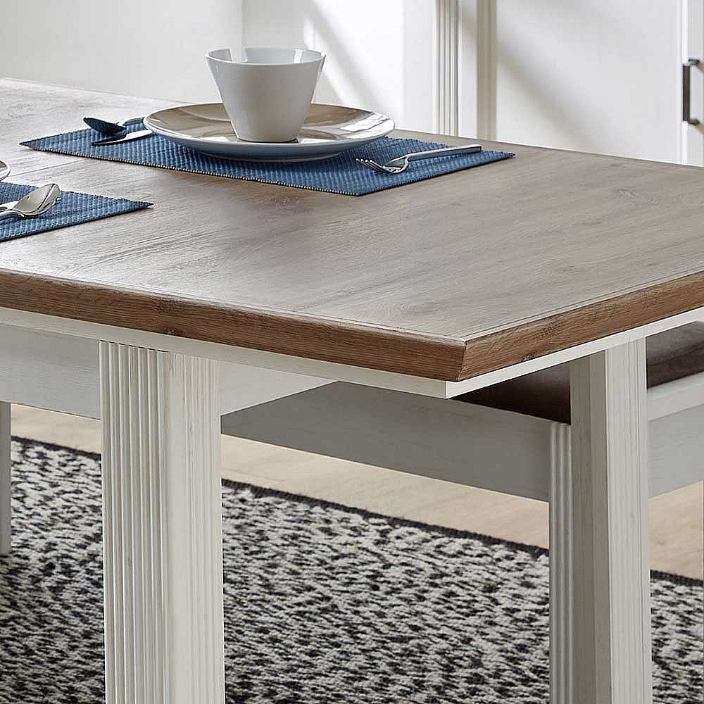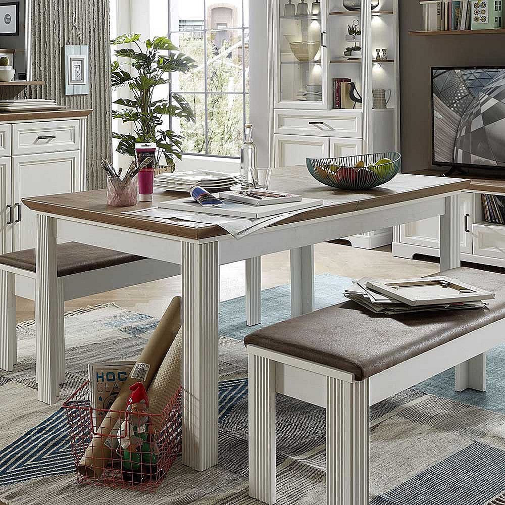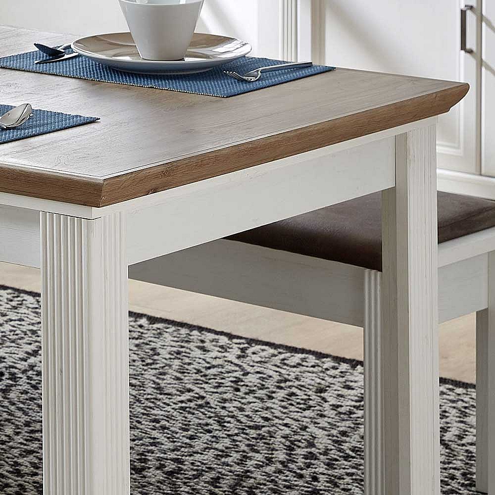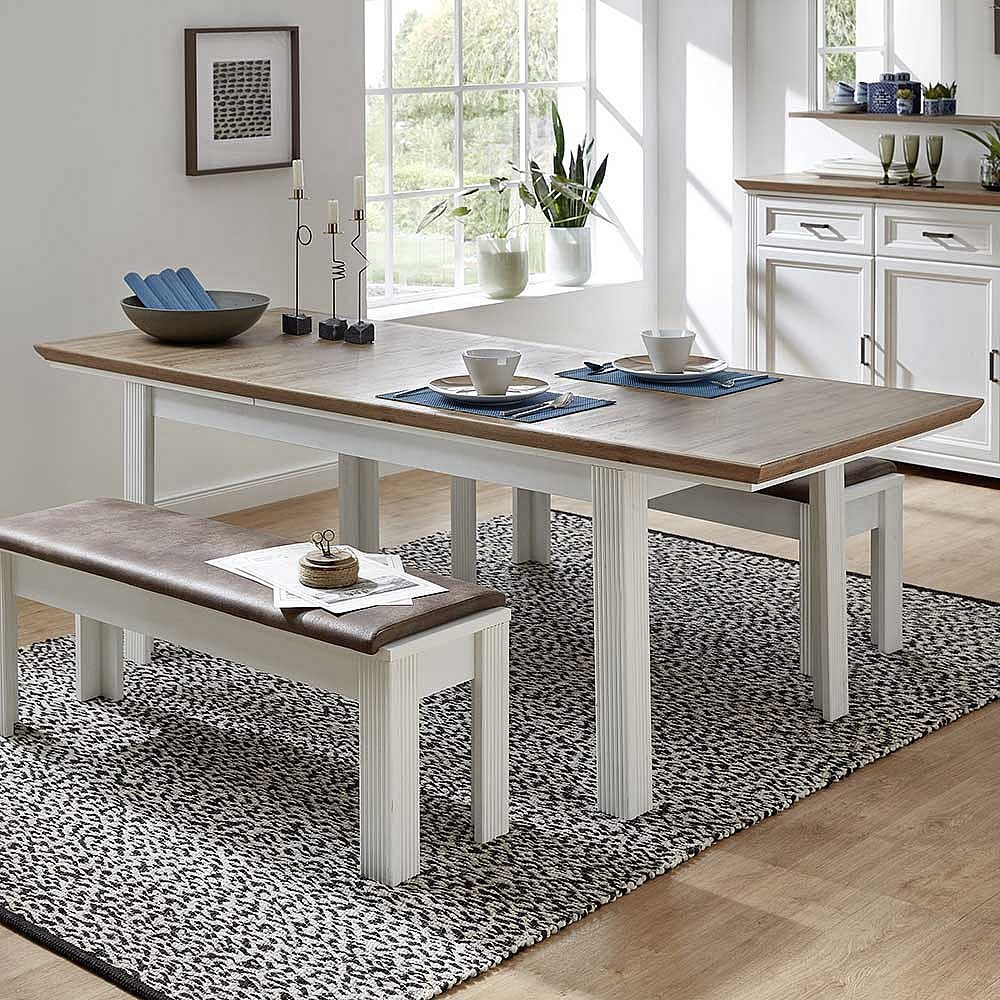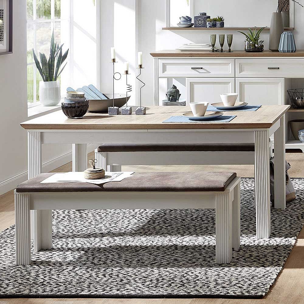 Landhaus Essgruppe in Weiß und Eichefarben Bänken