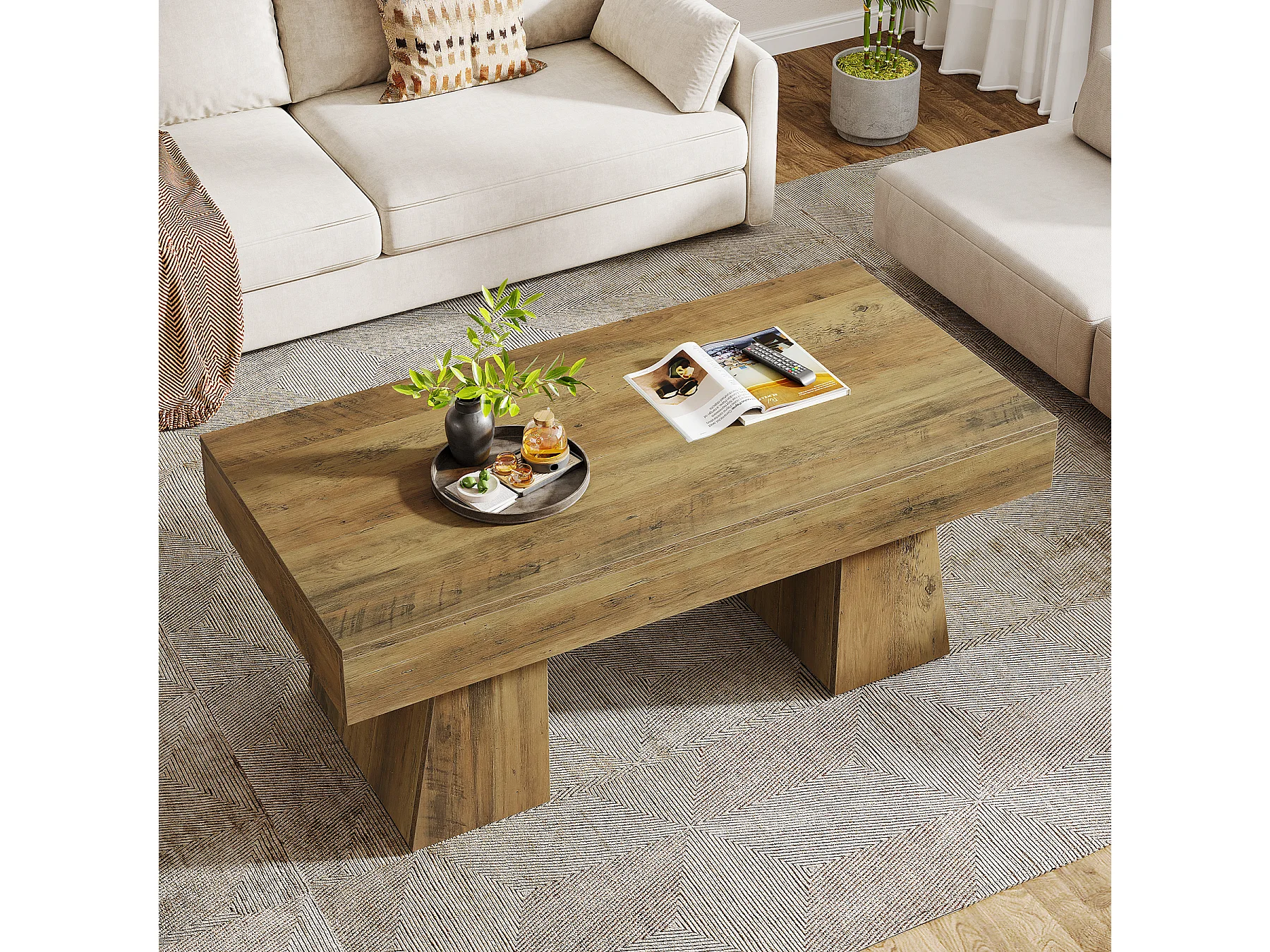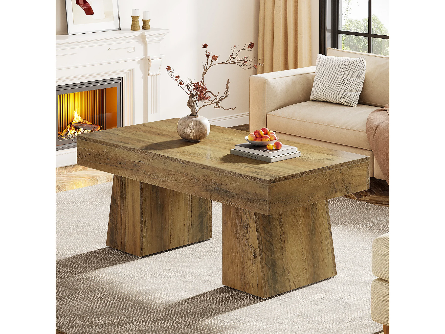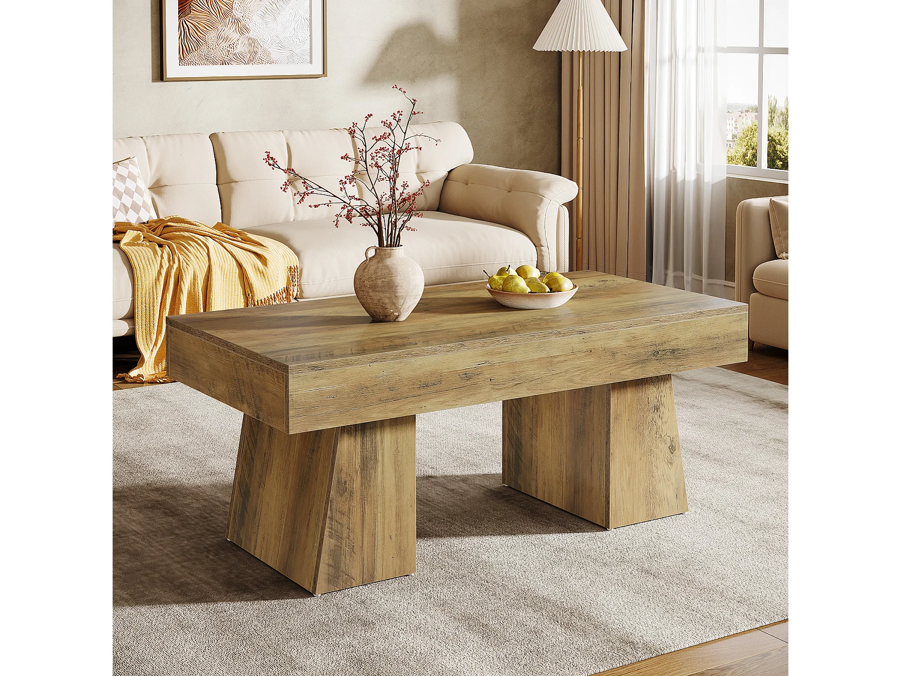 Landhaus-Kaffeetisch, 120 cm langes rechteckiges Akzent-Zentertable mit dickem Sockel, modernes niedriges Cocktail-Tee-Möbelstück