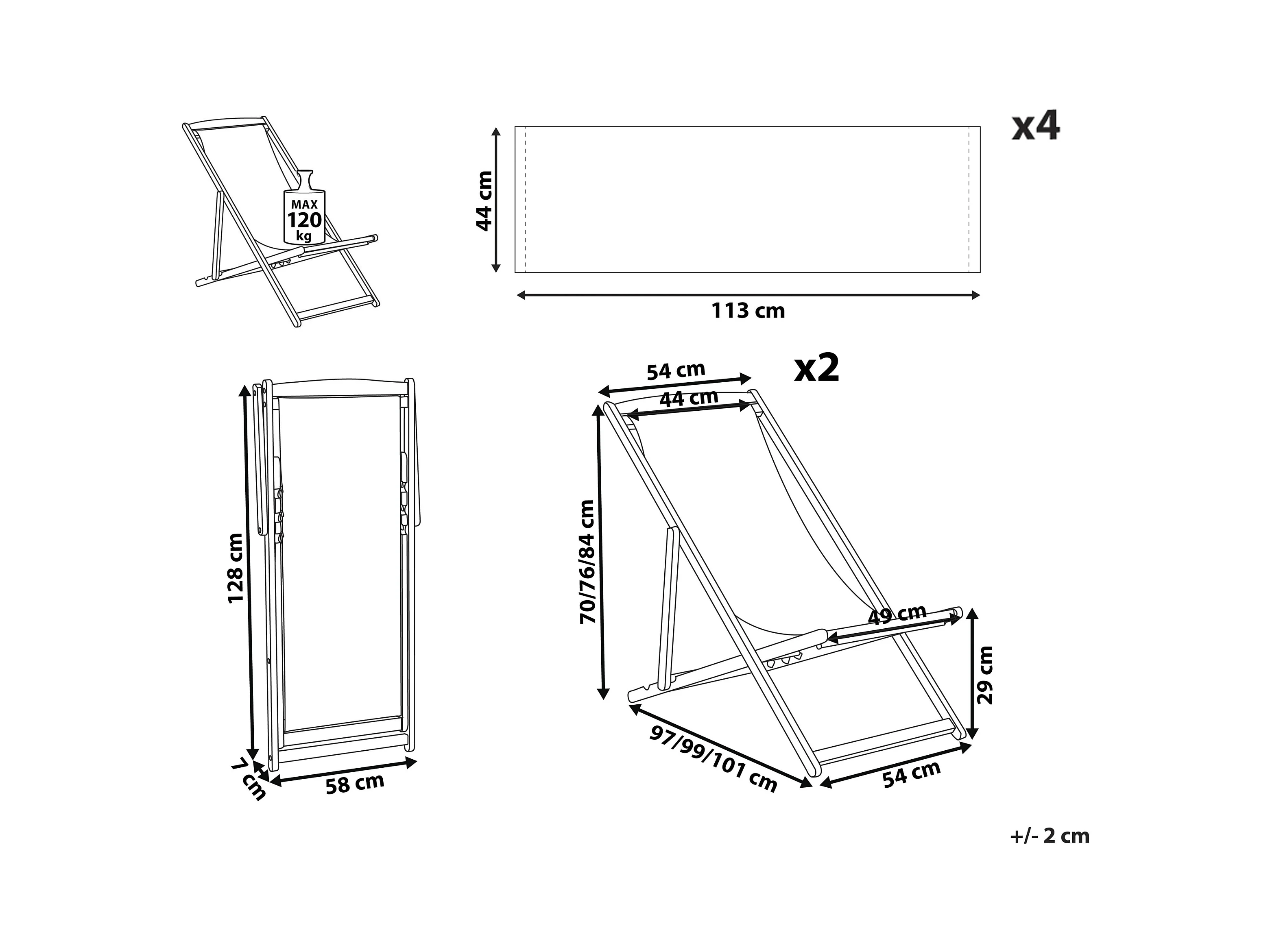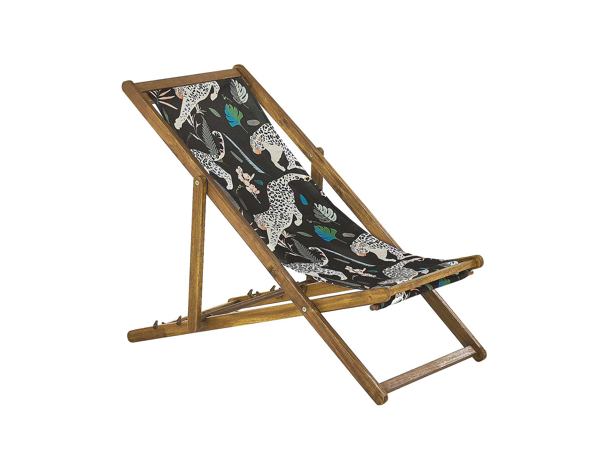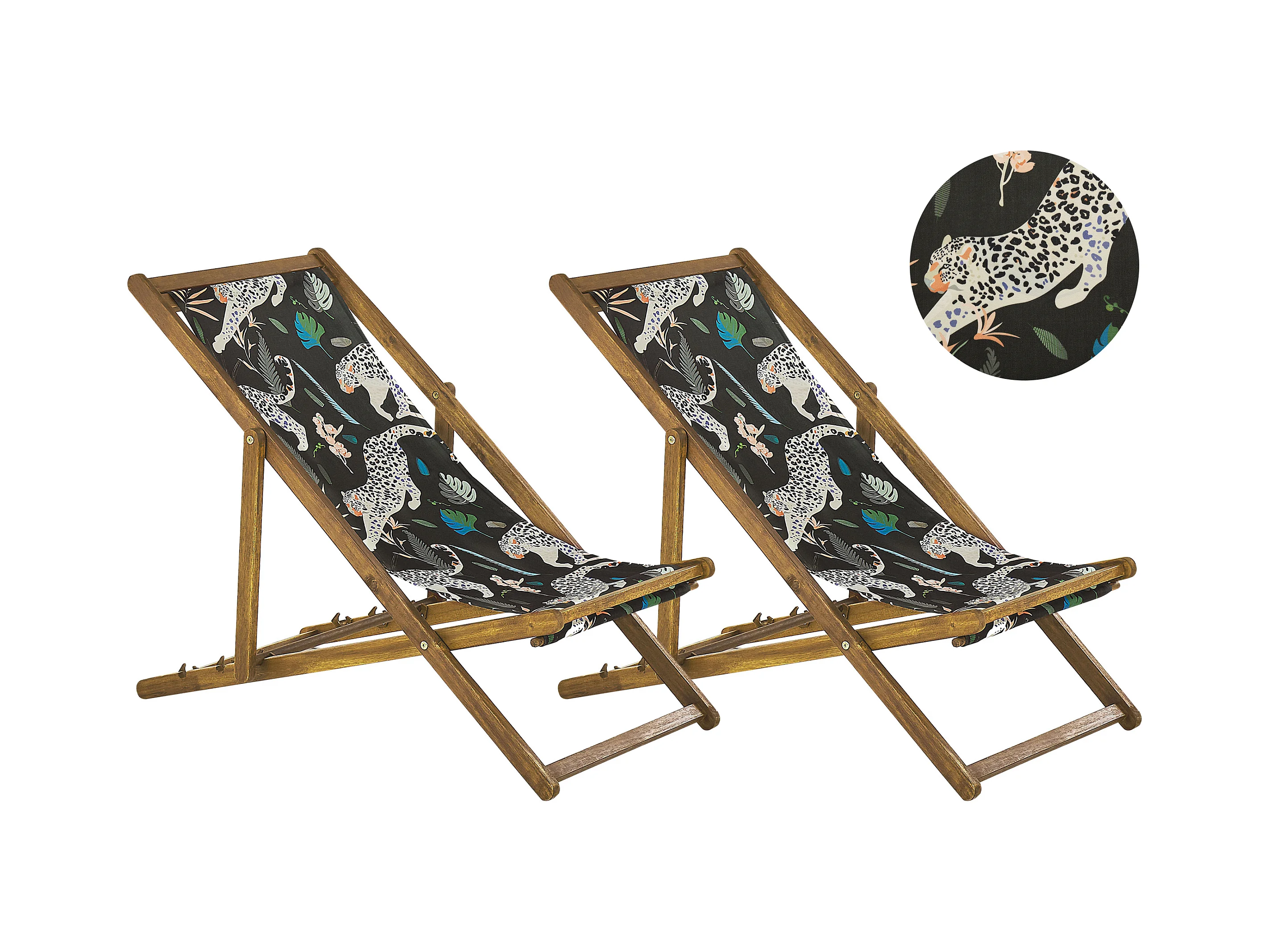 Zwei Liegestühle aus hellem Akazienholz Stoffbezüge Gepardenmotiv schwarz Anzio