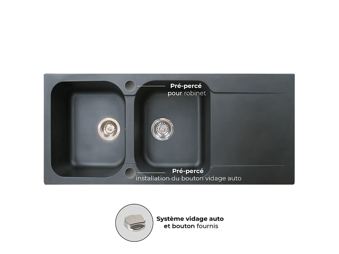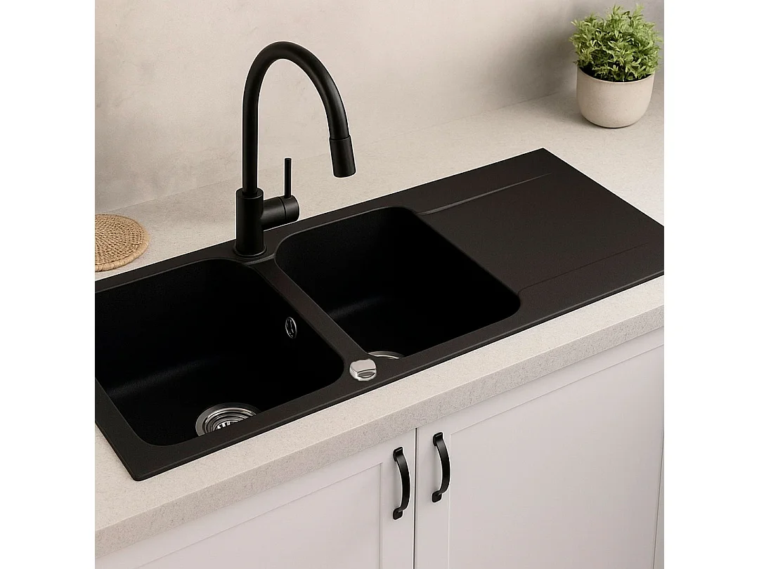 Lisse umkehrbare Spüle 2 Becken 1 Abtropfbecken aus schwarzes Harz Essebagno