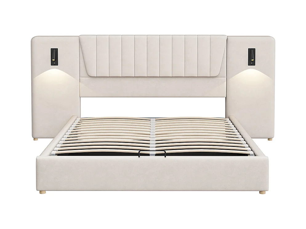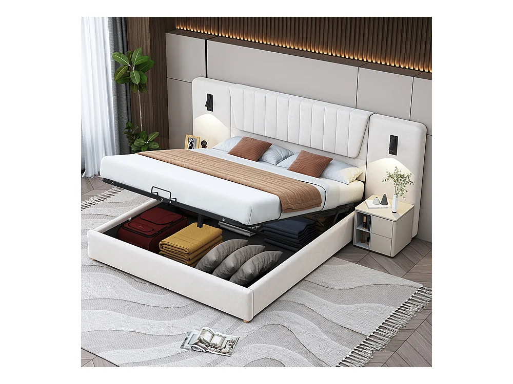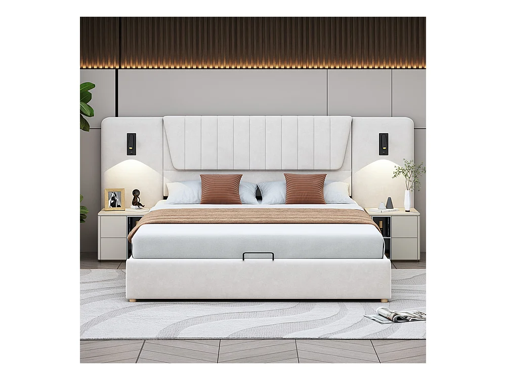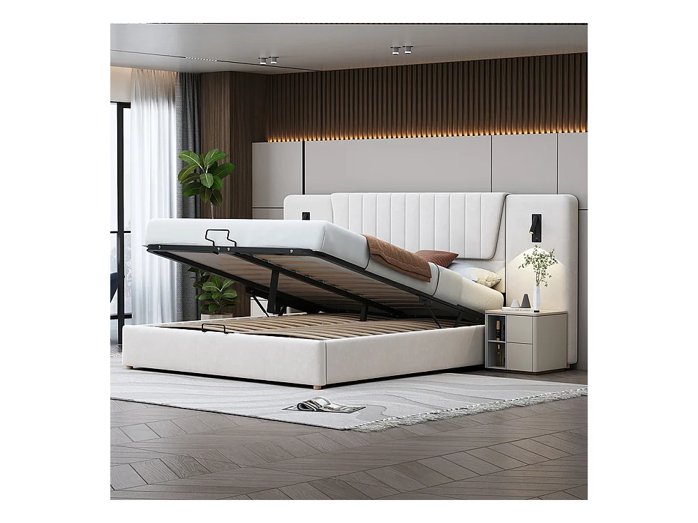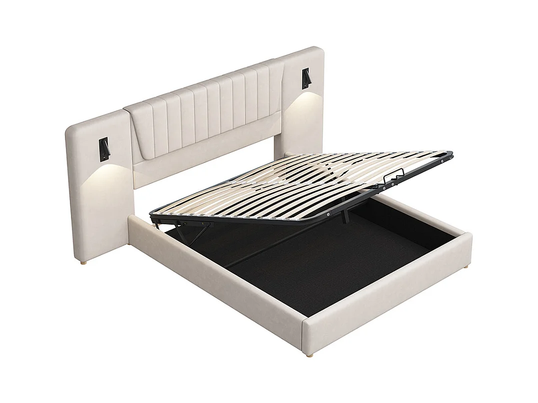 Lit double capitonné 180*200 cm, avec dossier allongé, liseuse, port de charge USB, tissu velours, beige