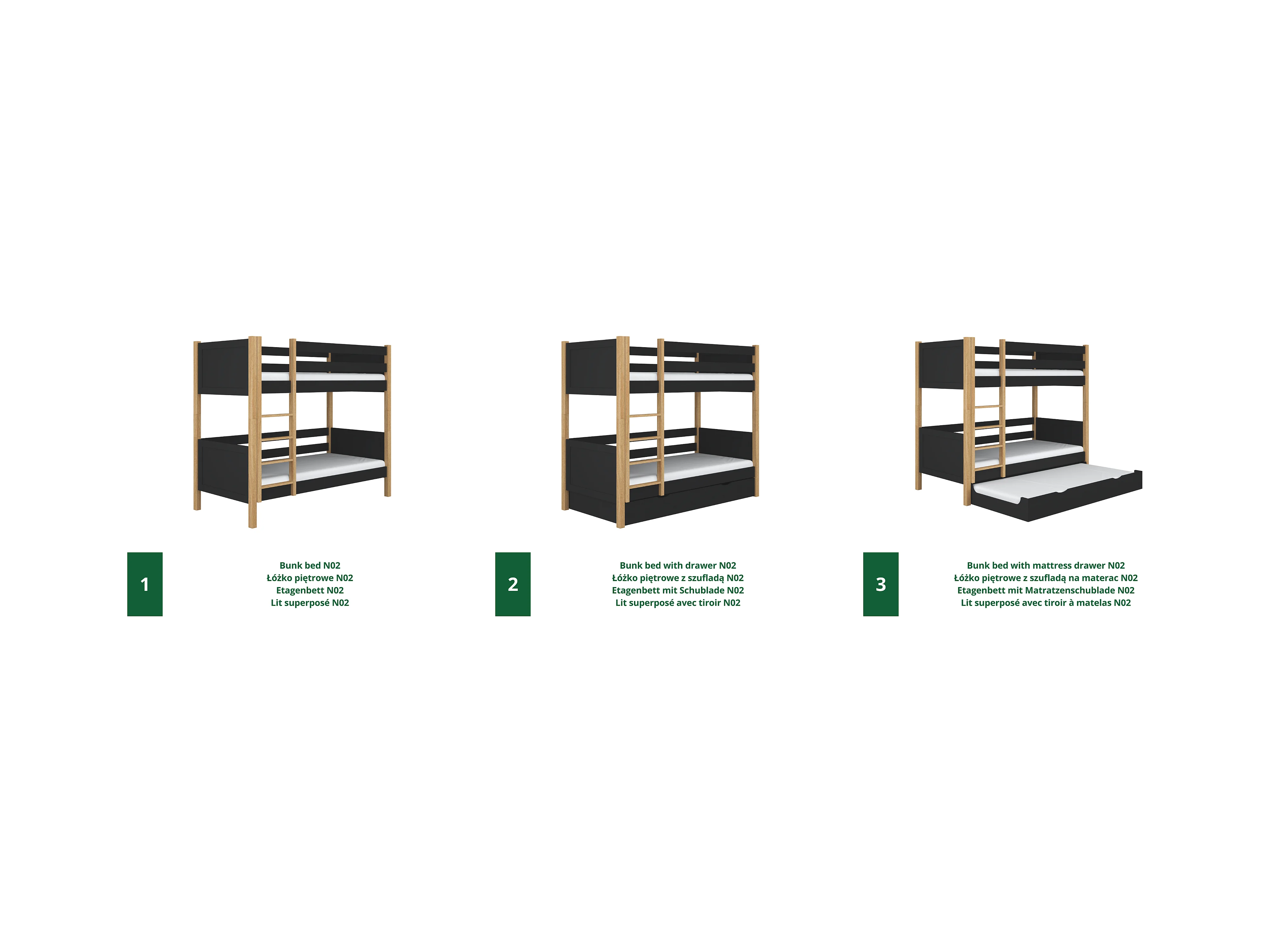 ETAGENBETT N02 mit Matratzenschublade Schwarz / Eiche Natur 90x180
