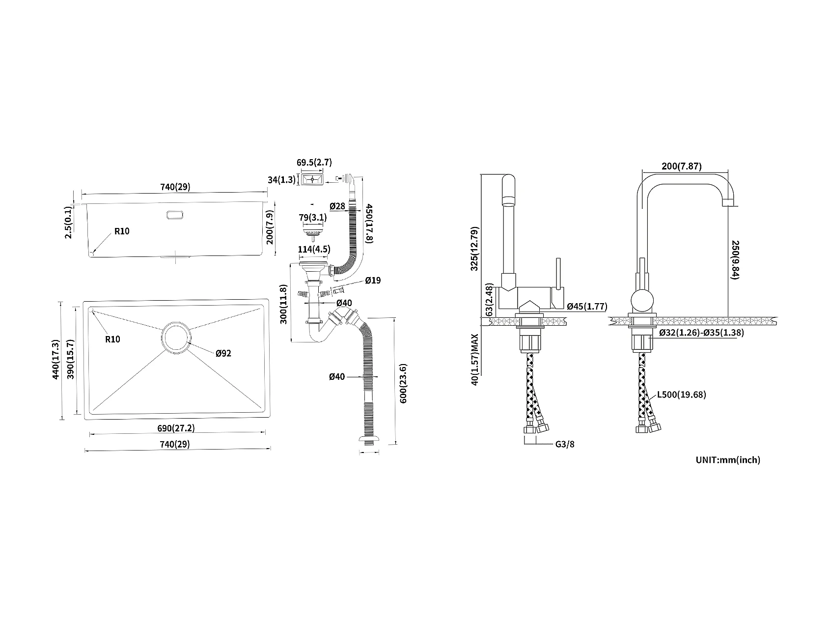 Lonheo Max Einzelbecken Küchenspüle 74*44*20CM, Gebürsteter Edelstahl mit Siphon und Überlauf + Ausziehbarer Brause Küchenarmatur Dunkelgrau 360° Drehbar