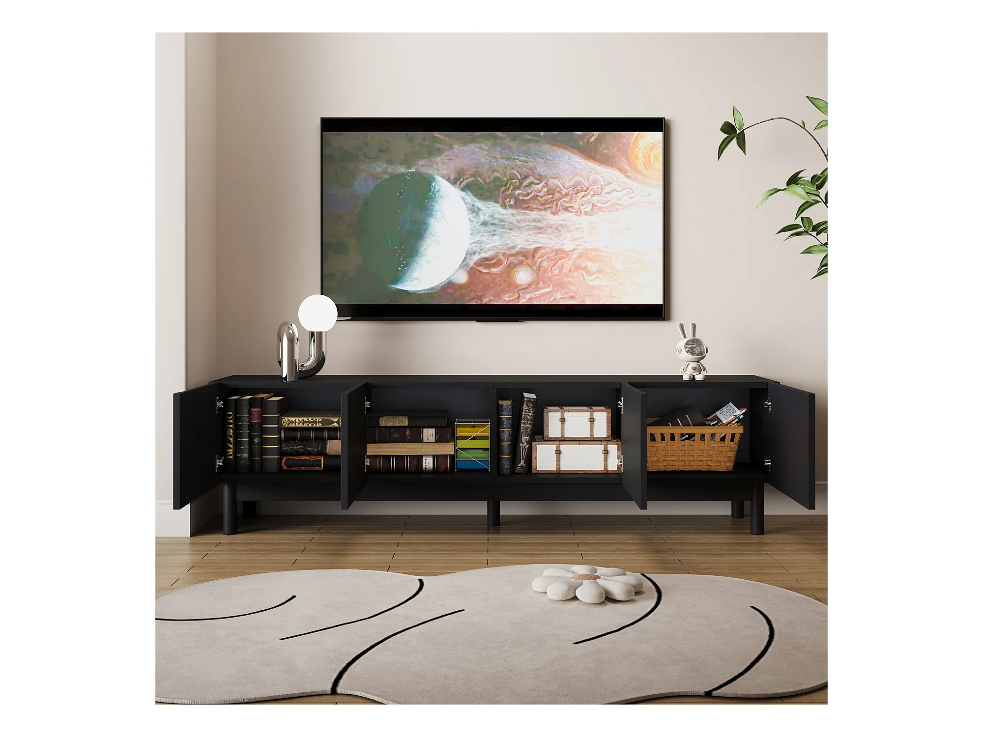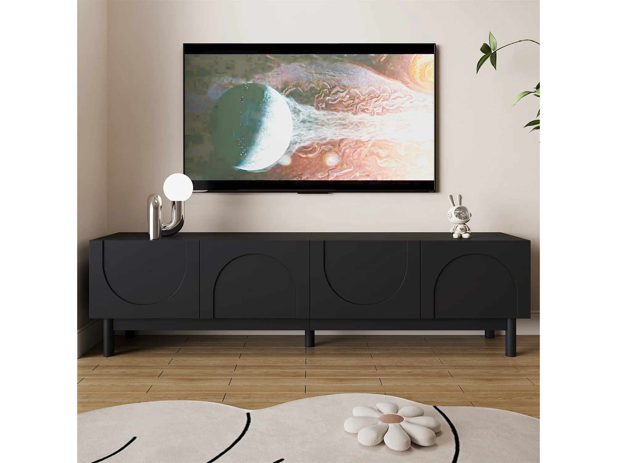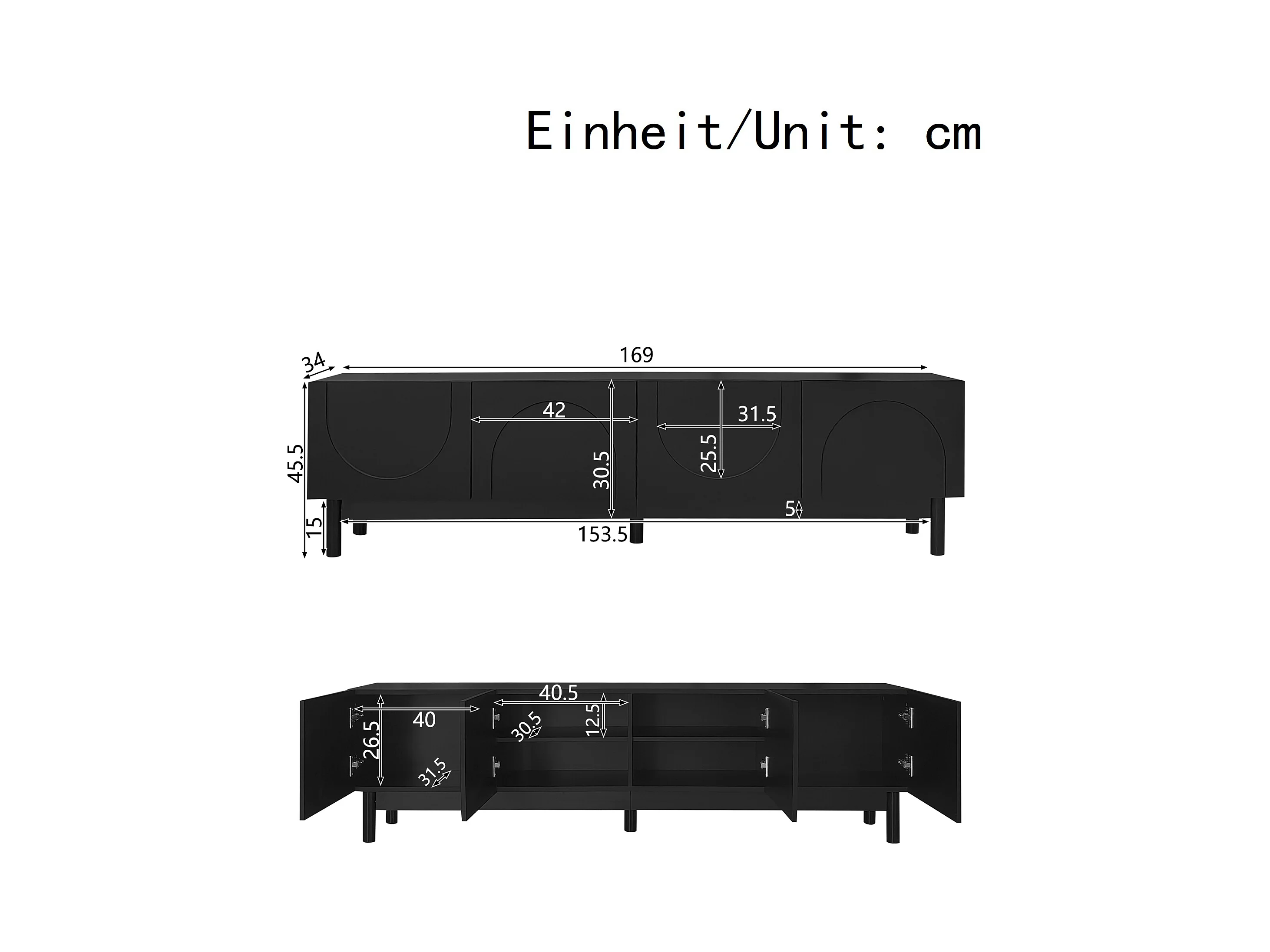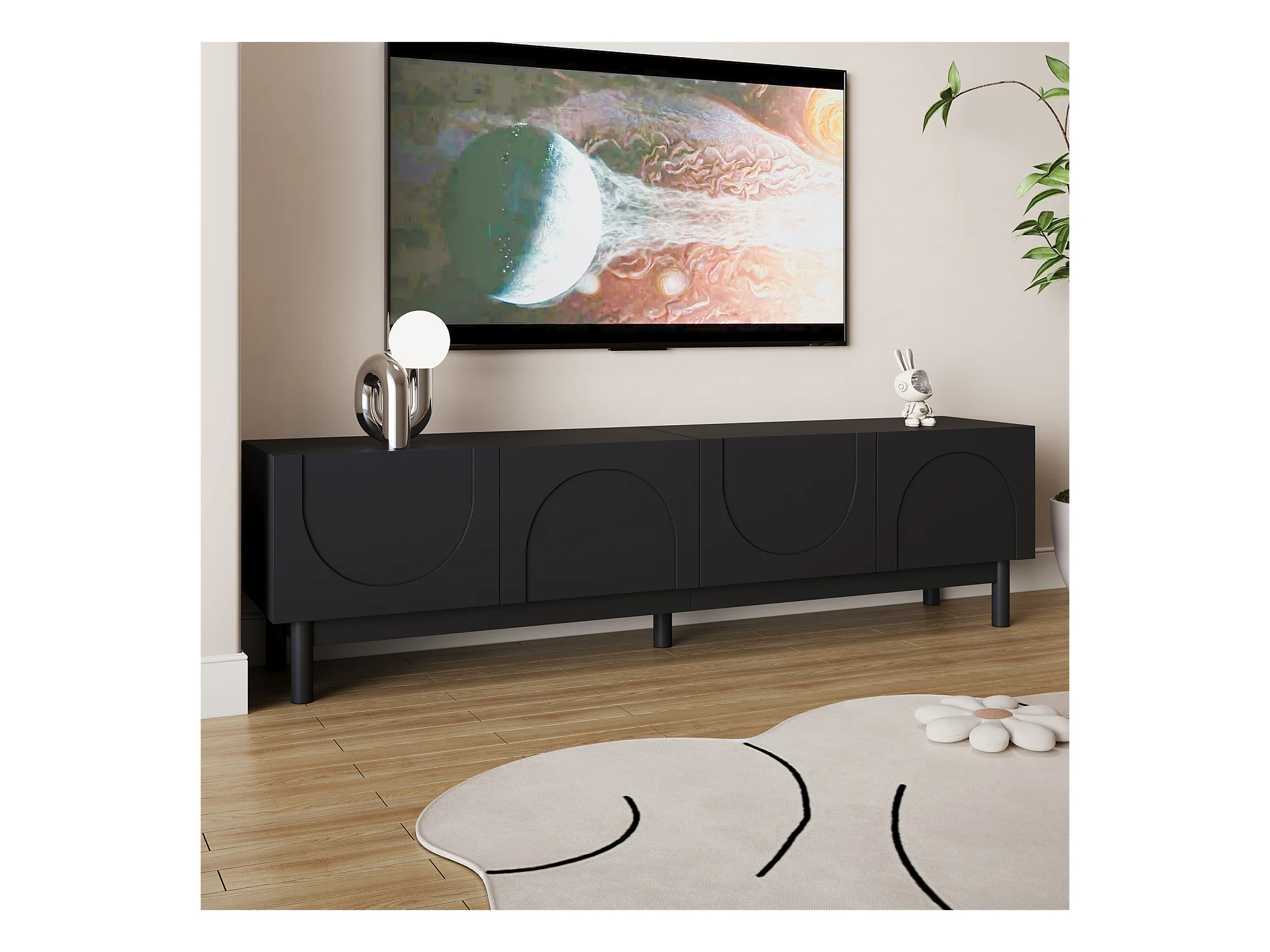 Lowboard mit gewölbten, wellenförmigen Türen, Regalen und stabilen Beinen. Stilvoller TV-Schrank & TV-Ständer.