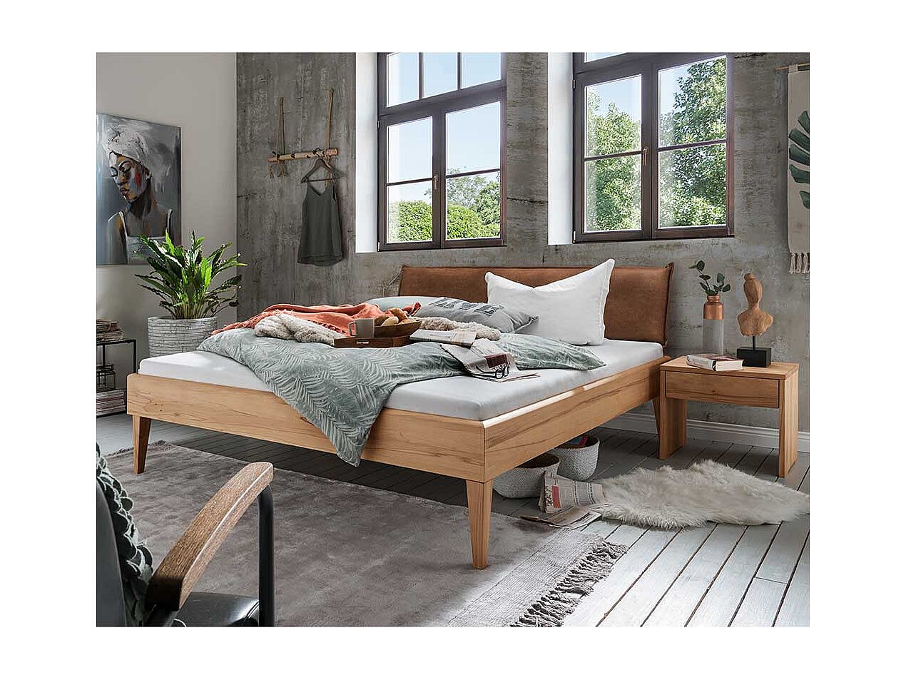 Massivbett Wildeiche mit zwei Nachtkommoden Polsterkopfteil (dreiteilig)