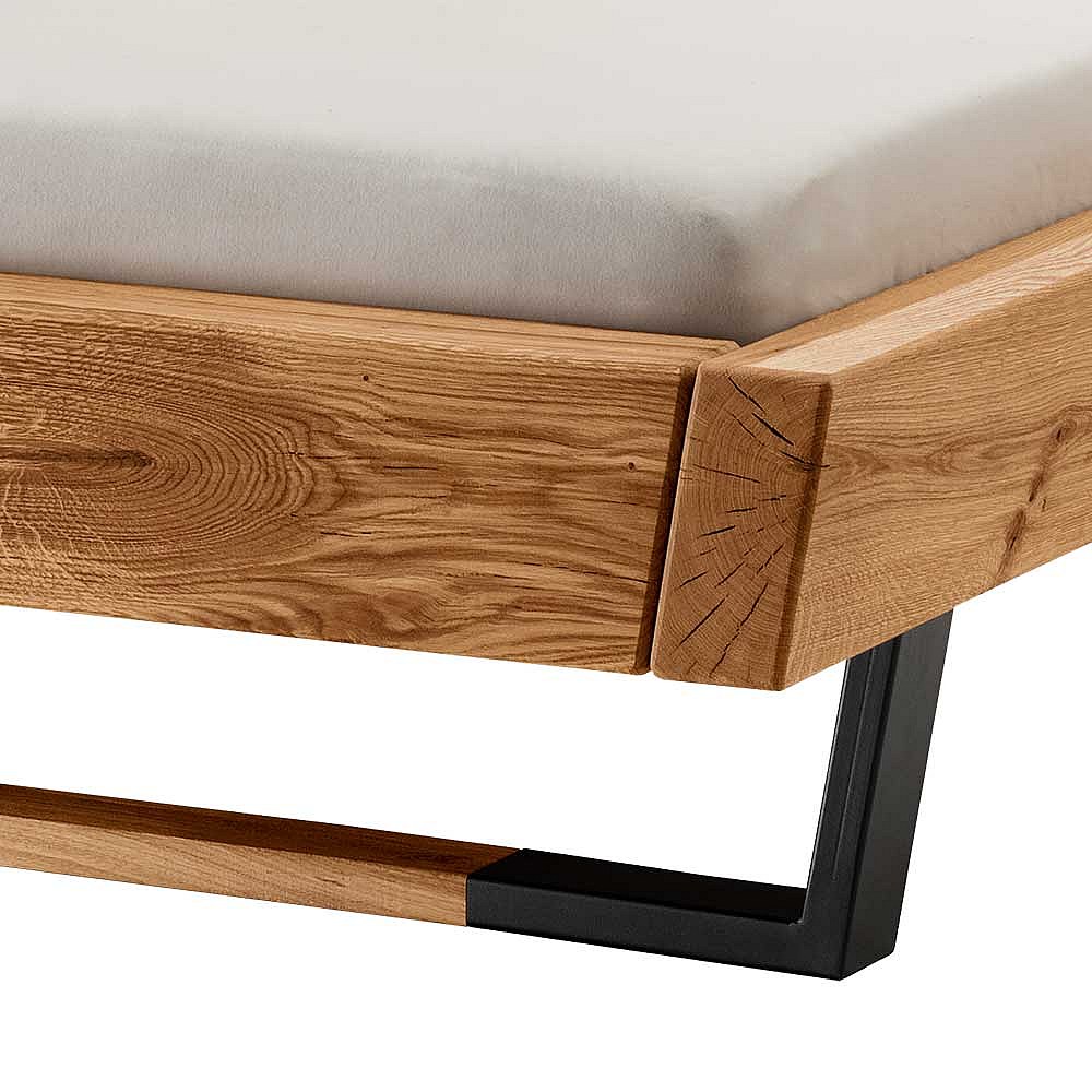 Massives Balkenbett im Industry und Loft Stil Wildeiche und Metall