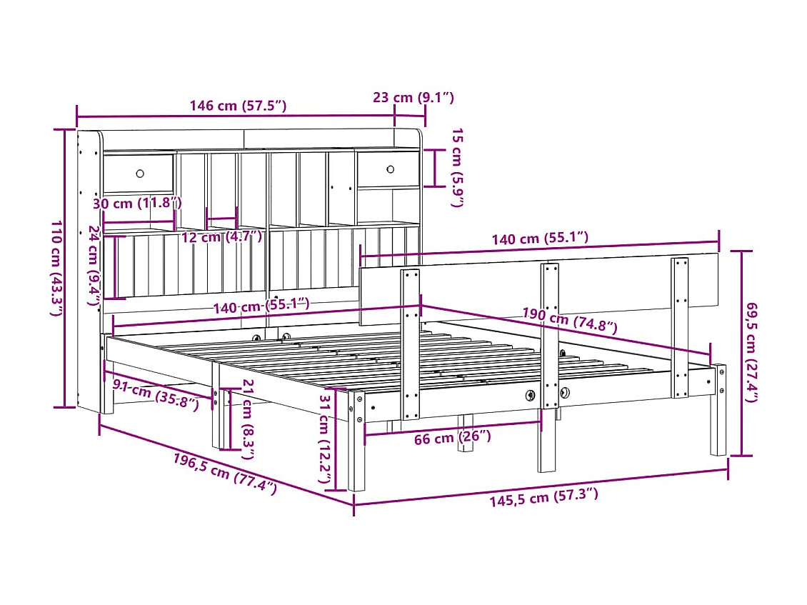 Massivholzbett mit Regal ohne Matratze Weiß 140x190 cm Kiefer