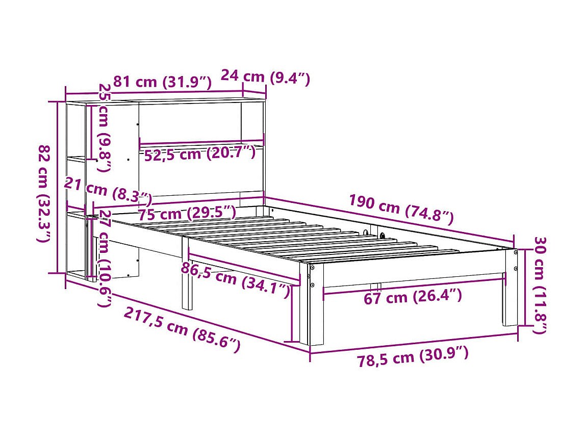 Massivholzbett mit Regal ohne Matratze Weiß 75x190 cm Kiefer