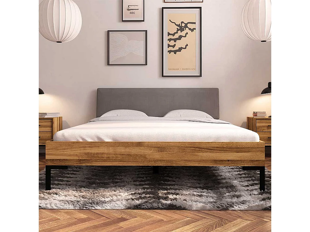 Massivholzbett Wildeiche geölt mit Polsterkopfteil Grau