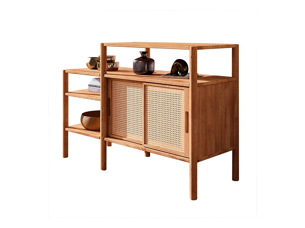 Massivholzregal mit Schiebetüren und Rattan Geflecht 120 cm breit