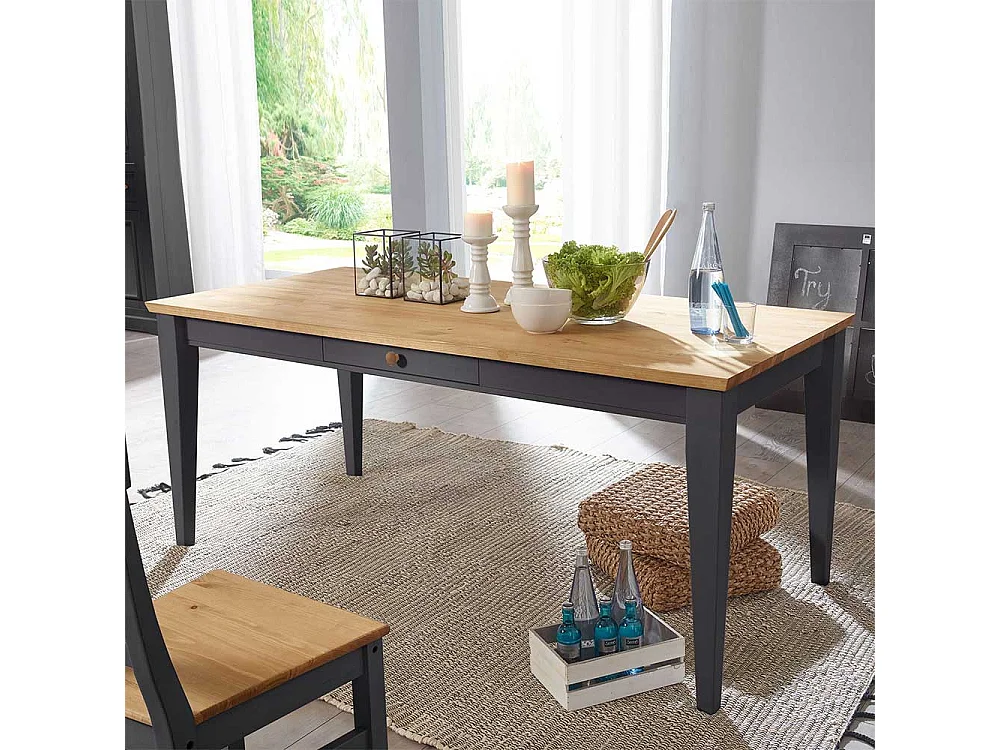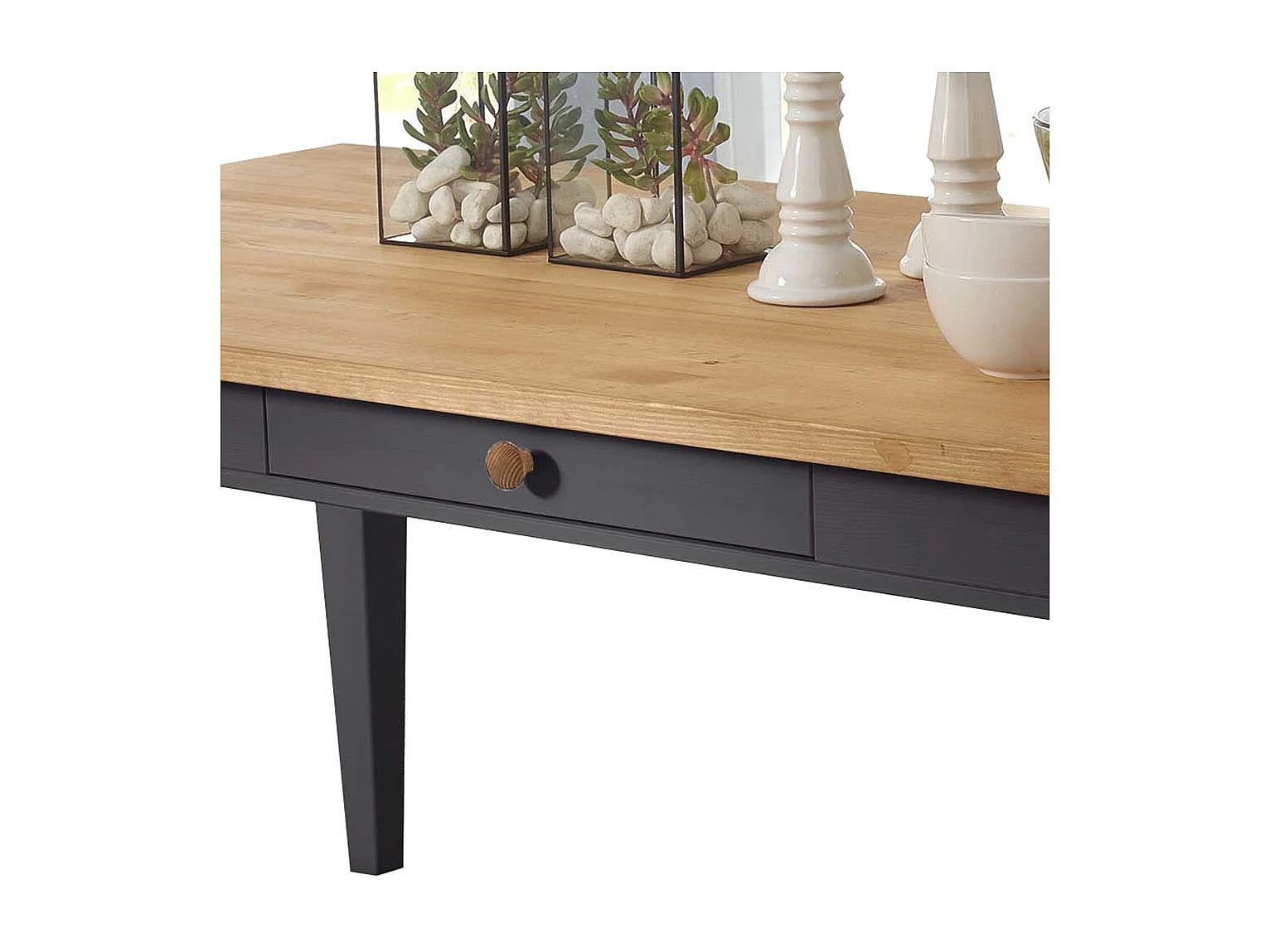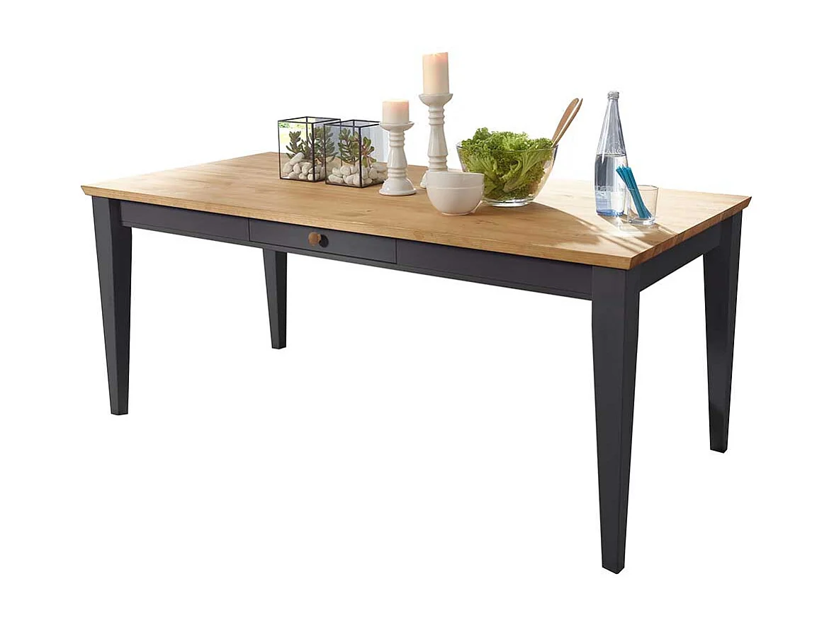 Massivholztisch in Grau und Eichefarben einer Schublade