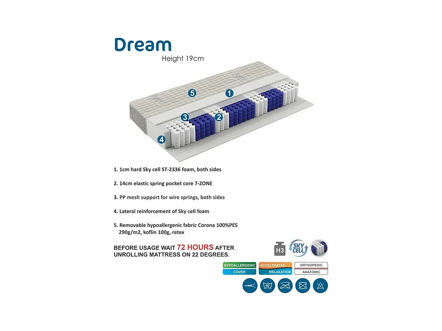 Matratze - 7 Zonen - 180x200 cm - Härtegrad 3 - Stärke 19 cm - DREAM