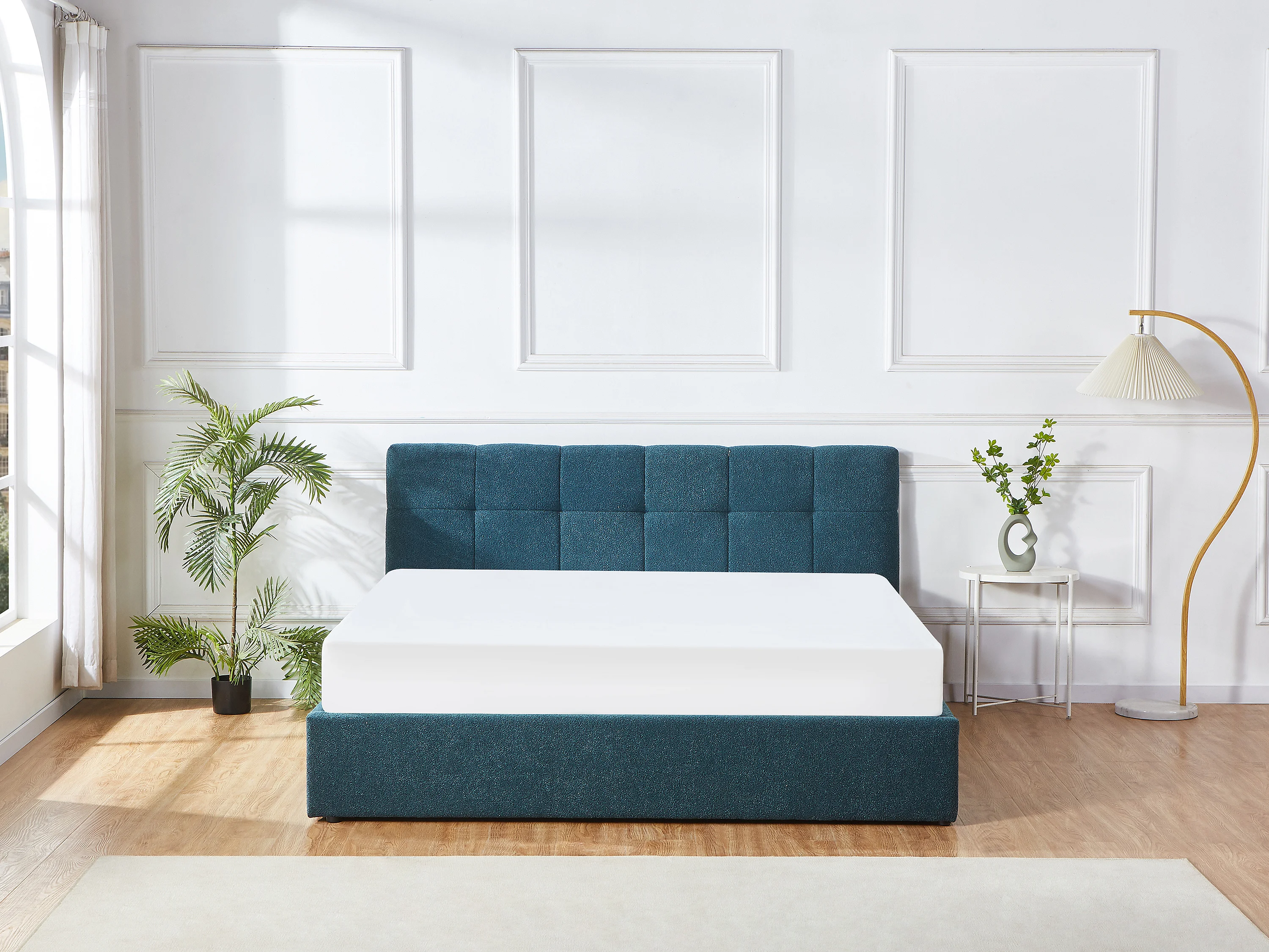Bett mit Bettkasten - 180 x 200 cm - Bouclé-Stoff - Entenblau + Matratze - MAZIRI