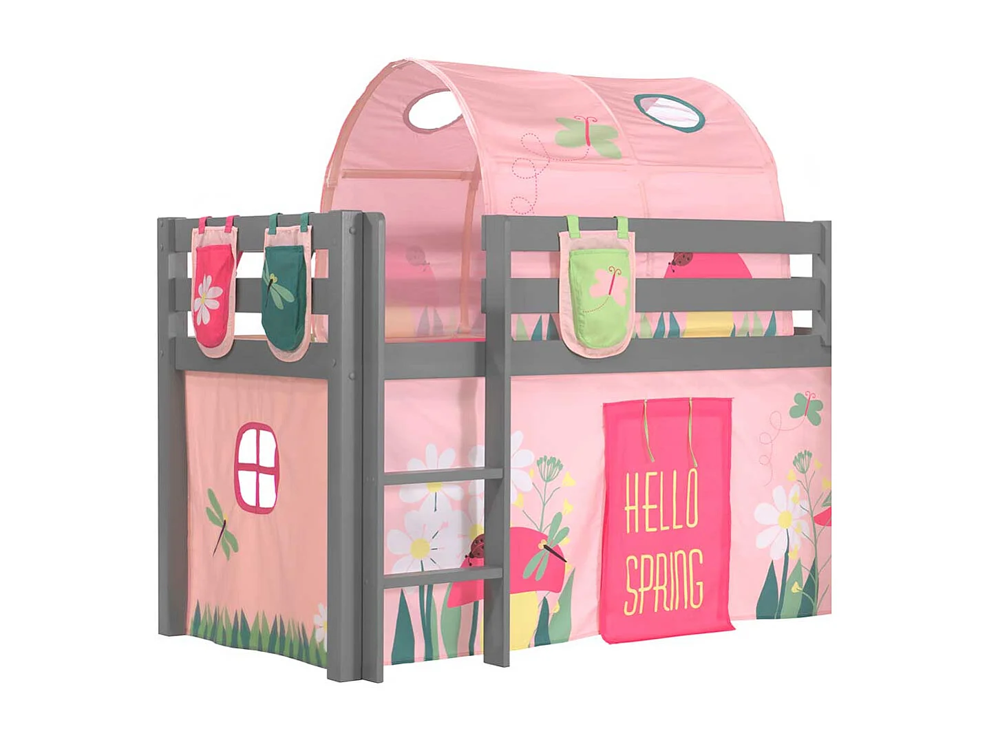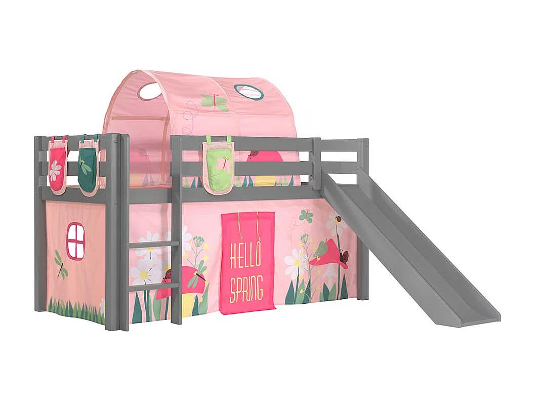 Mädchen Abenteuerbett in Grau Rosa Rutsche Stofftunnel und Vorhang