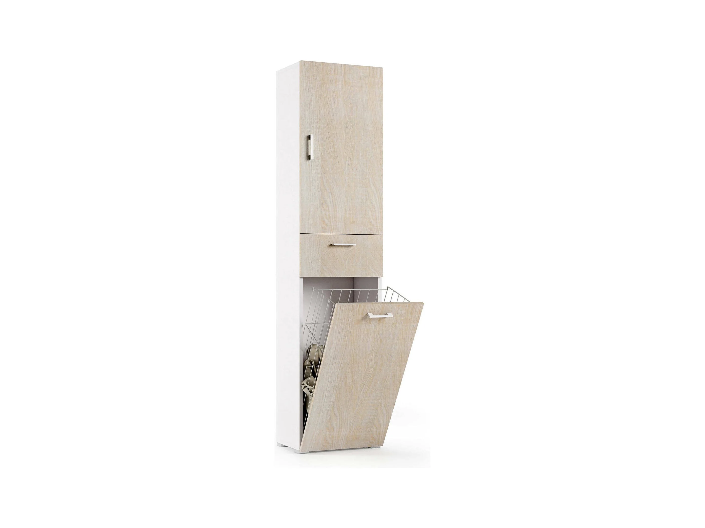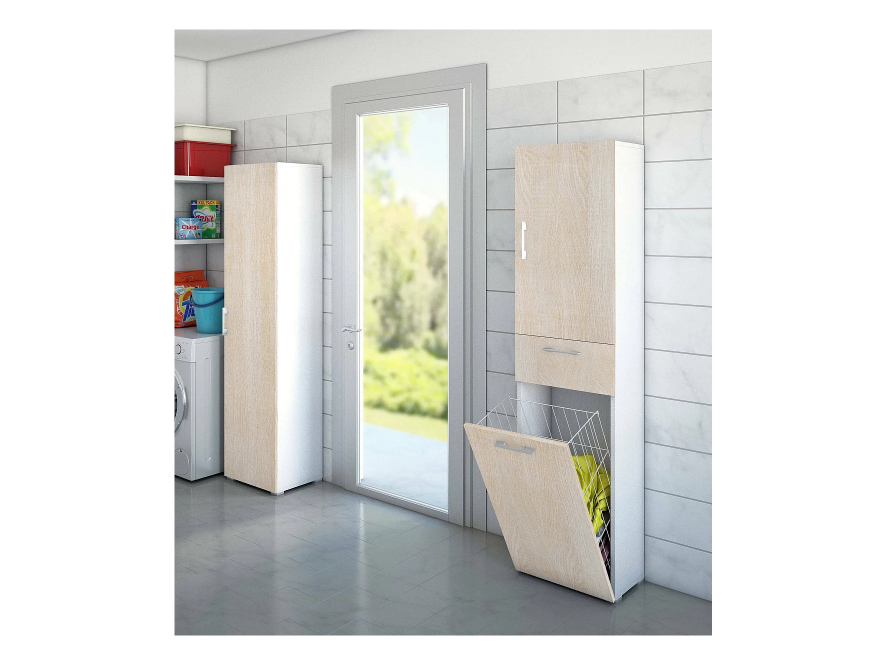 Mehrzweckschrank mit 2 Türen Escolzia, linearer Wäscheschrank mit 2 Türen, Badezimmersäule mit Wäschekorb, 100 % Made in Italy, 45 x 32 x 195 cm, Eiche und Weiß,