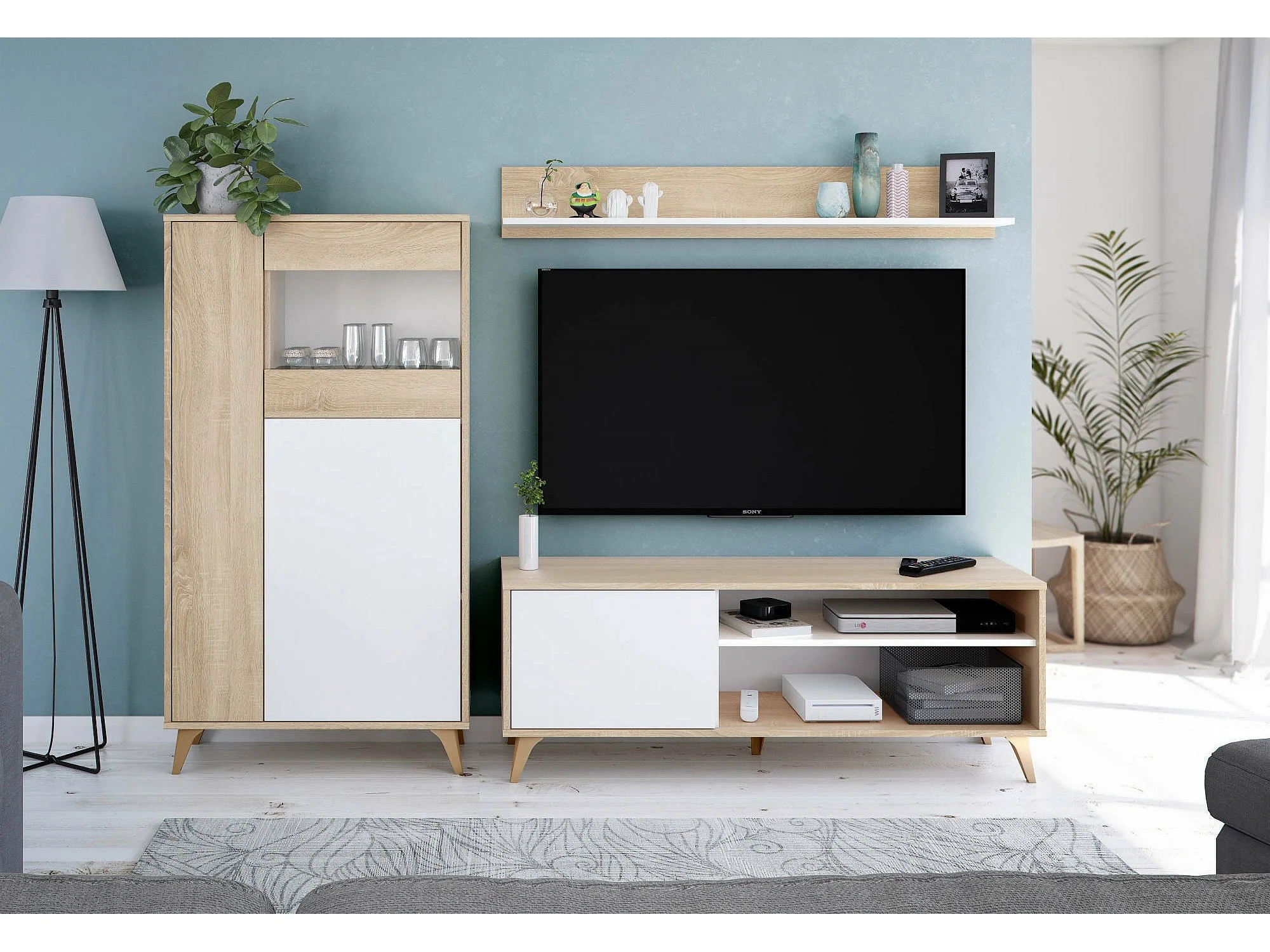 Mesa TV-Ständer, Sideboard für Wohnzimmerfernseher mit 1 Tür, Wohnzimmer-TV-Ständer, Design-Sideboard, 135x40h50 cm, Eiche