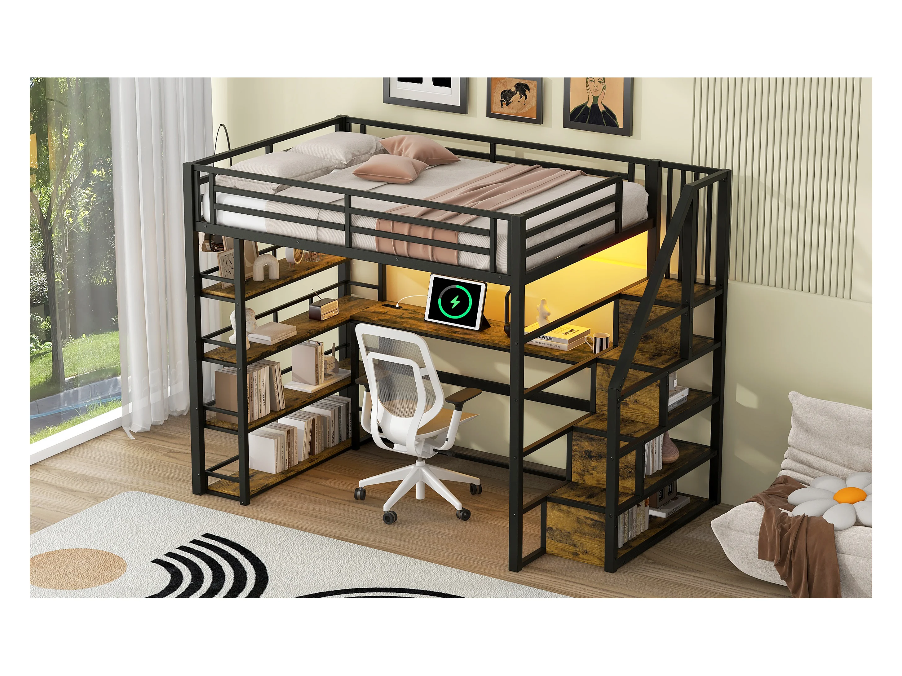 Metall-Hochbett – 140 x 200 cm – mit Stauraumtreppe + Schreibtisch + Regal + LEDs – MDF + Metall – Schwarz