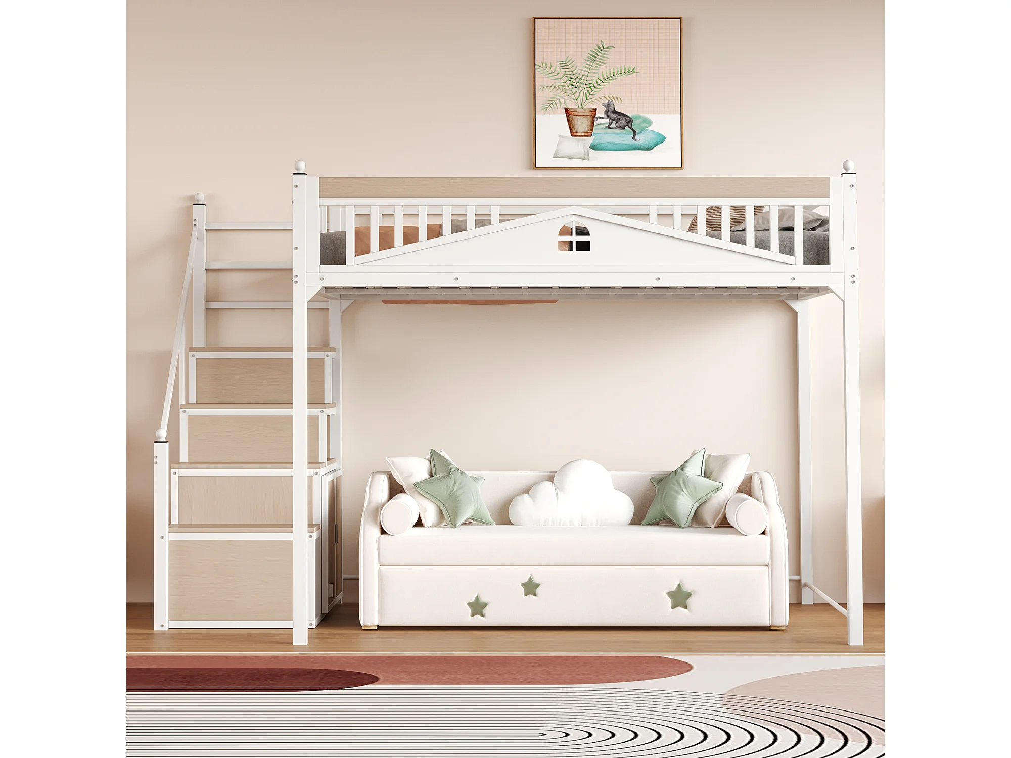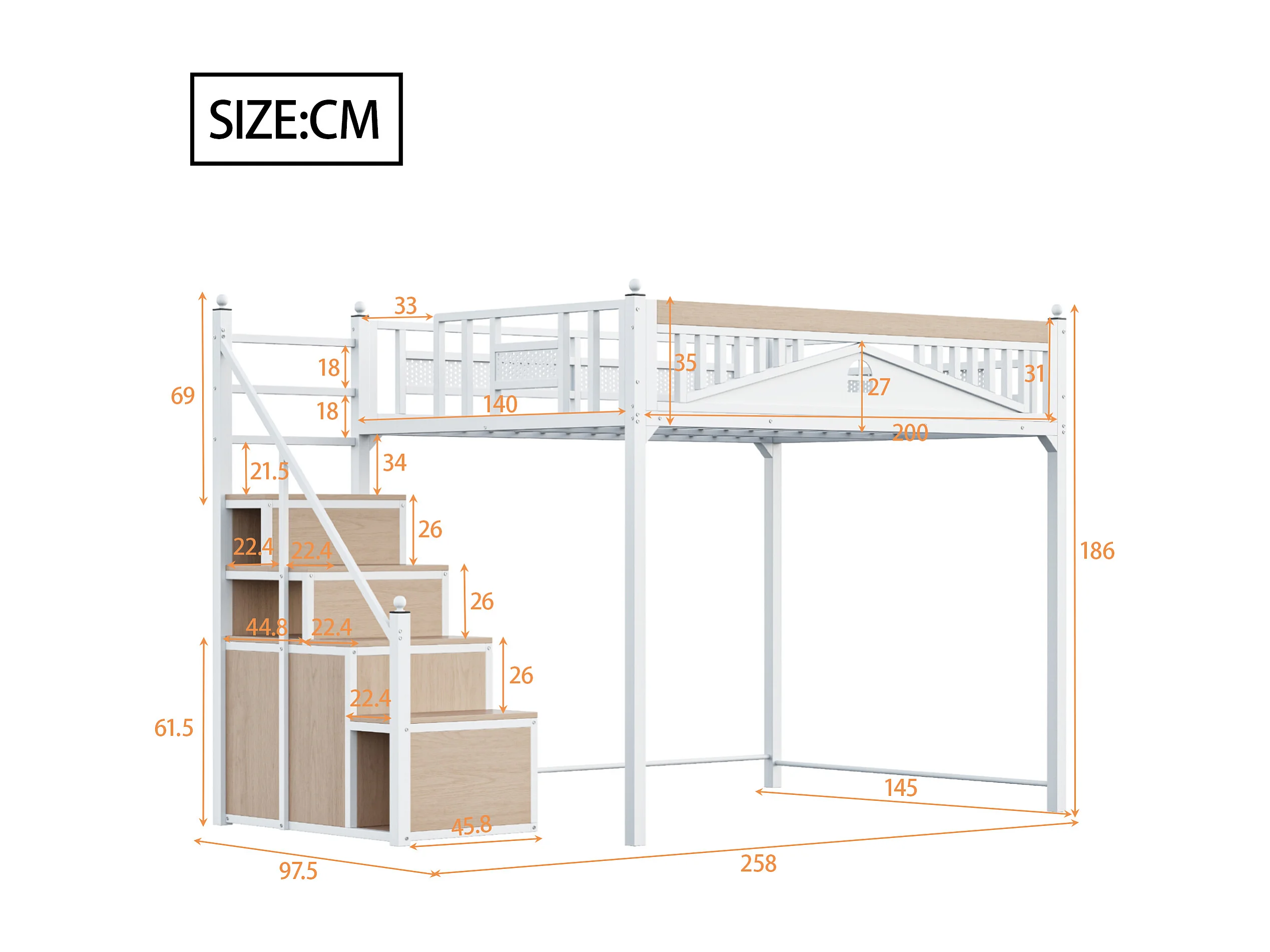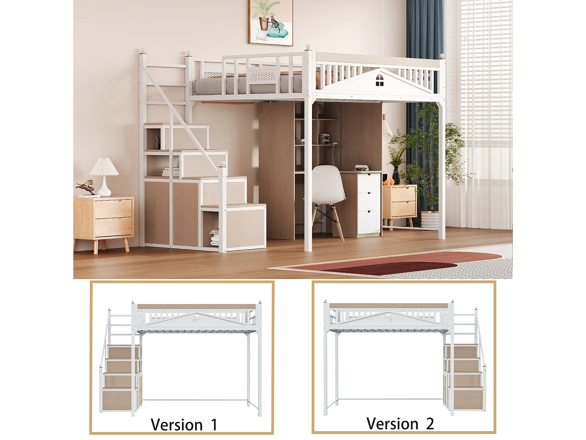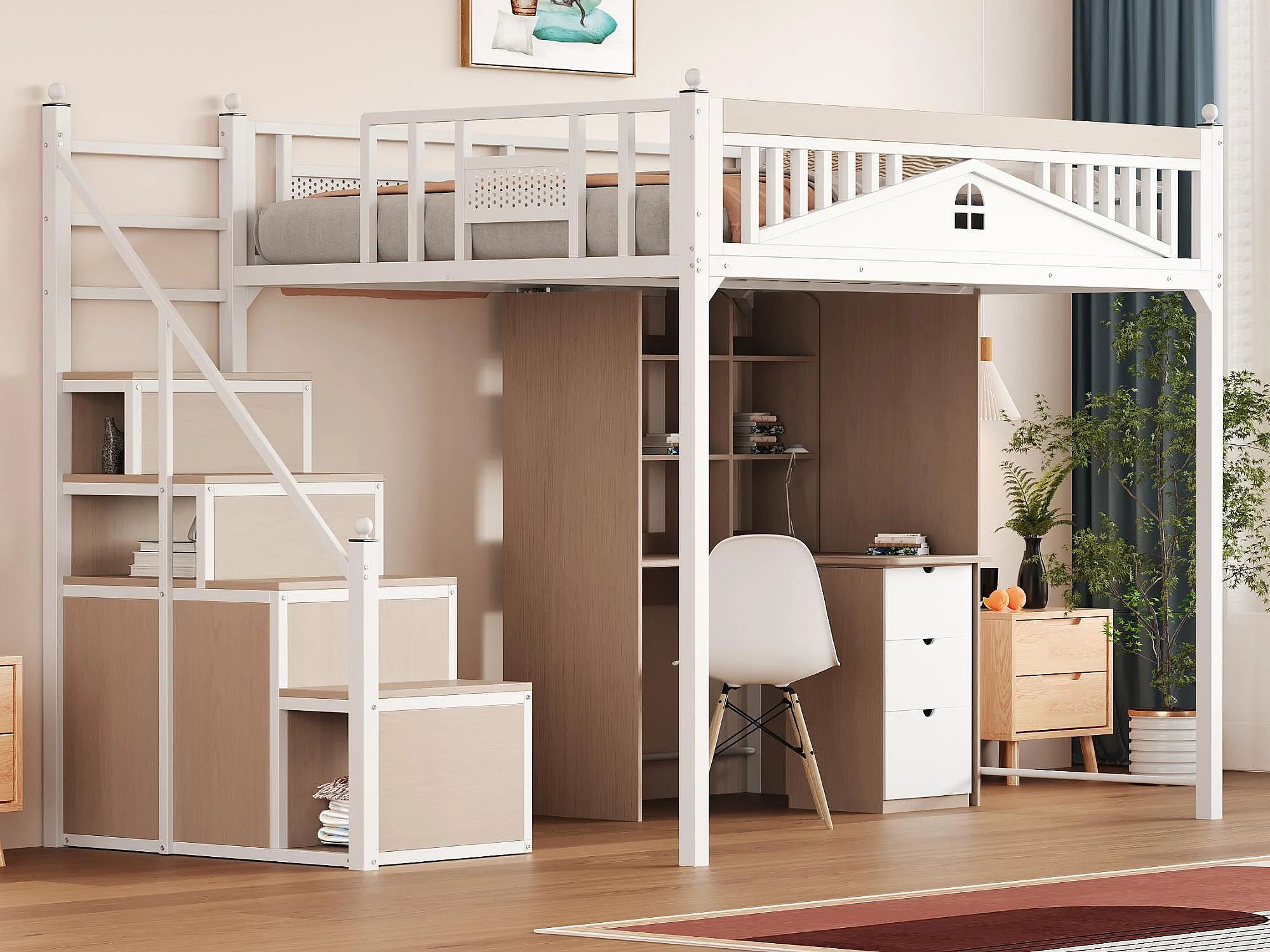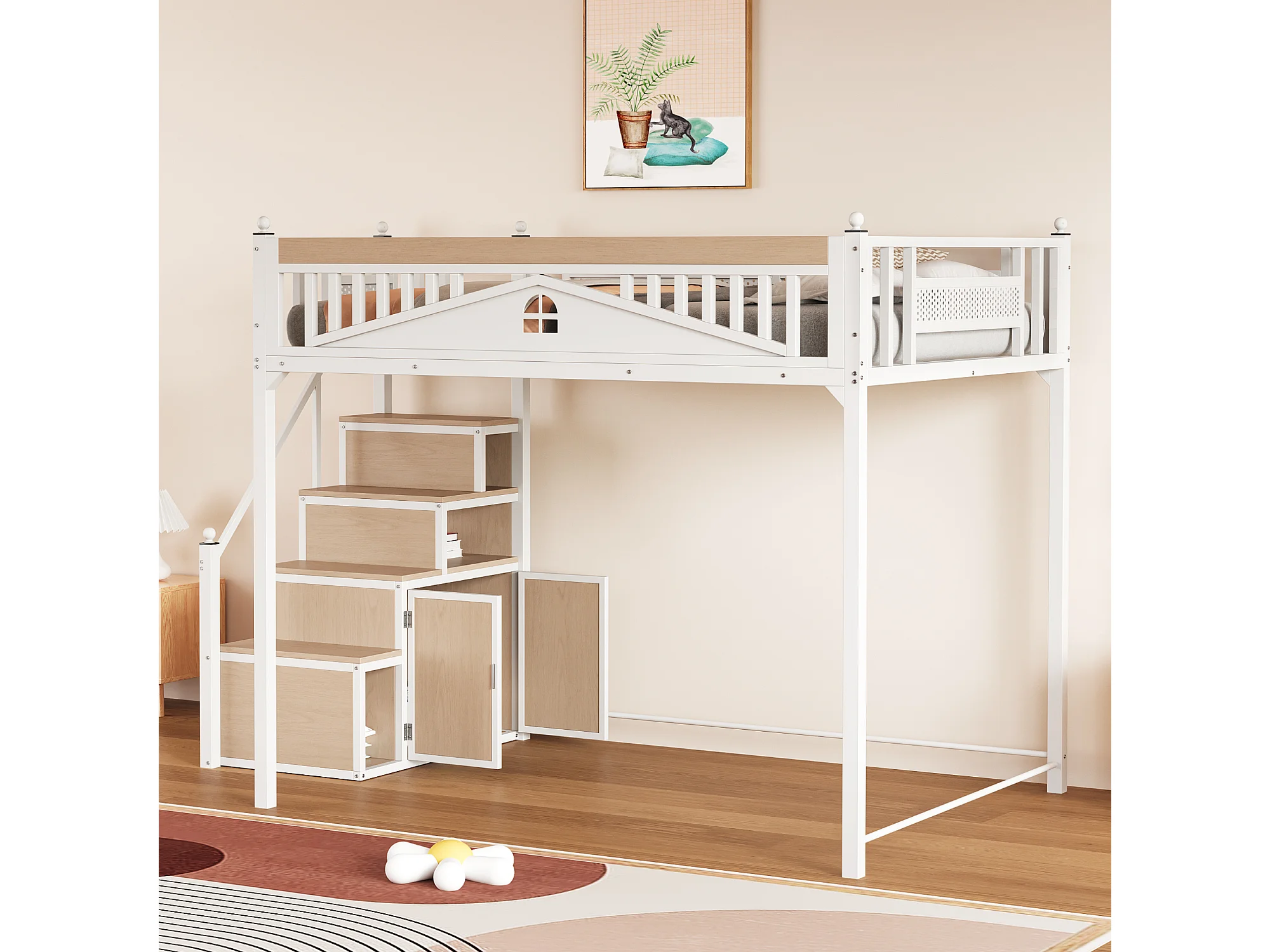 Metall-Hochbett 140x200 cm - mit Aufstiegsleiter mit Stauraum - Weiß (Matratze nicht inbegriffen)