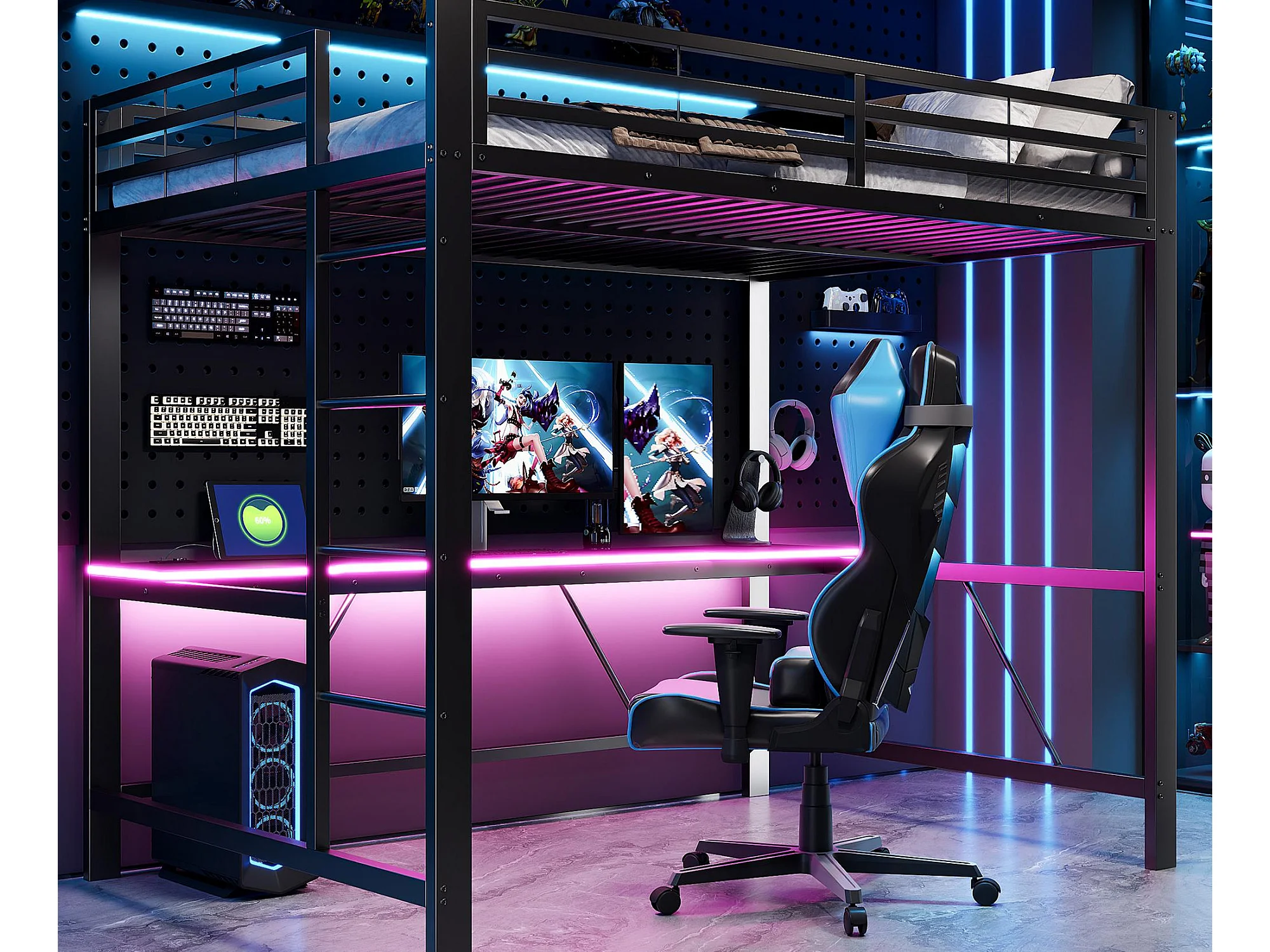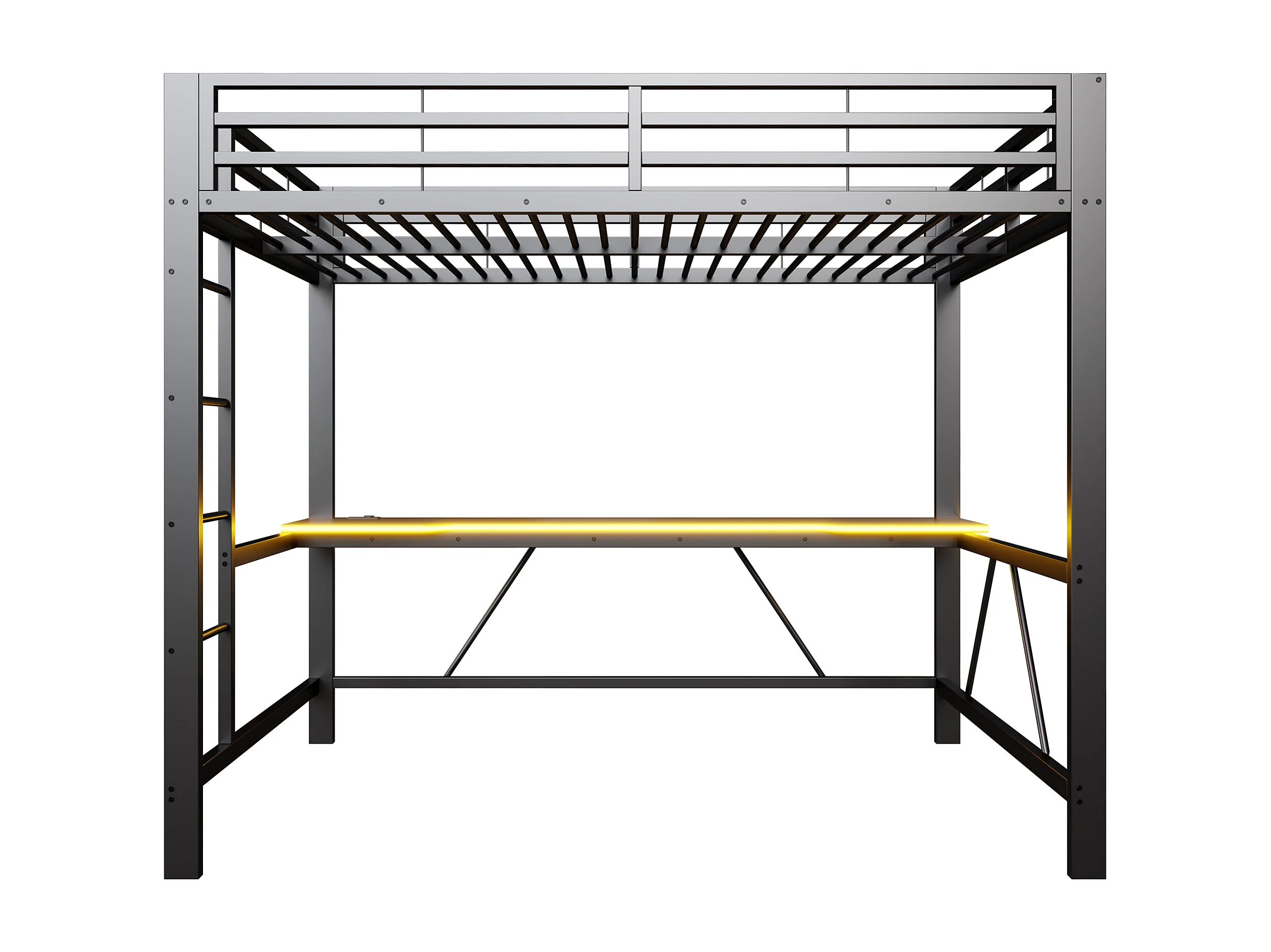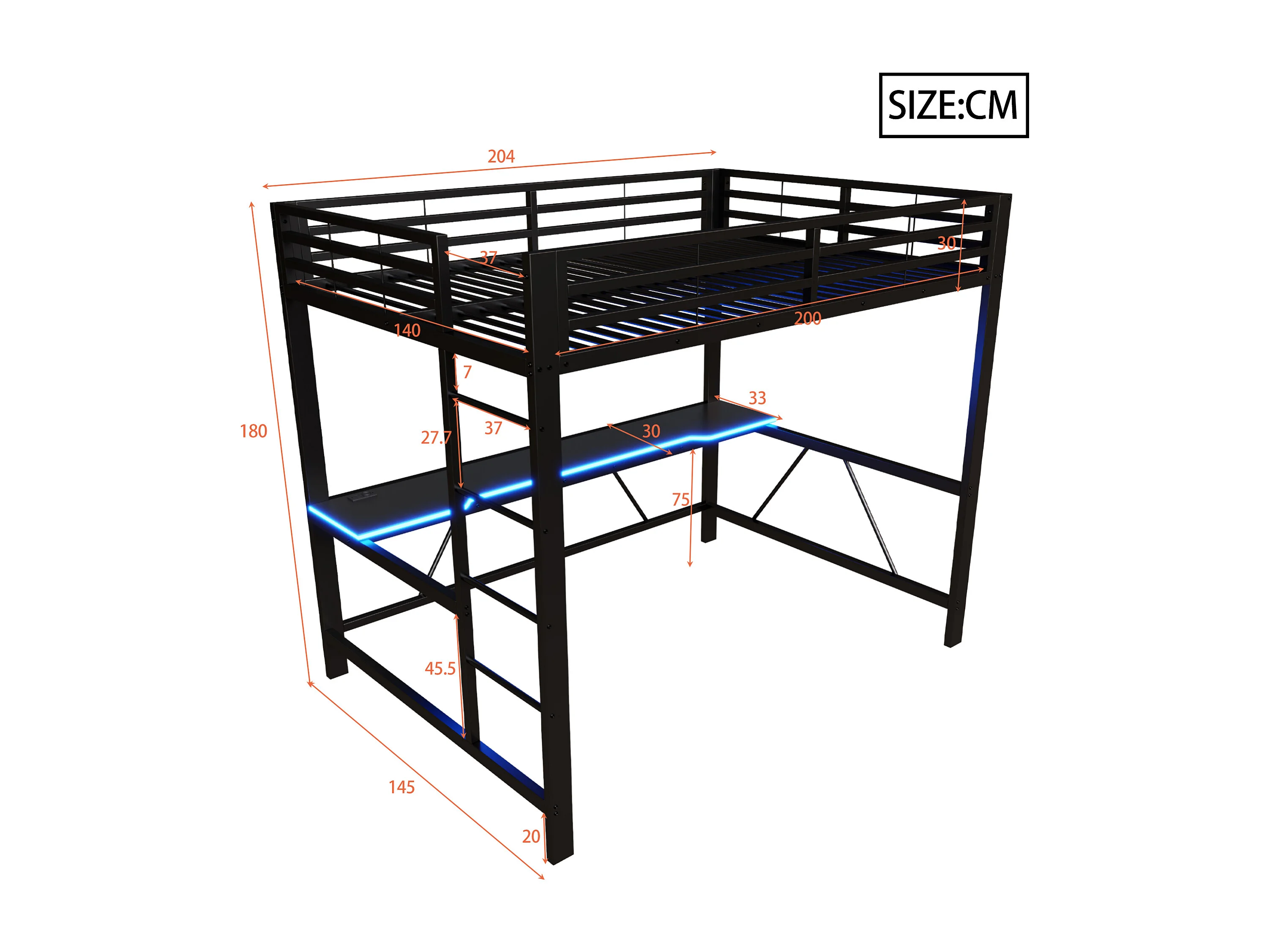Metall-Hochbett 140x200cm - mit Schreibtisch - mit LED-Beleuchtung und USB-Ladeanschluss - Schwarz​ (ohne Matratze)