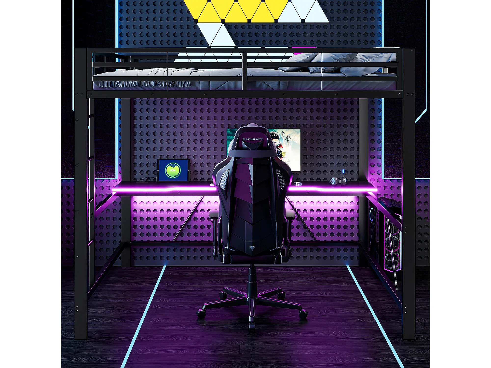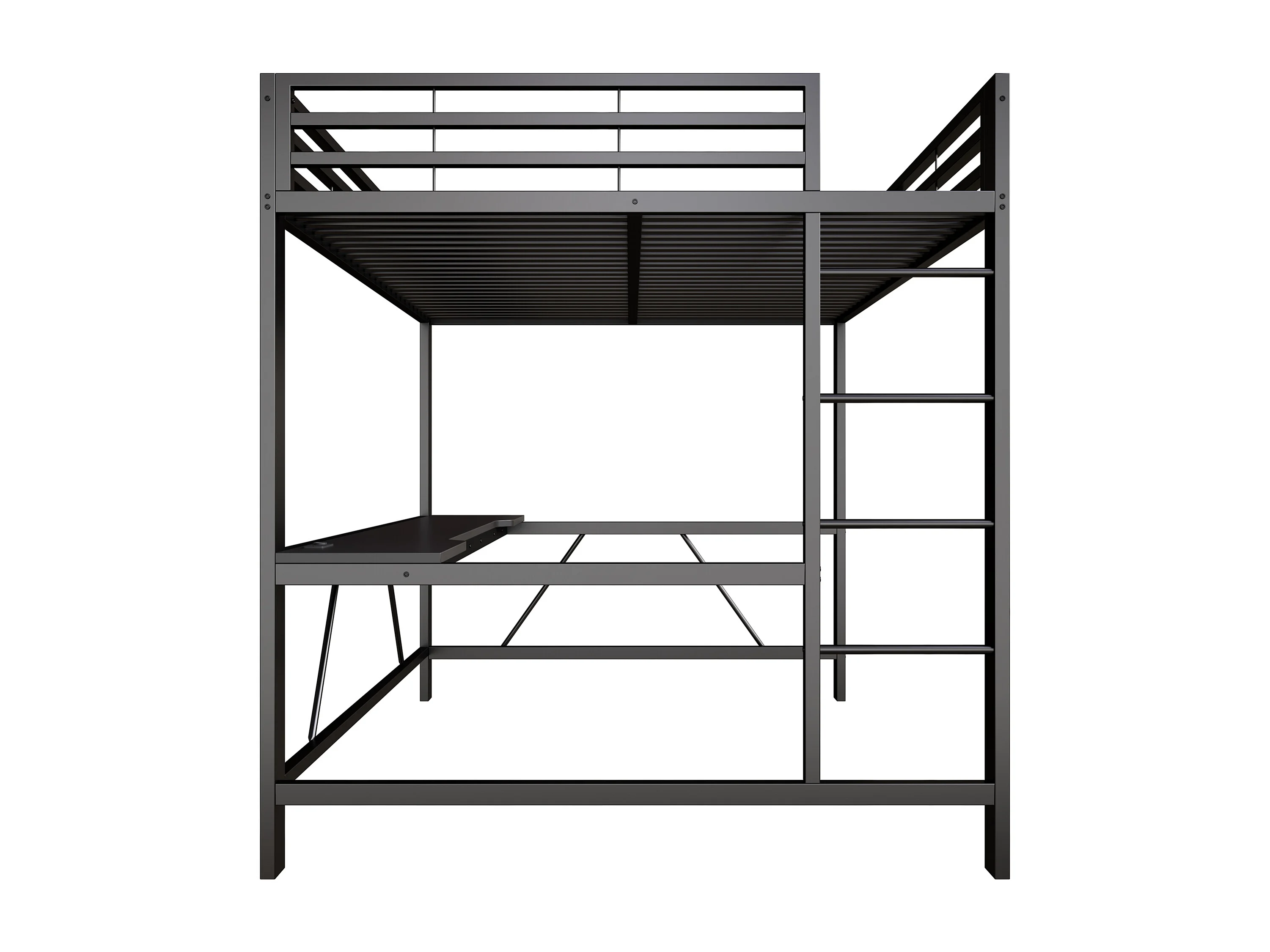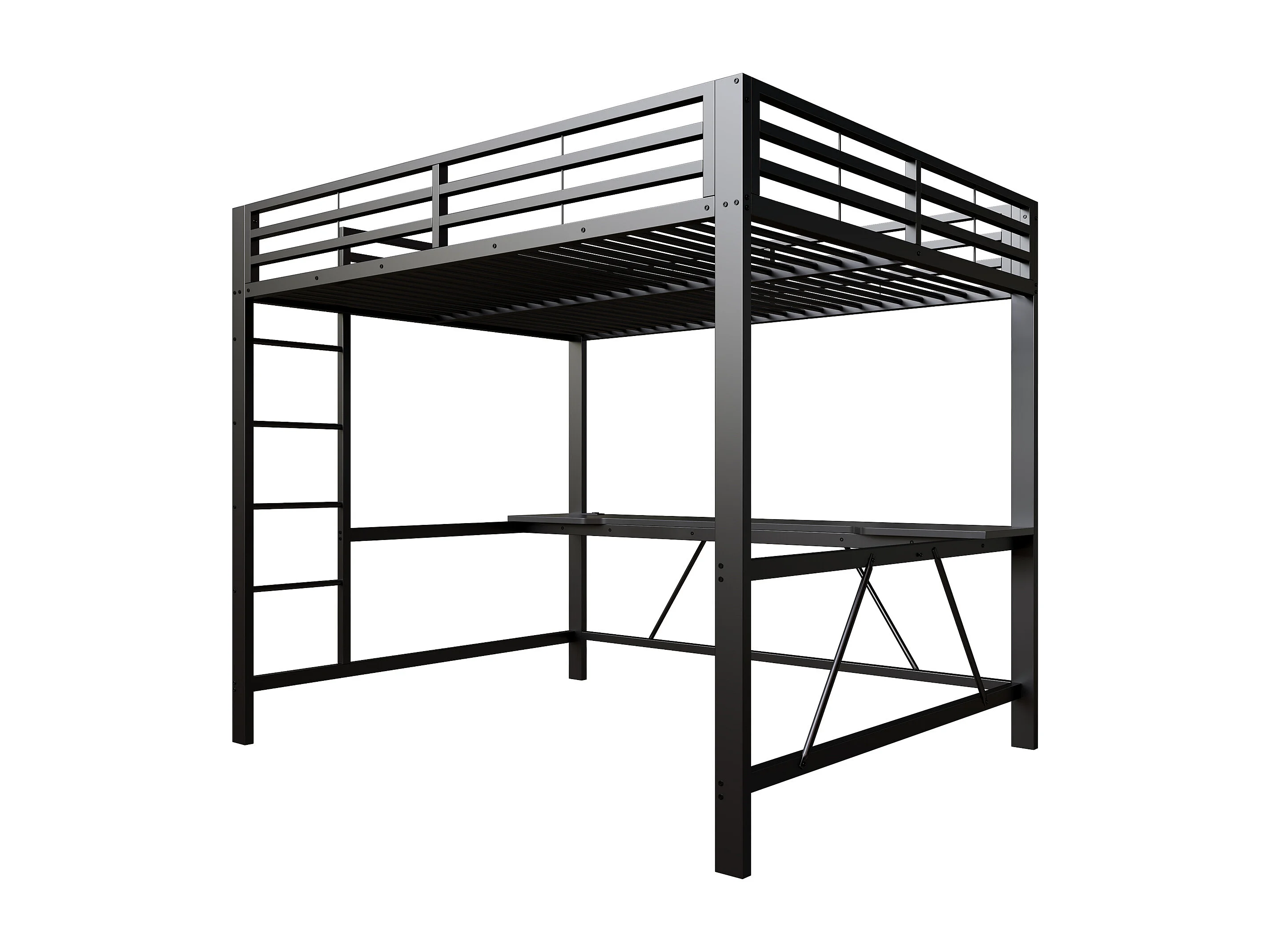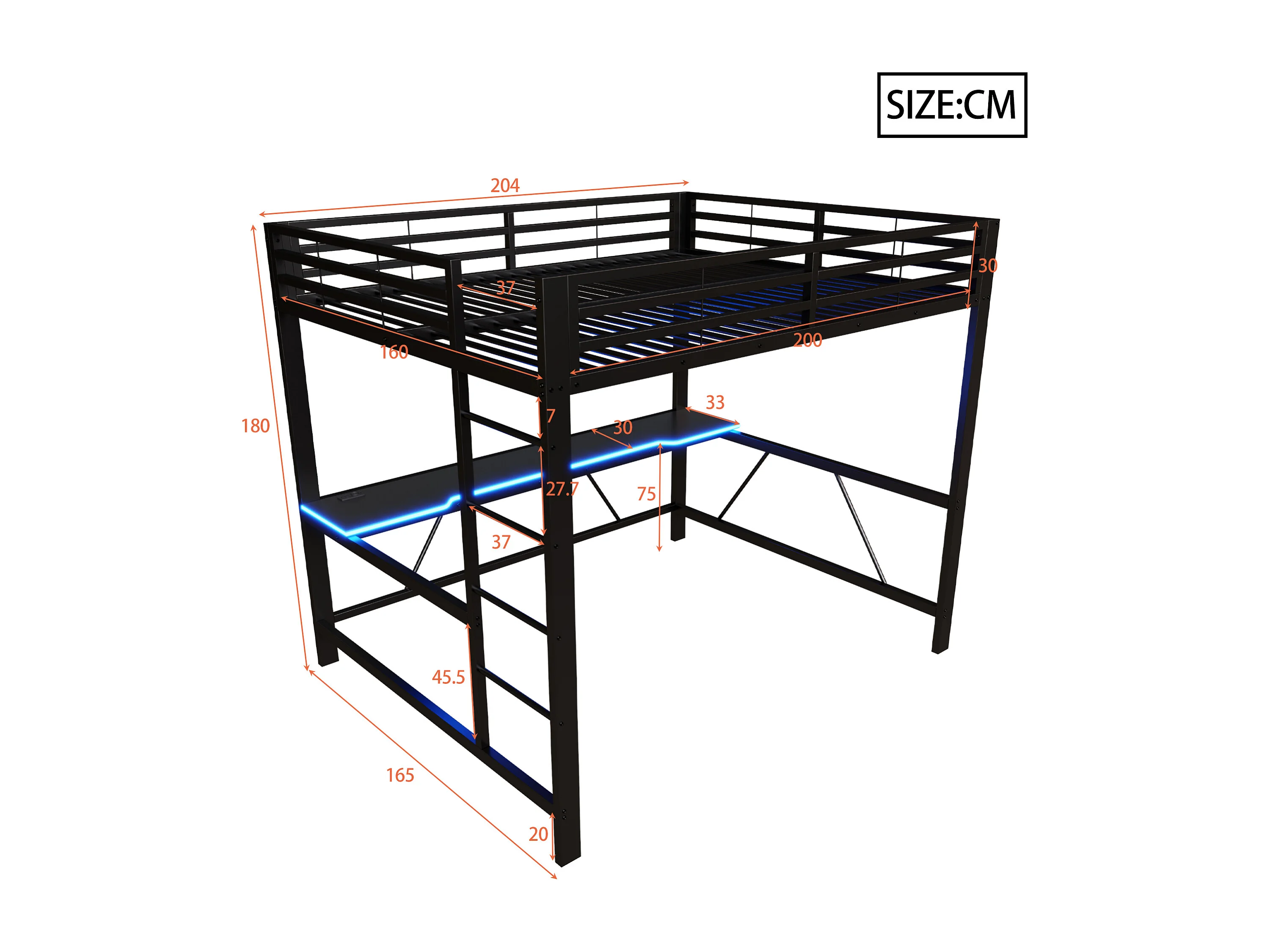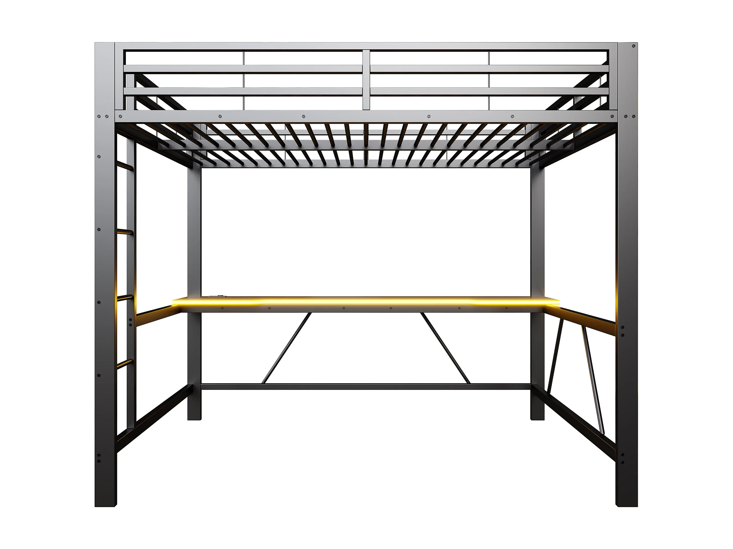 Metall-Hochbett 160x200cm - mit Schreibtisch - mit LED-Beleuchtung und USB-Ladeanschluss - Schwarz​ (ohne Matratze)