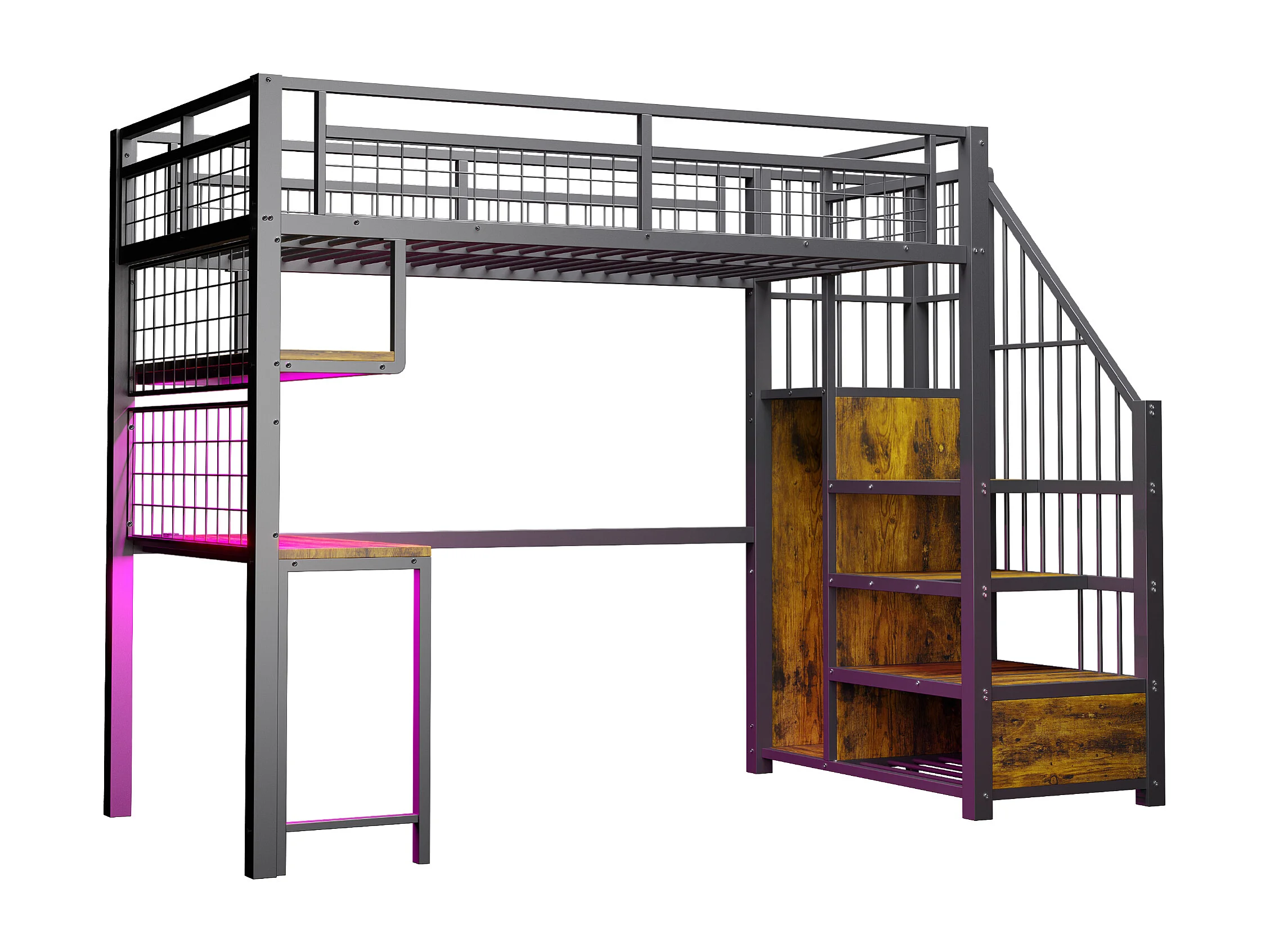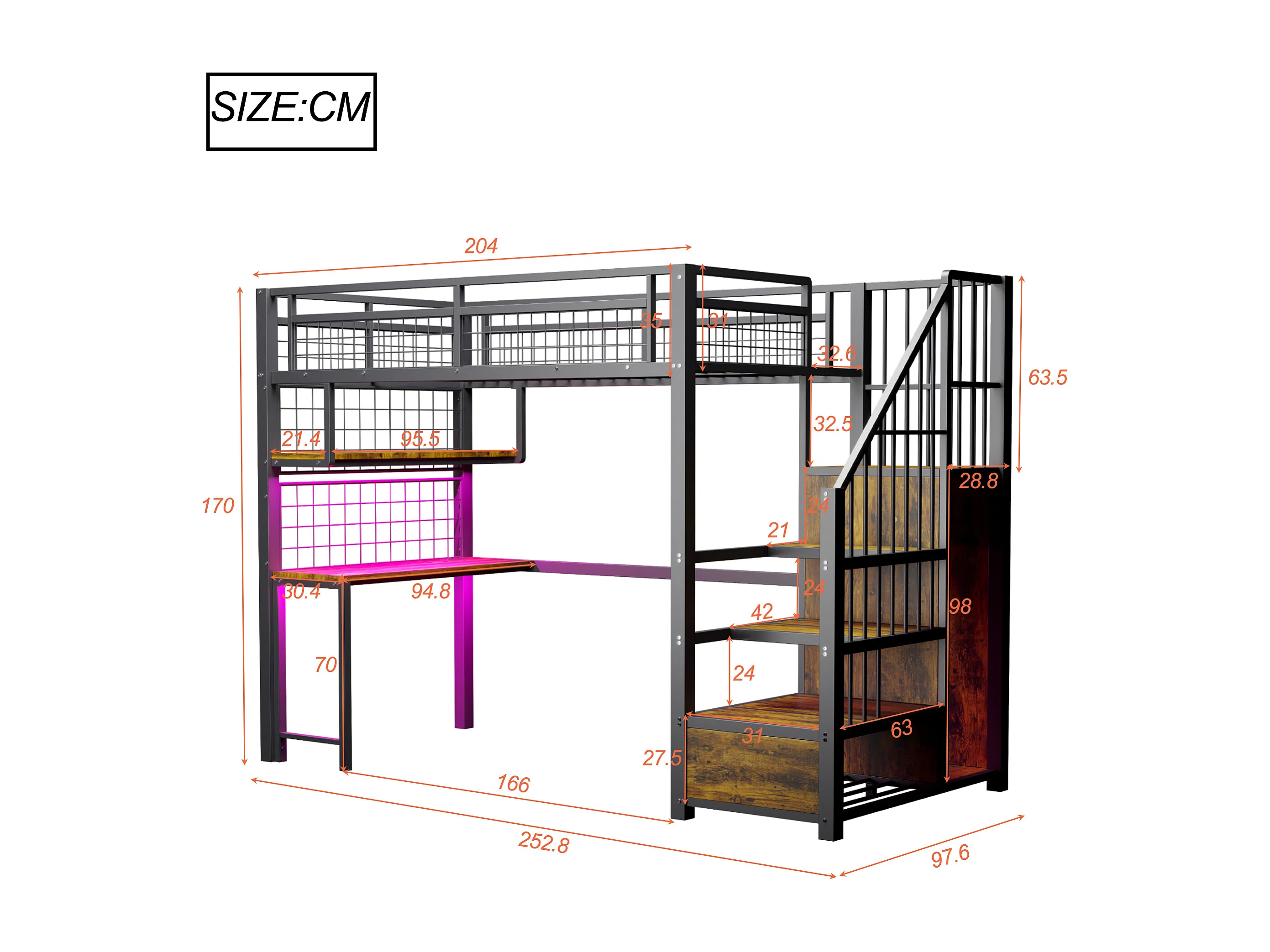 Metall-Hochbett 90x200 cm - mit LED-Beleuchtung und Ladestation - beinhaltet Aufstiegsleiter mit Stauraum - mit Regalen und Schreibtisch - schwarz