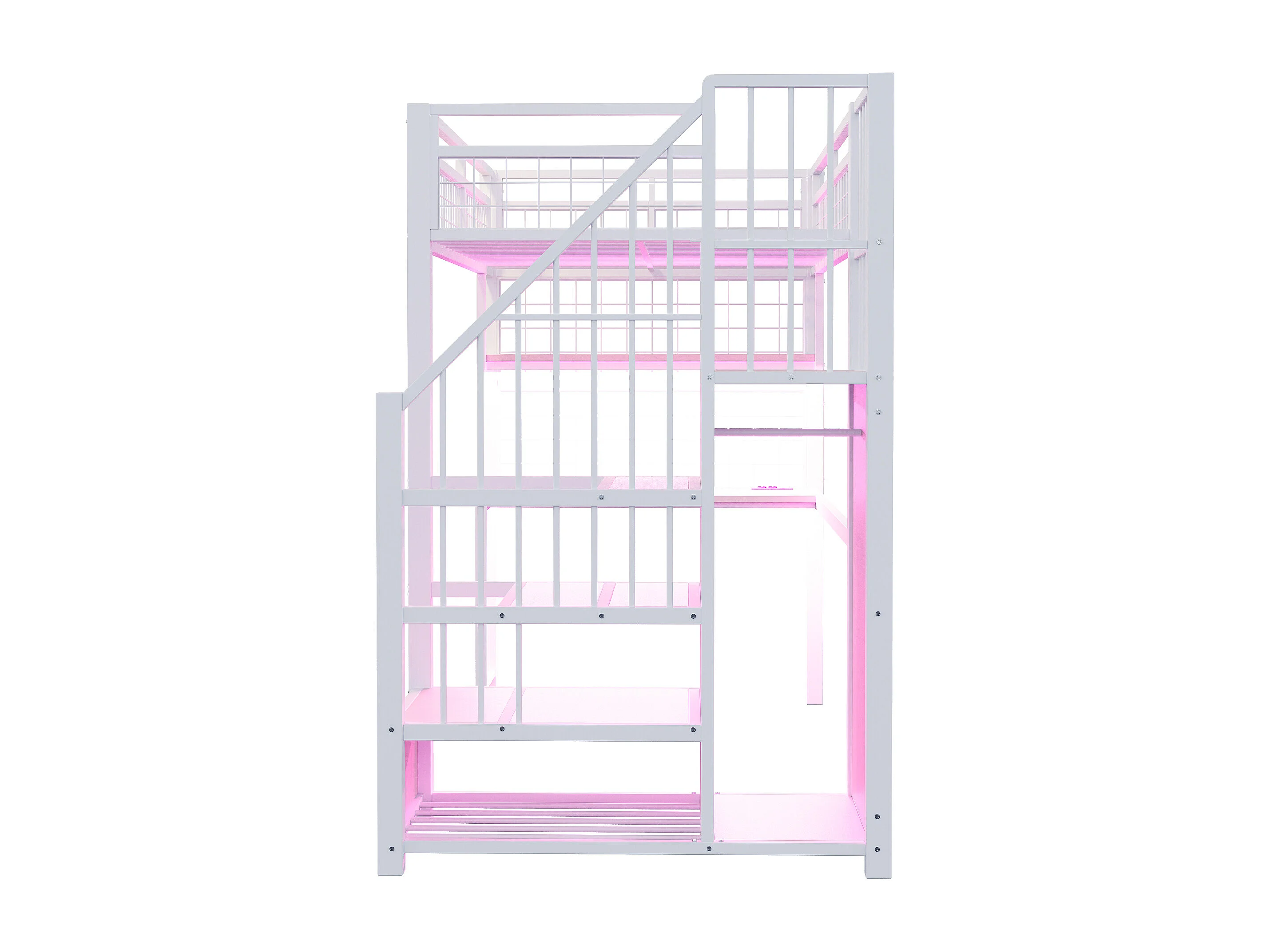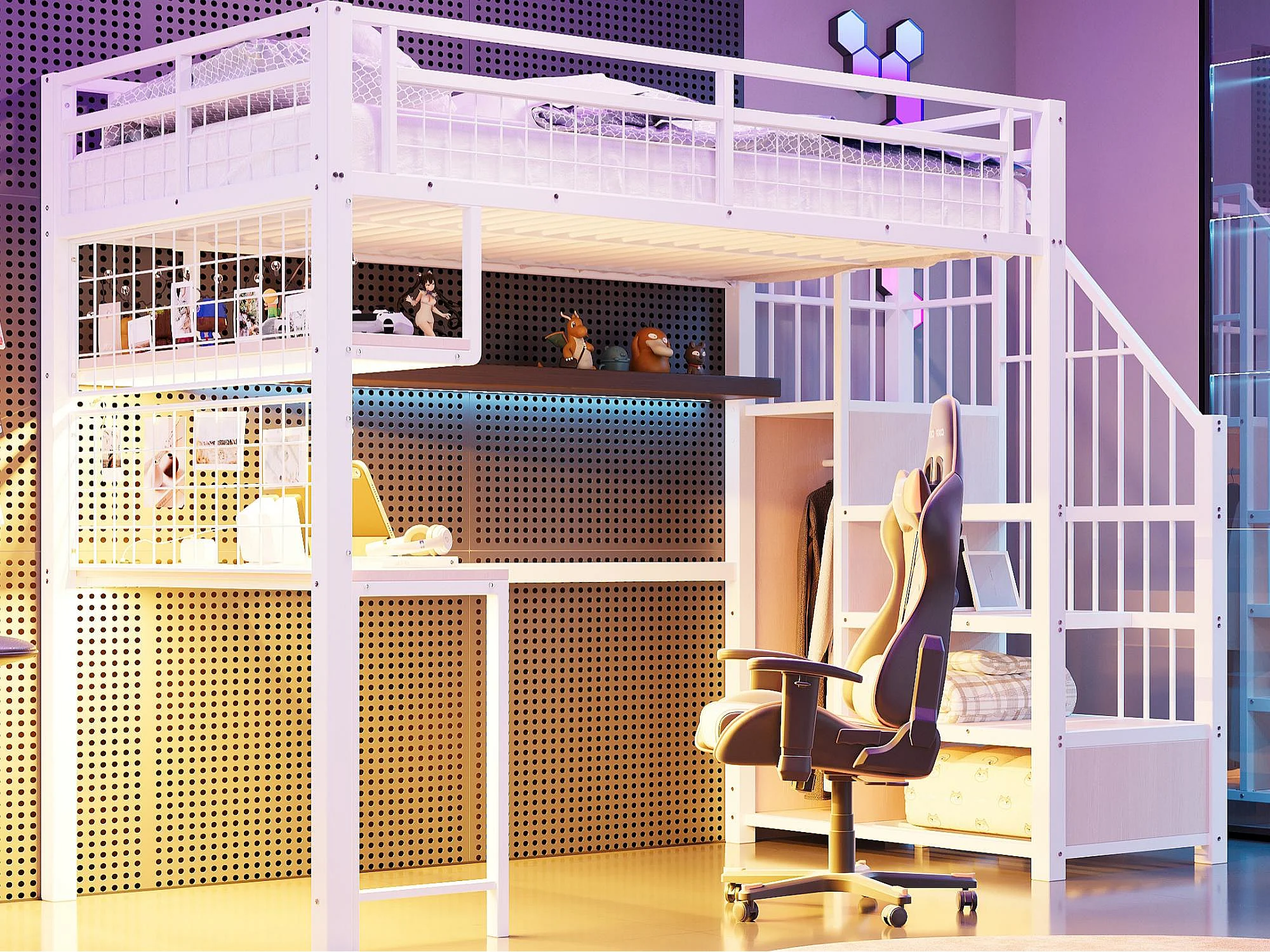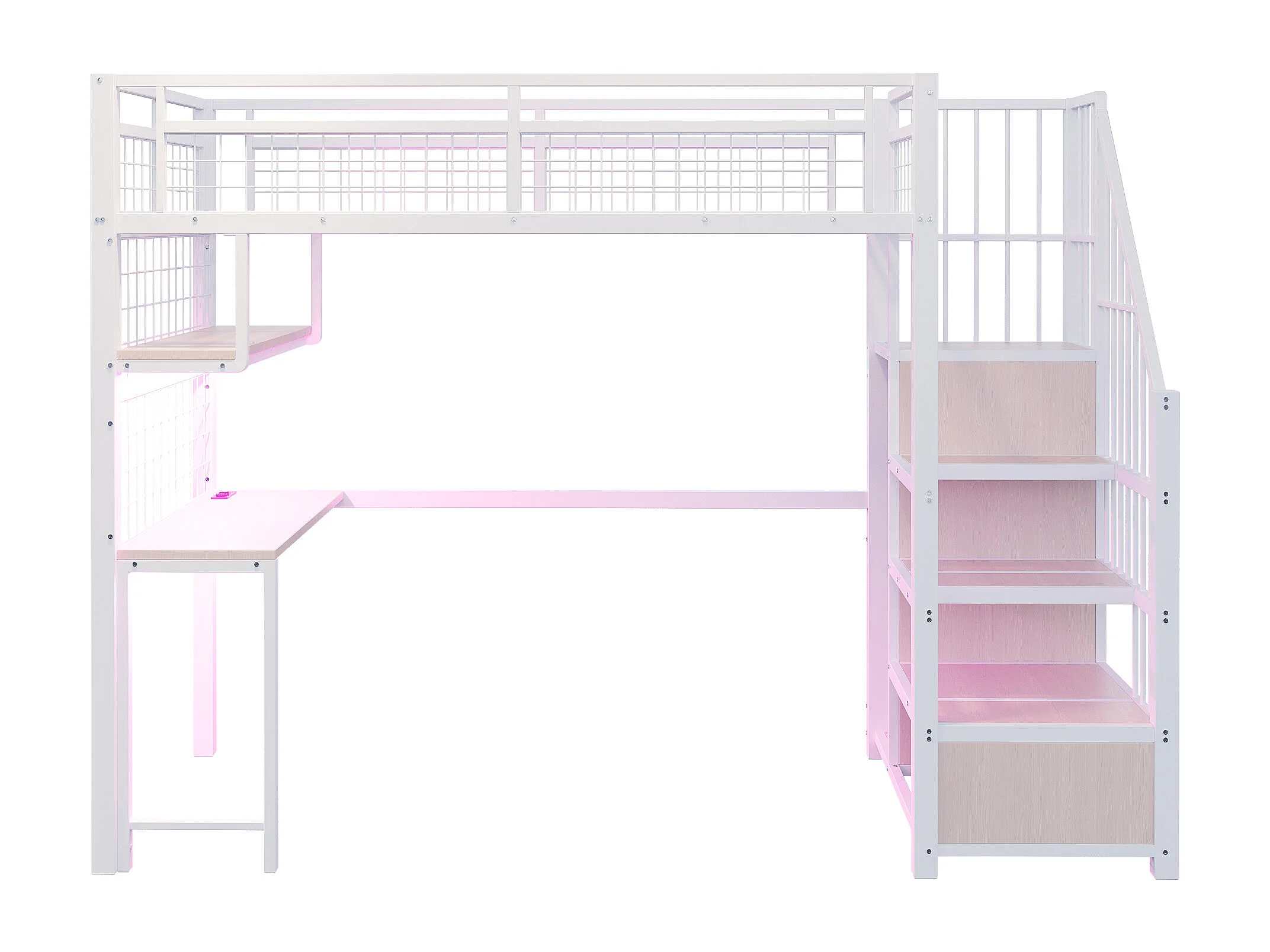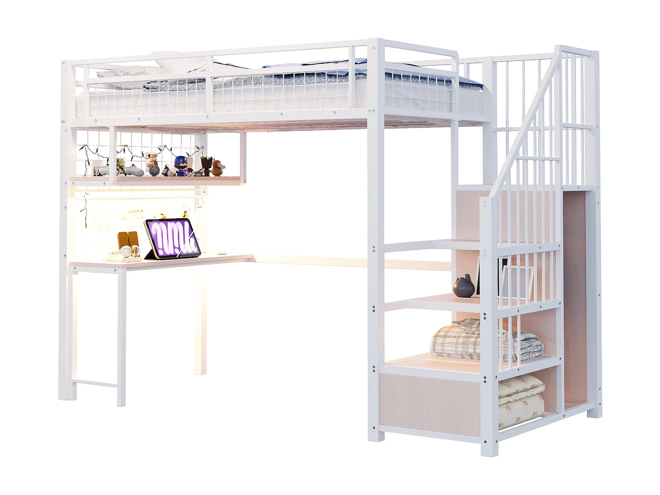 Metall-Hochbett 90x200 cm - mit LED-Beleuchtung und Ladestation - beinhaltet Aufstiegsleiter mit Stauraum - mit Regalen und Schreibtisch - weiß