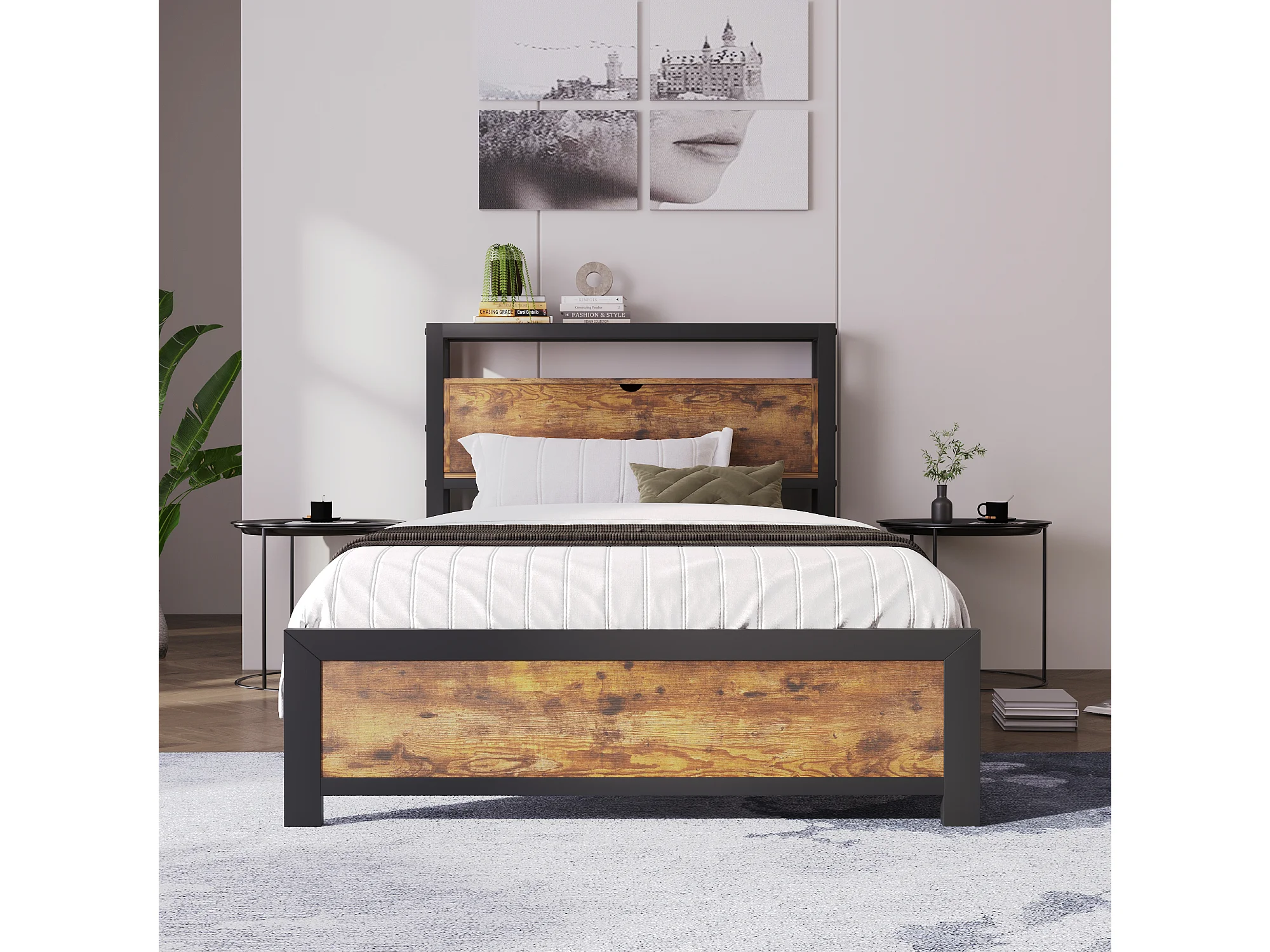 Metallbett - Einzelbett 90x200 cm mit Stauraum-Kopfteil und Metall Lattenrost, Braun