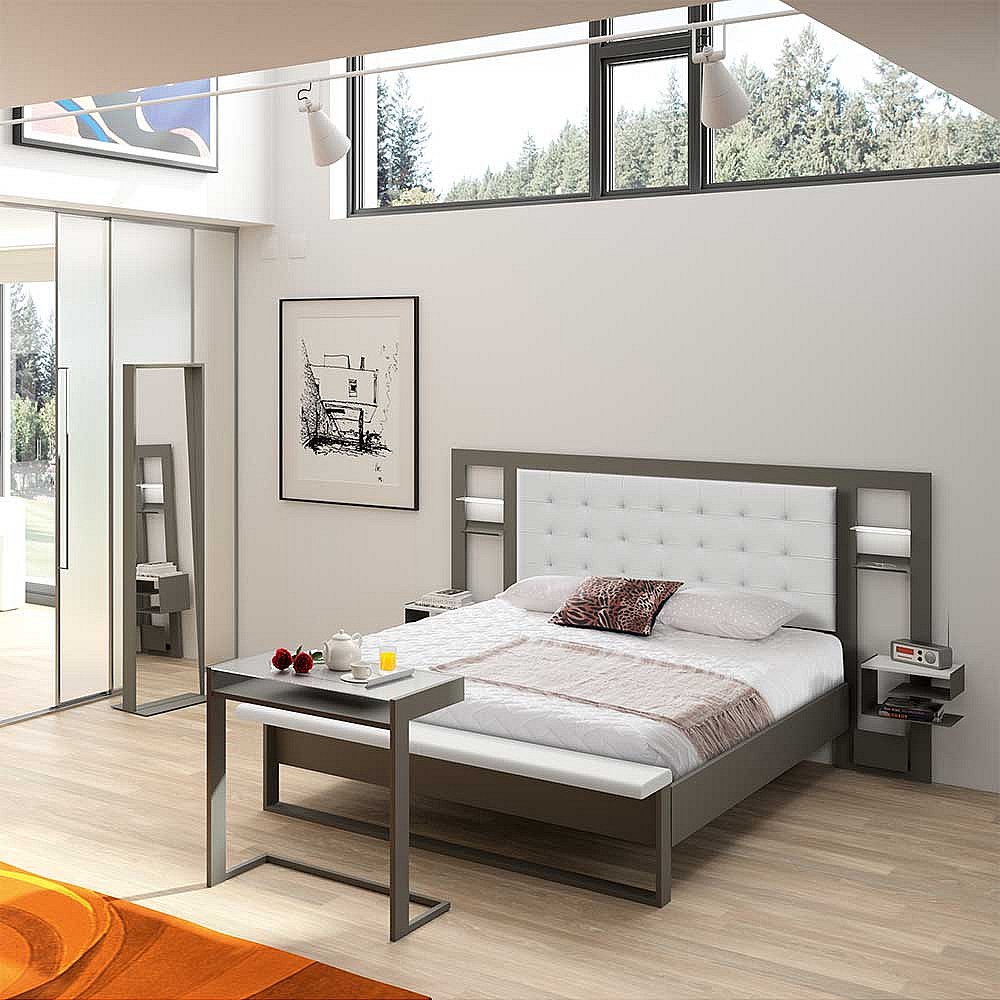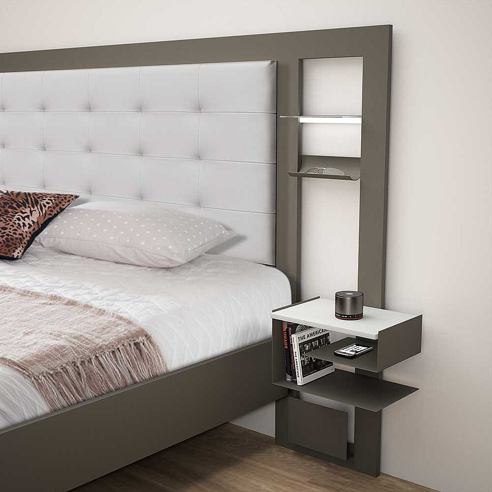Metallbett mit Leselampe und Polsterkopfteil Grau Weiß