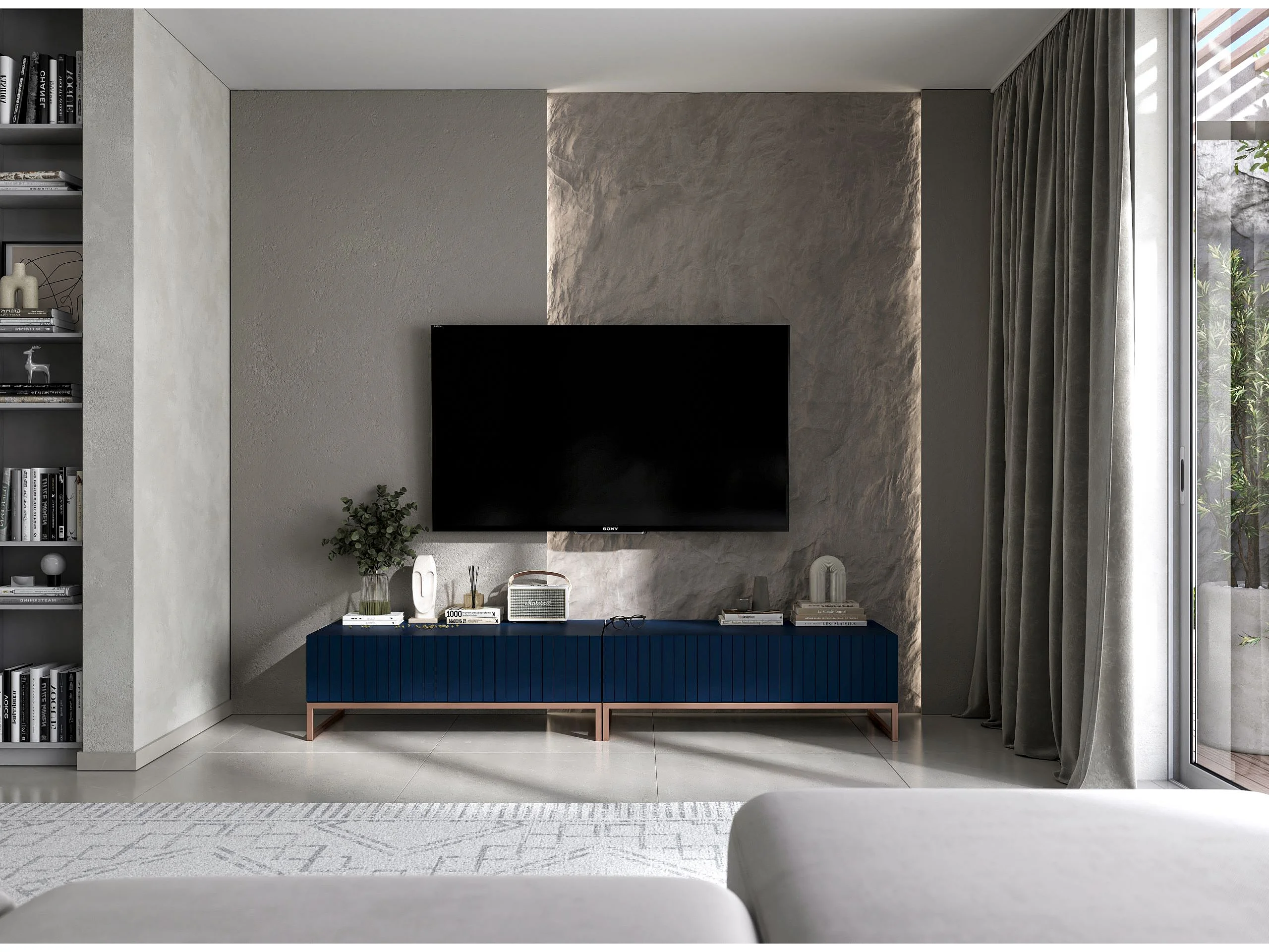 TV-Möbel mit 2 Türen - Korpus Marineblau matt, geriffelte Fronten Marineblau matt - 220 cm, Metallrahmen