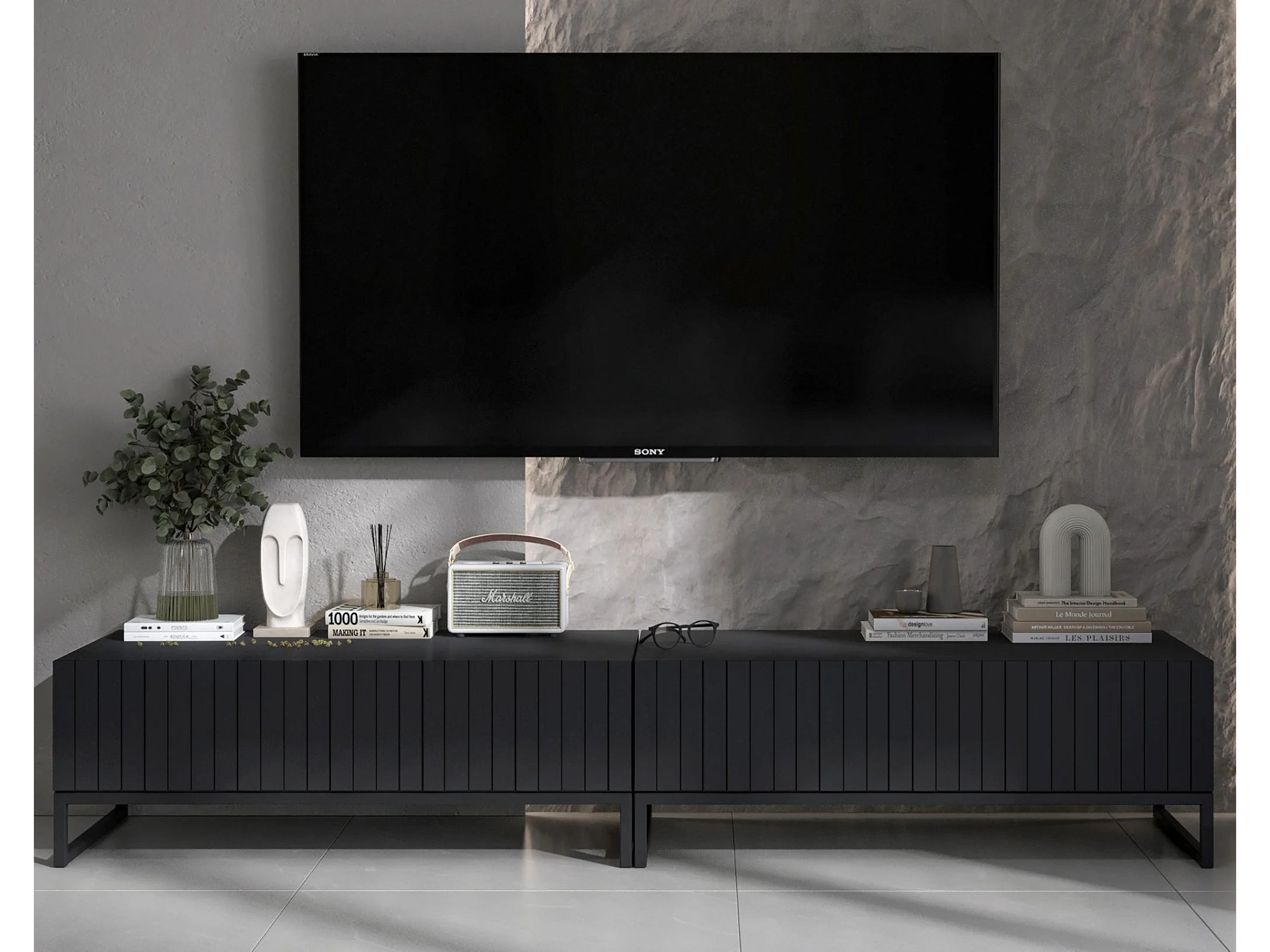 TV-Möbel mit 2 Türen - Korpus Schwarz matt, geriffelte Fronten Schwarz matt - 220 cm, Rahmen aus schwarzem Metall