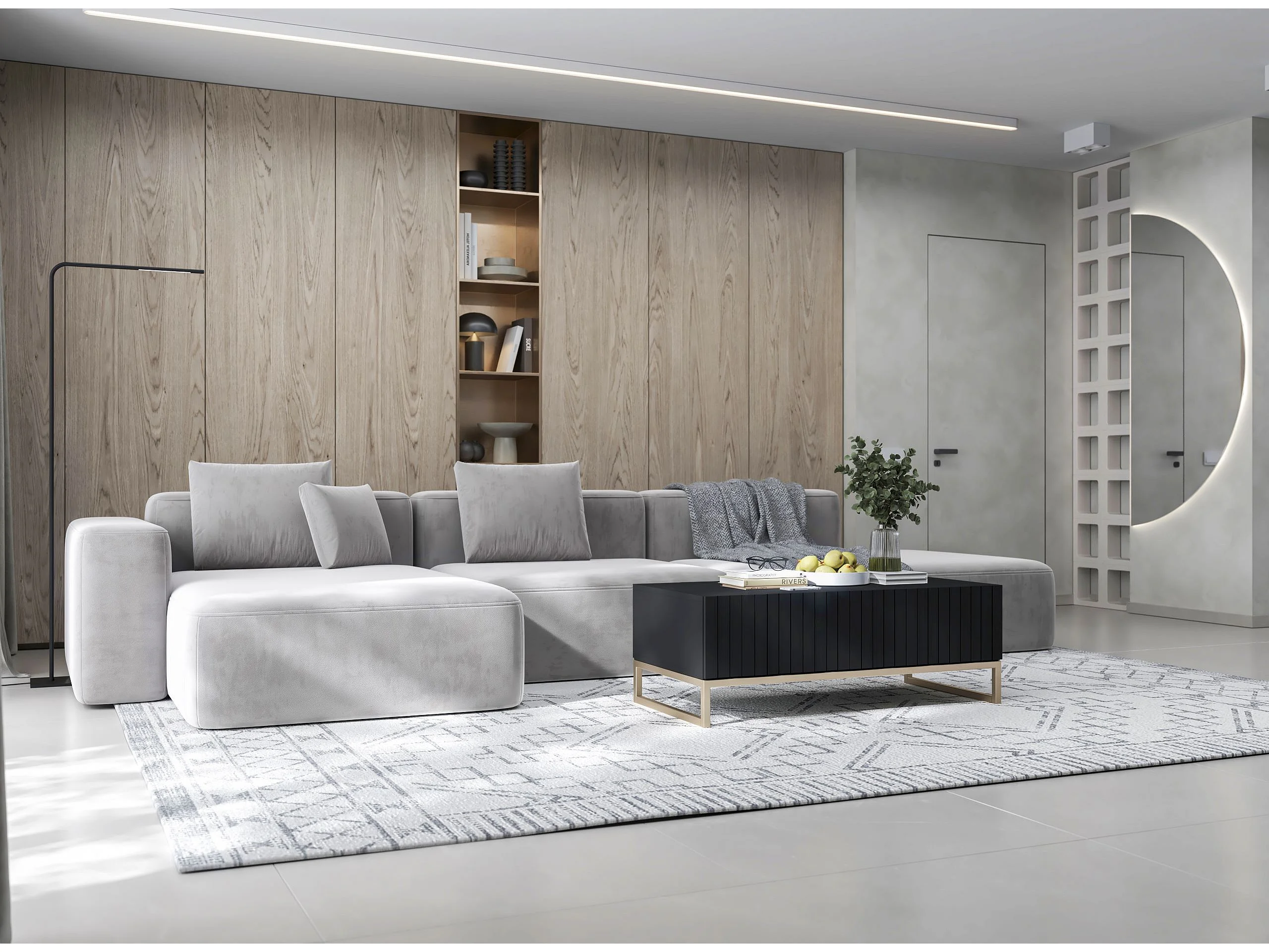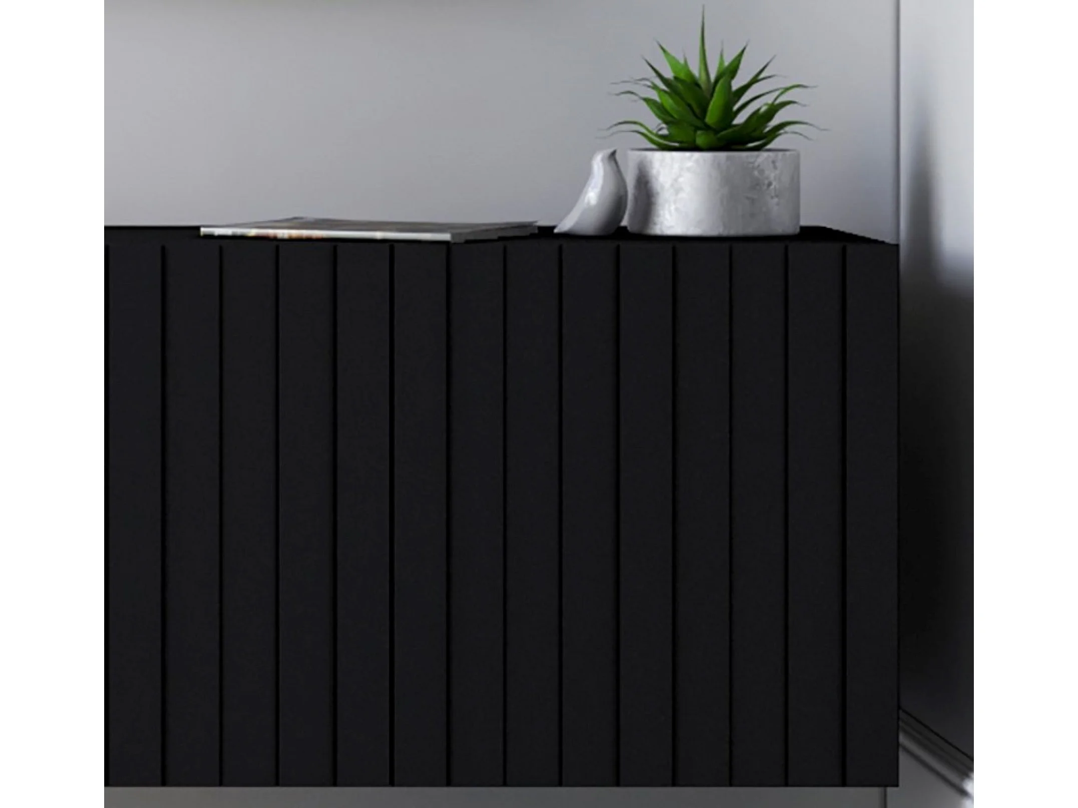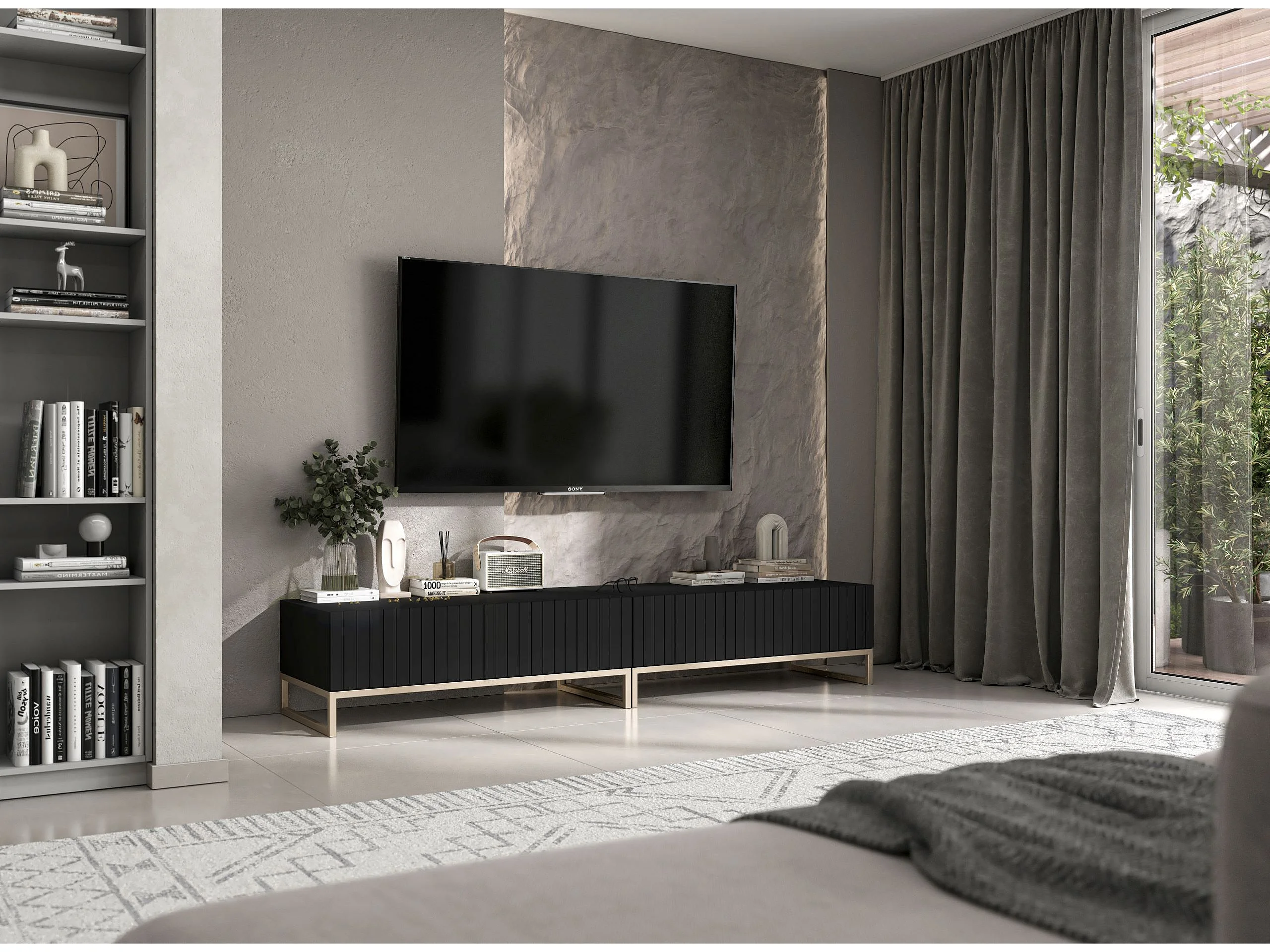 TV-Möbel mit 2 Türen - Korpus Schwarz matt, geriffelte Fronten Schwarz matt - 220 cm, Metallrahmen