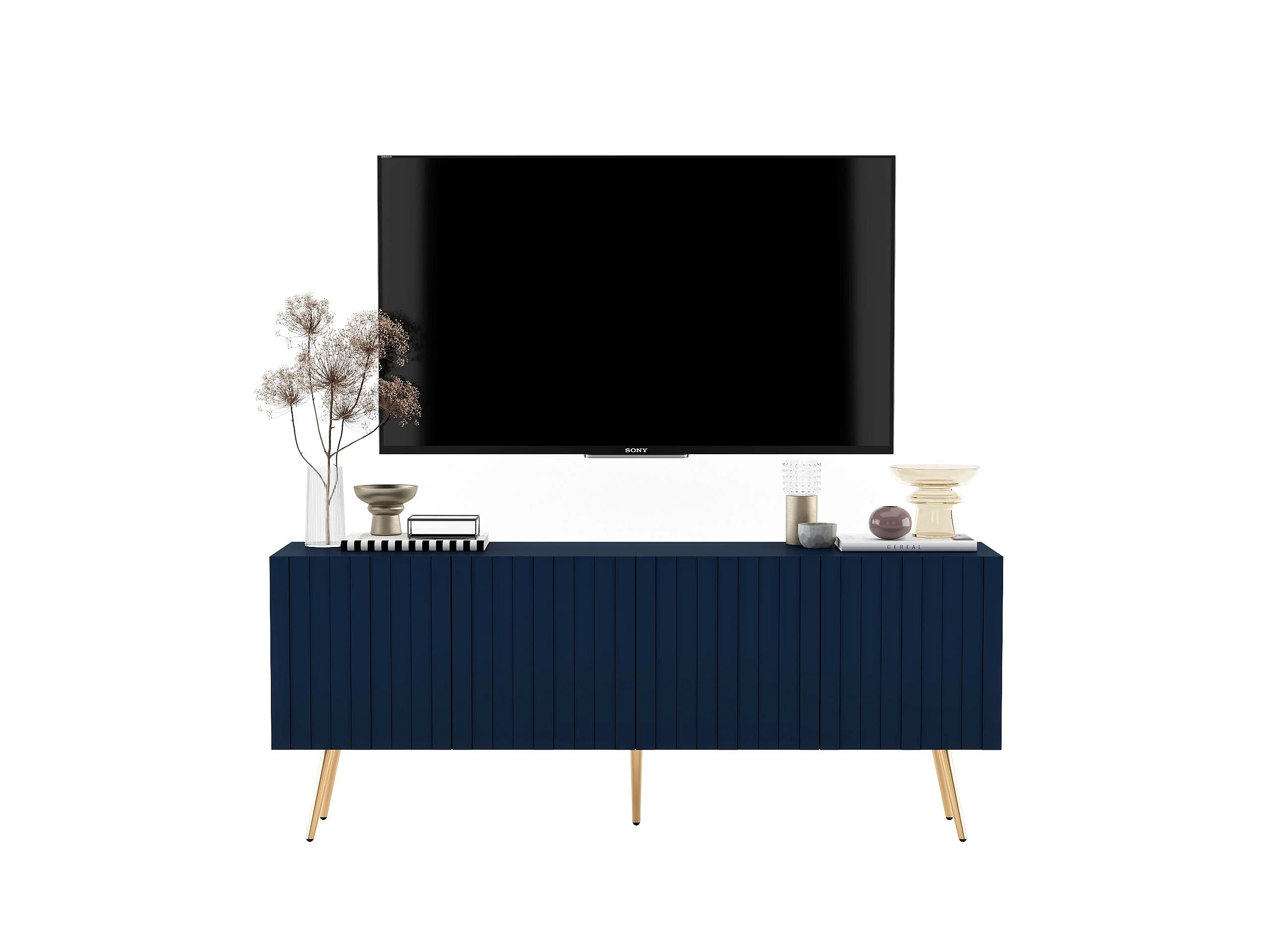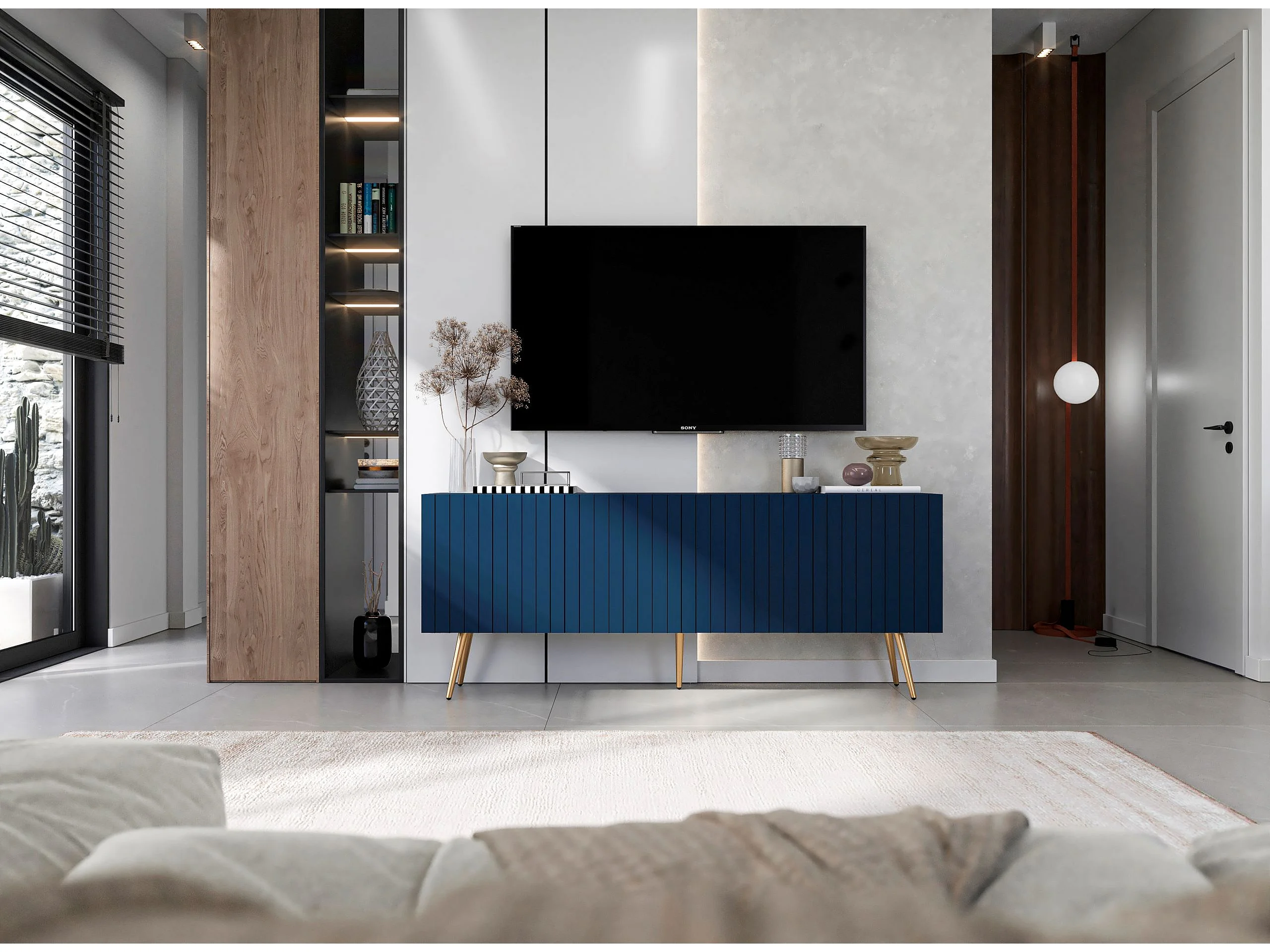TV-Lowboard mit 4 Türen - Korpus Marineblau matt, gerillte Fronten Marineblau matt - 150 cm, goldene Füße