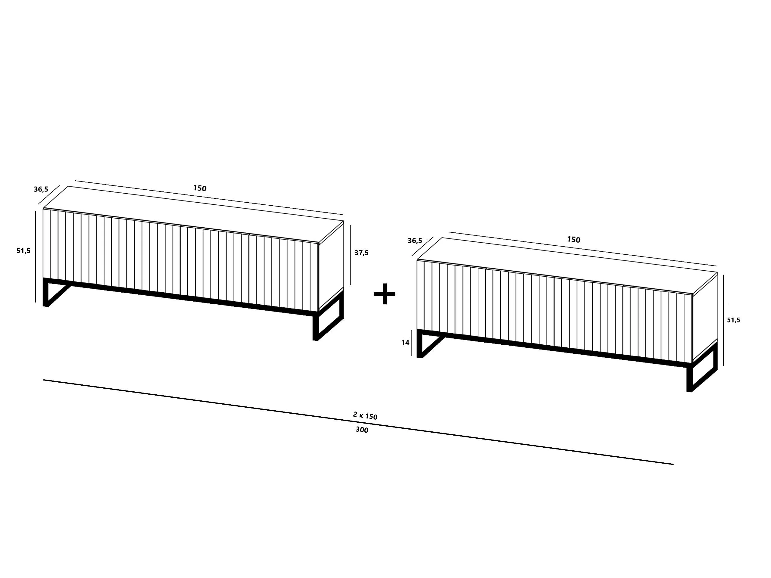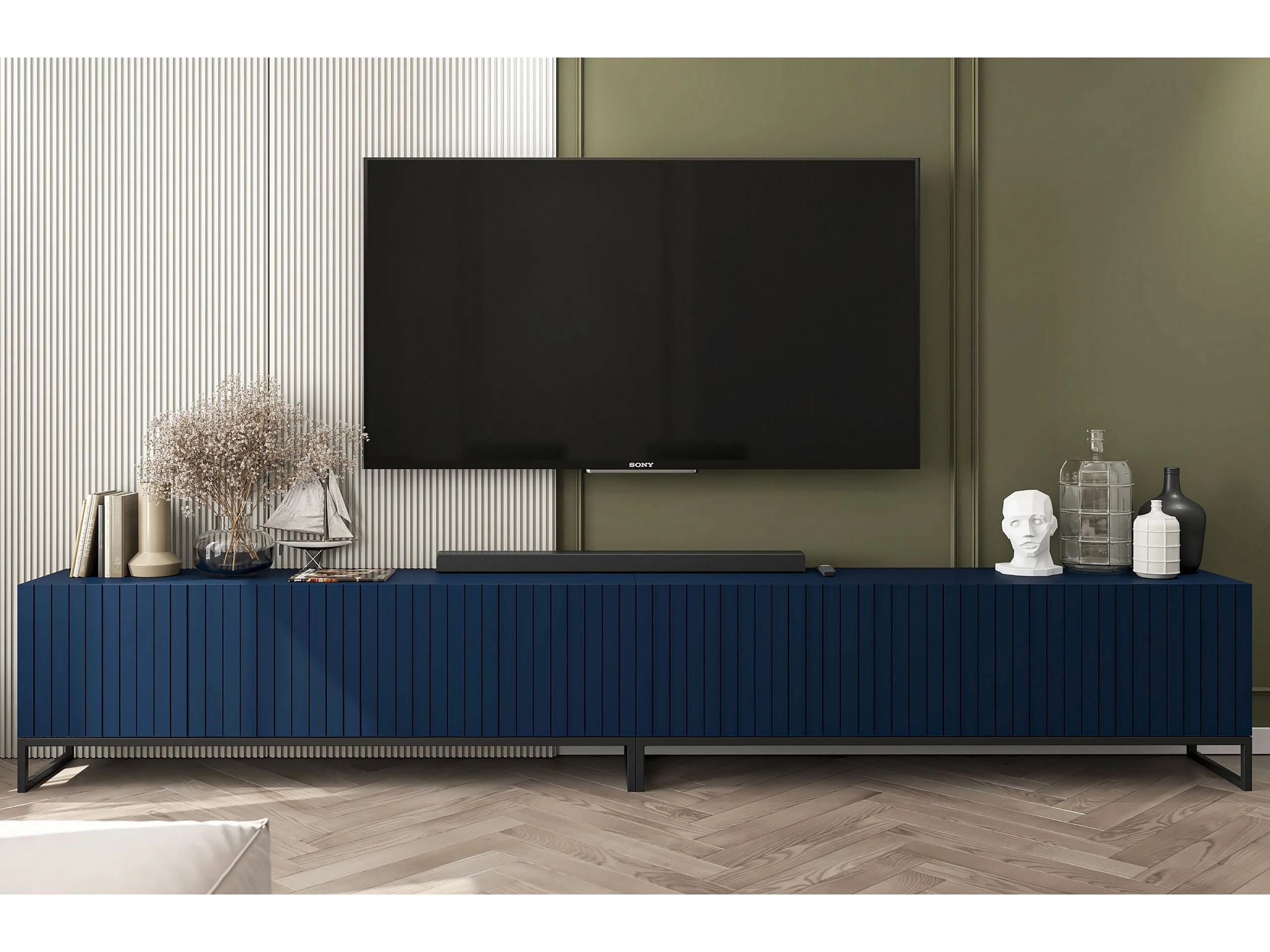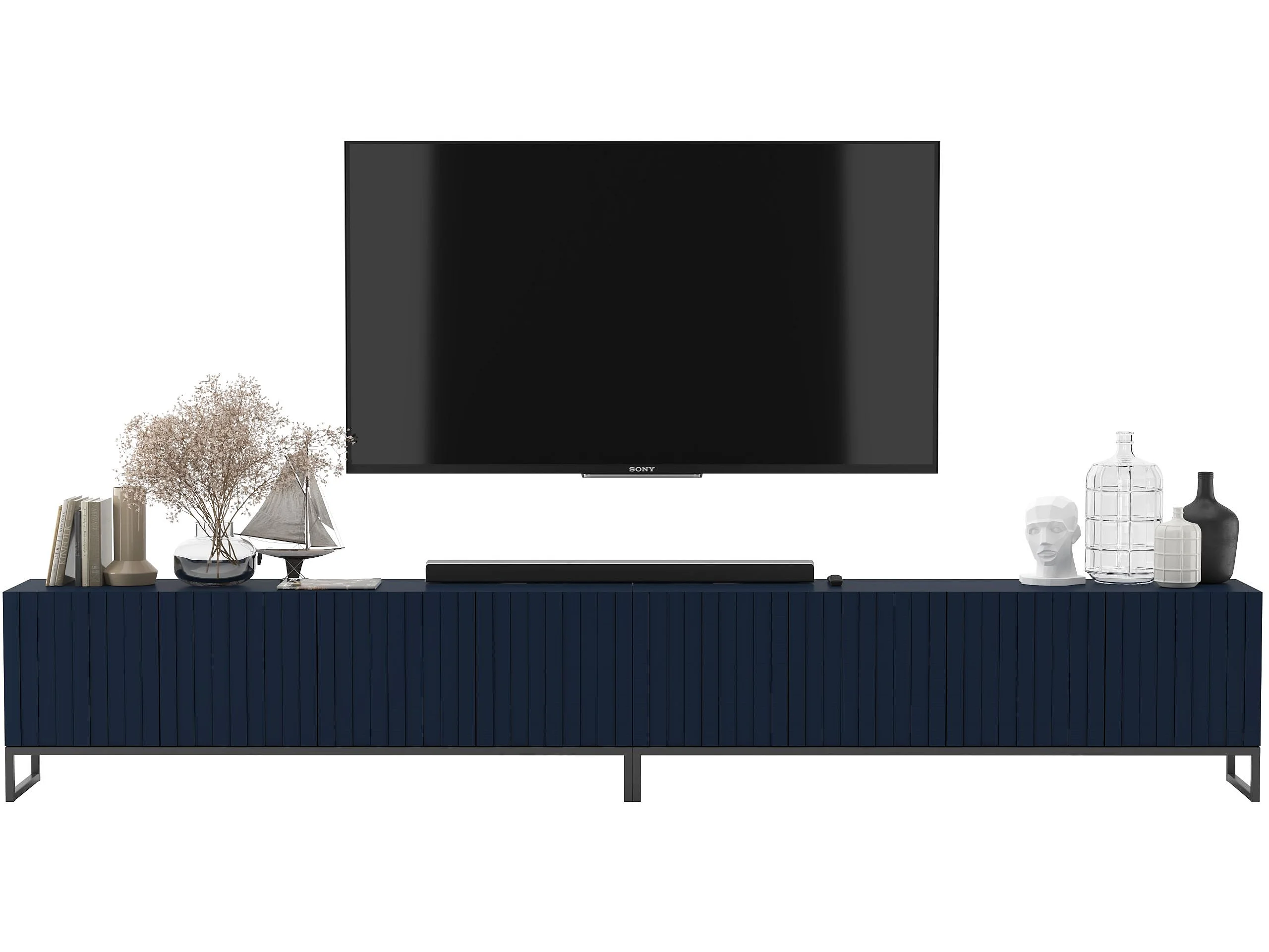 TV-Möbel mit 8 Türen - Korpus Marineblau matt, geriffelte Fronten Marineblau matt - 300 cm, Schwarzer Metallrahmen