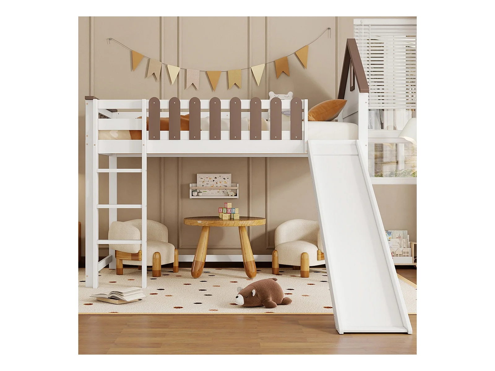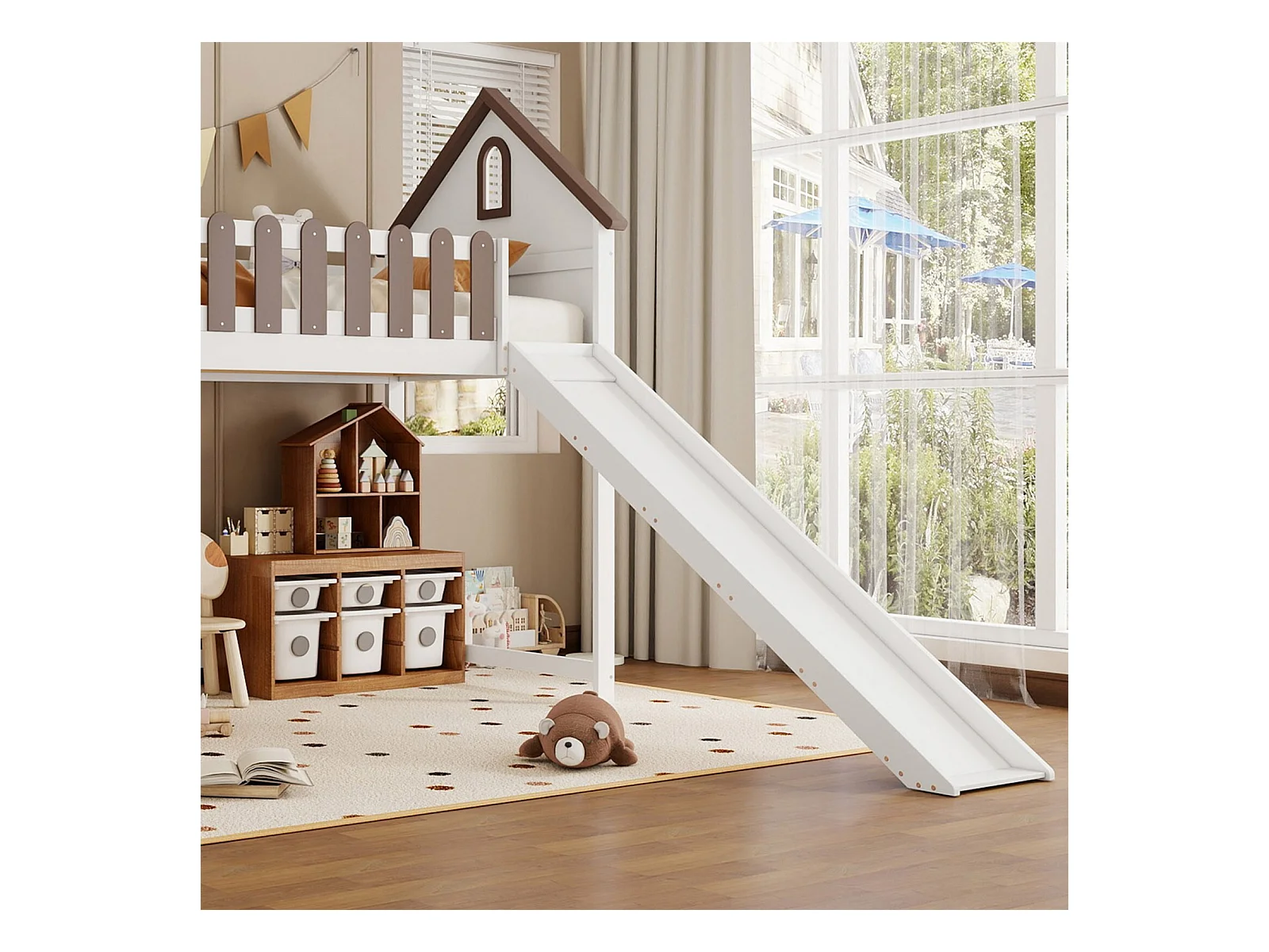 Mezzaninbett 90 x 200 cm - mit Dach und Fenster - Schlitten - Pin + MDF, weiß