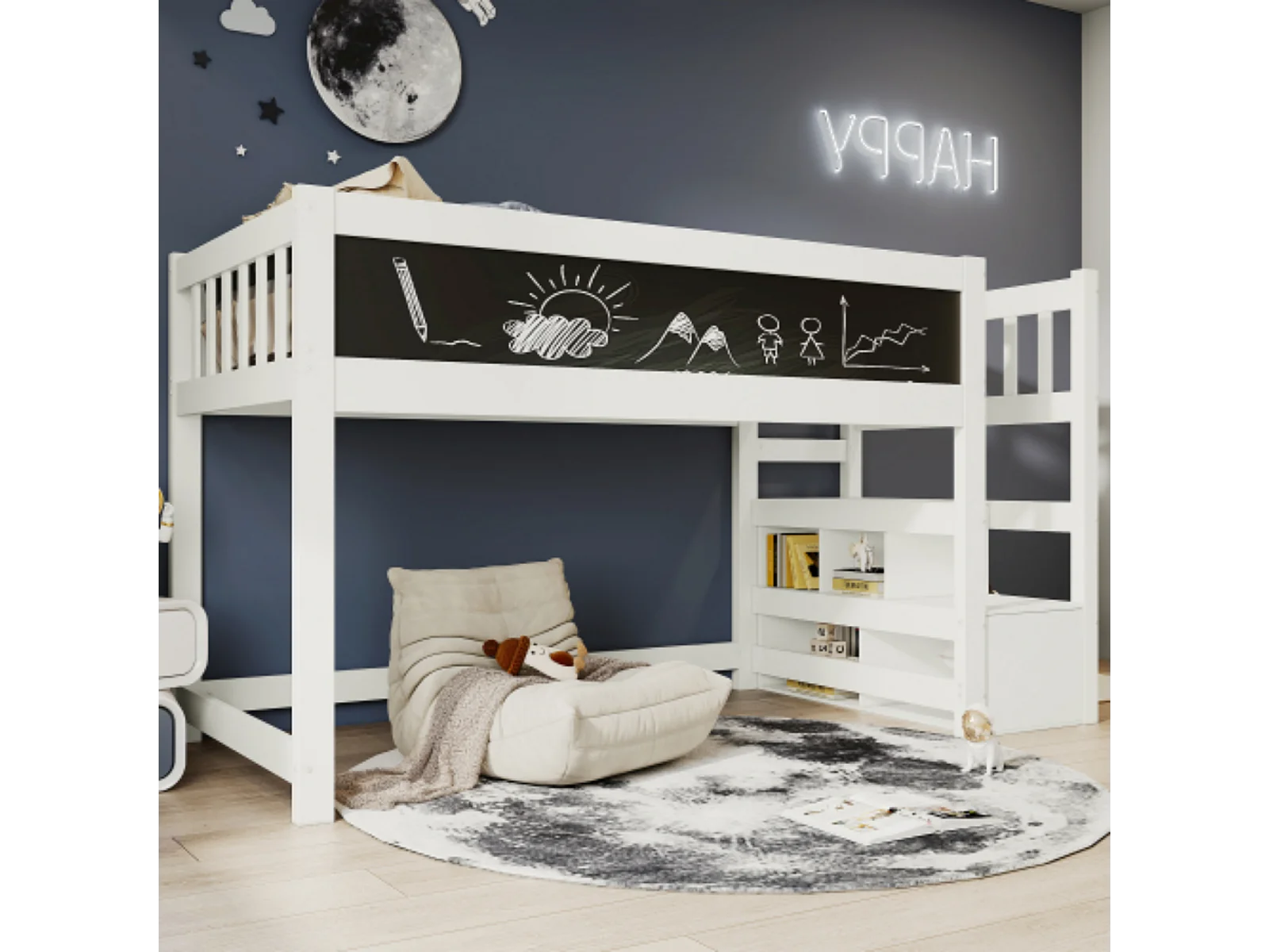 Mezzanine -Bett für Kinder 90x200 cm mit Aufbewahrungstreppe und Gemälden - EN747 -Zertifizierungskiefern - Weiß