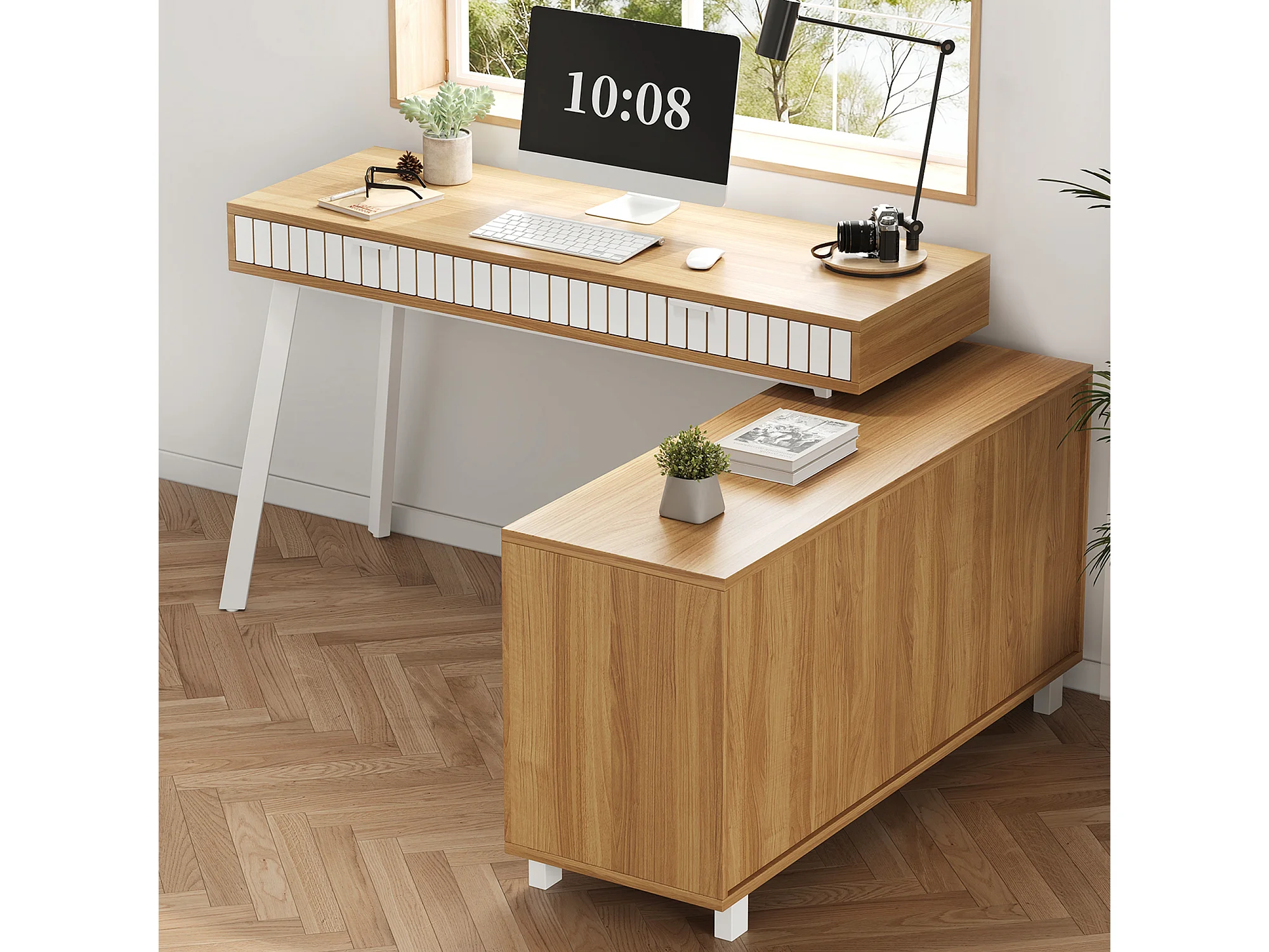 Minimalistischer L-förmiger Schreibtisch – 140 x 120 x 76,5 cm – Stahlbeine – mit 2 Schubladen + Türen + Ablagen – MDF + Metall – natur