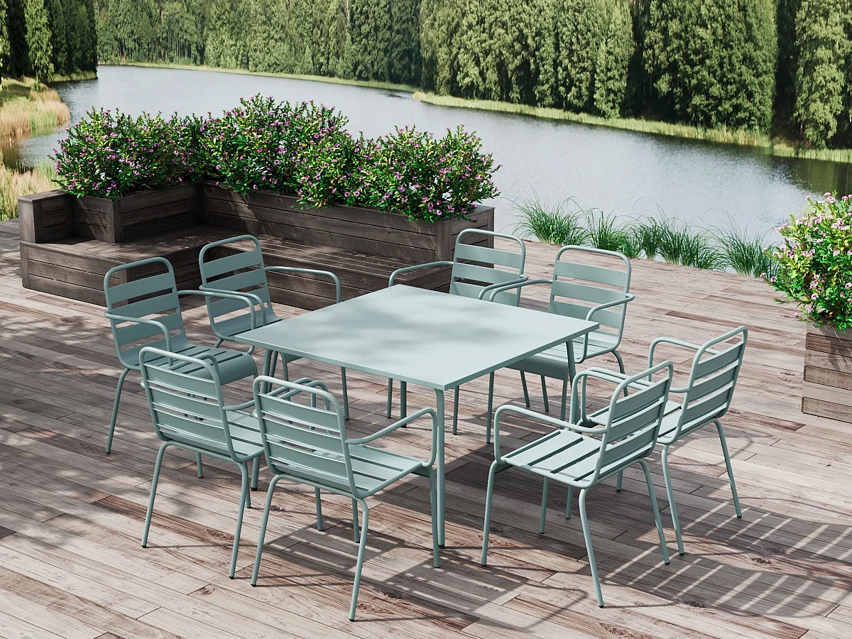Garten-Essgruppe: Tisch L. 120 cm + 8 stapelbare Sessel - Metall - Mandelgrün - MIRMANDE von MYLIA