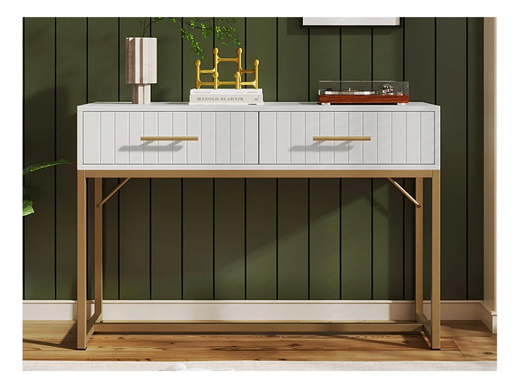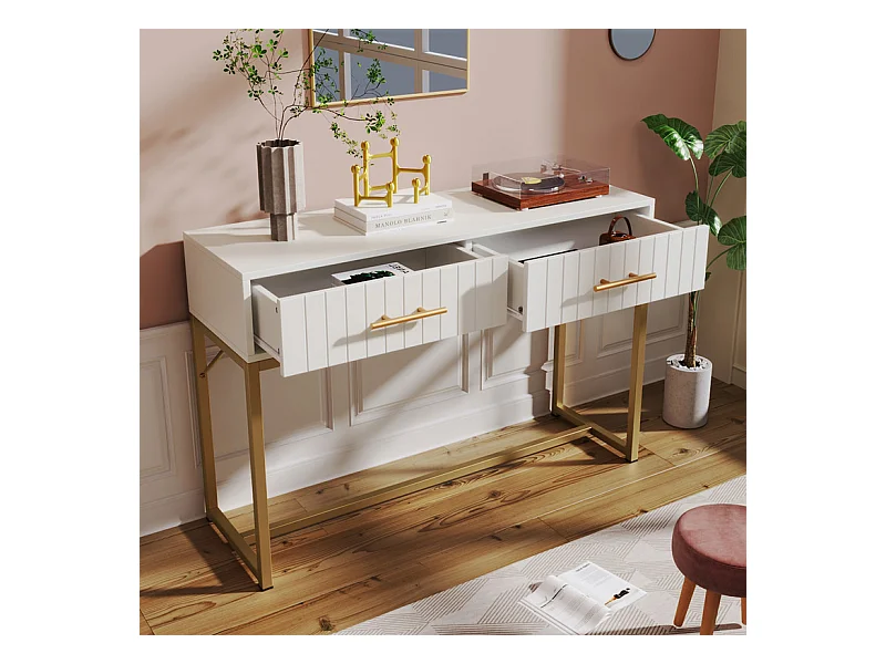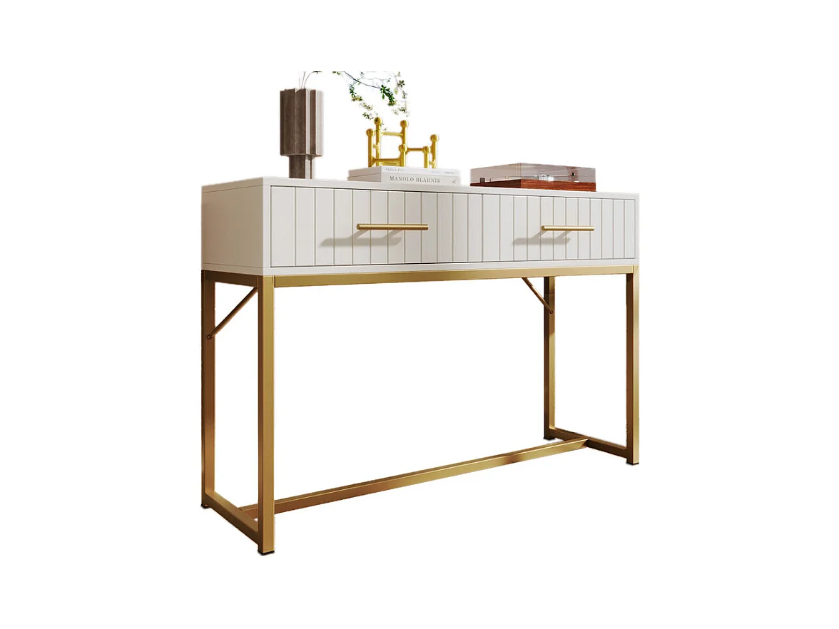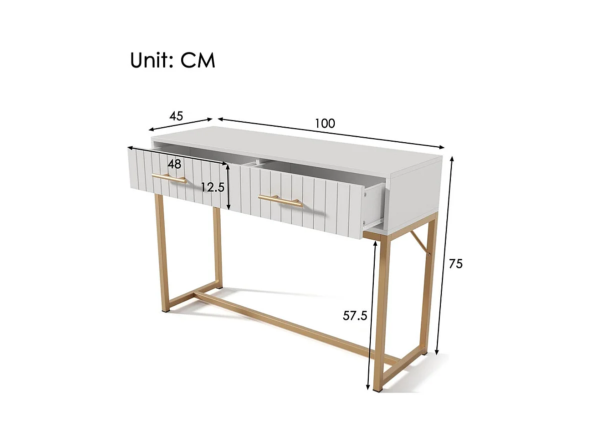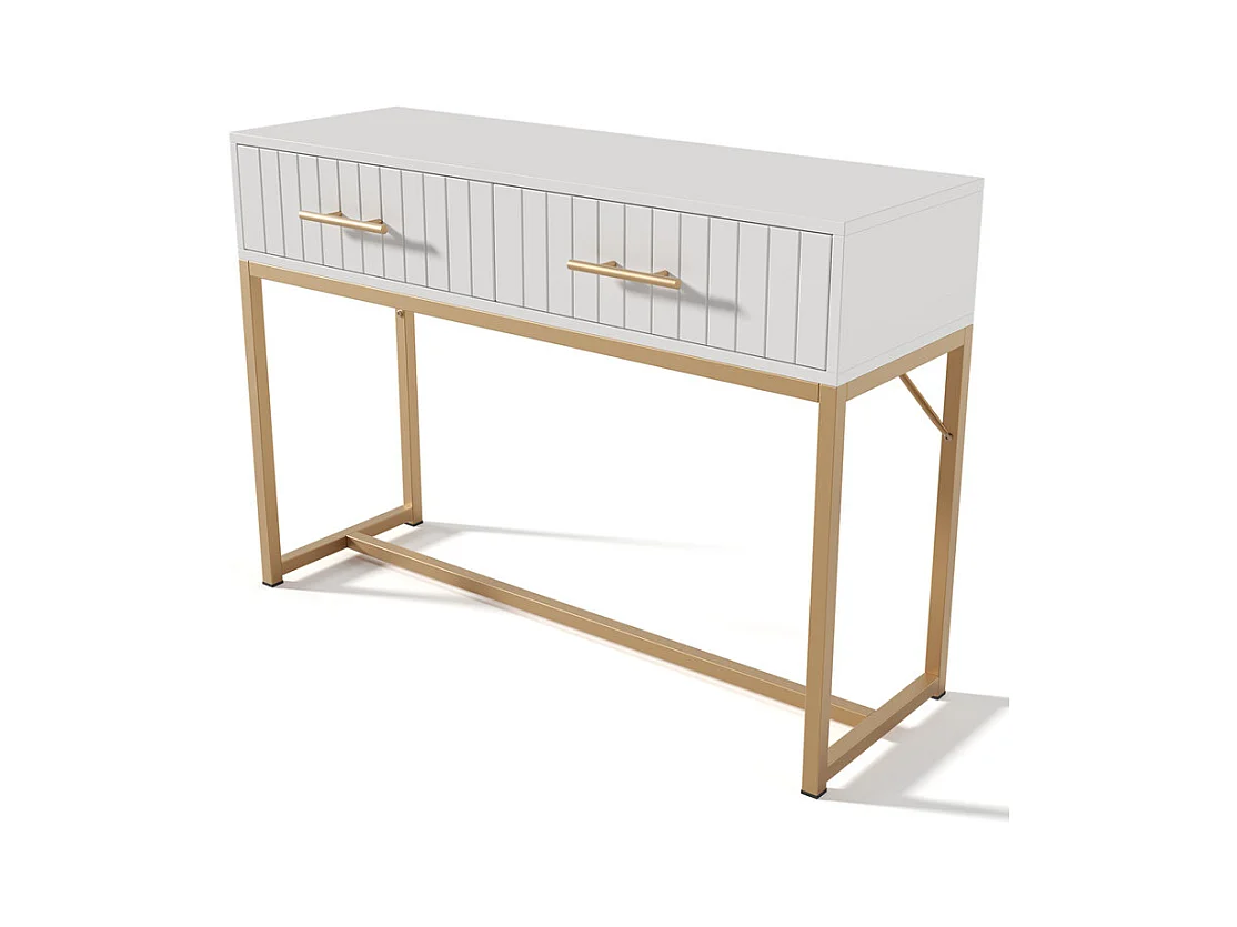 Mit vertikalen Streifen verzierter Schminktisch – H 75 cm – mit 2 Schubladen und Metallsockel – Weiß