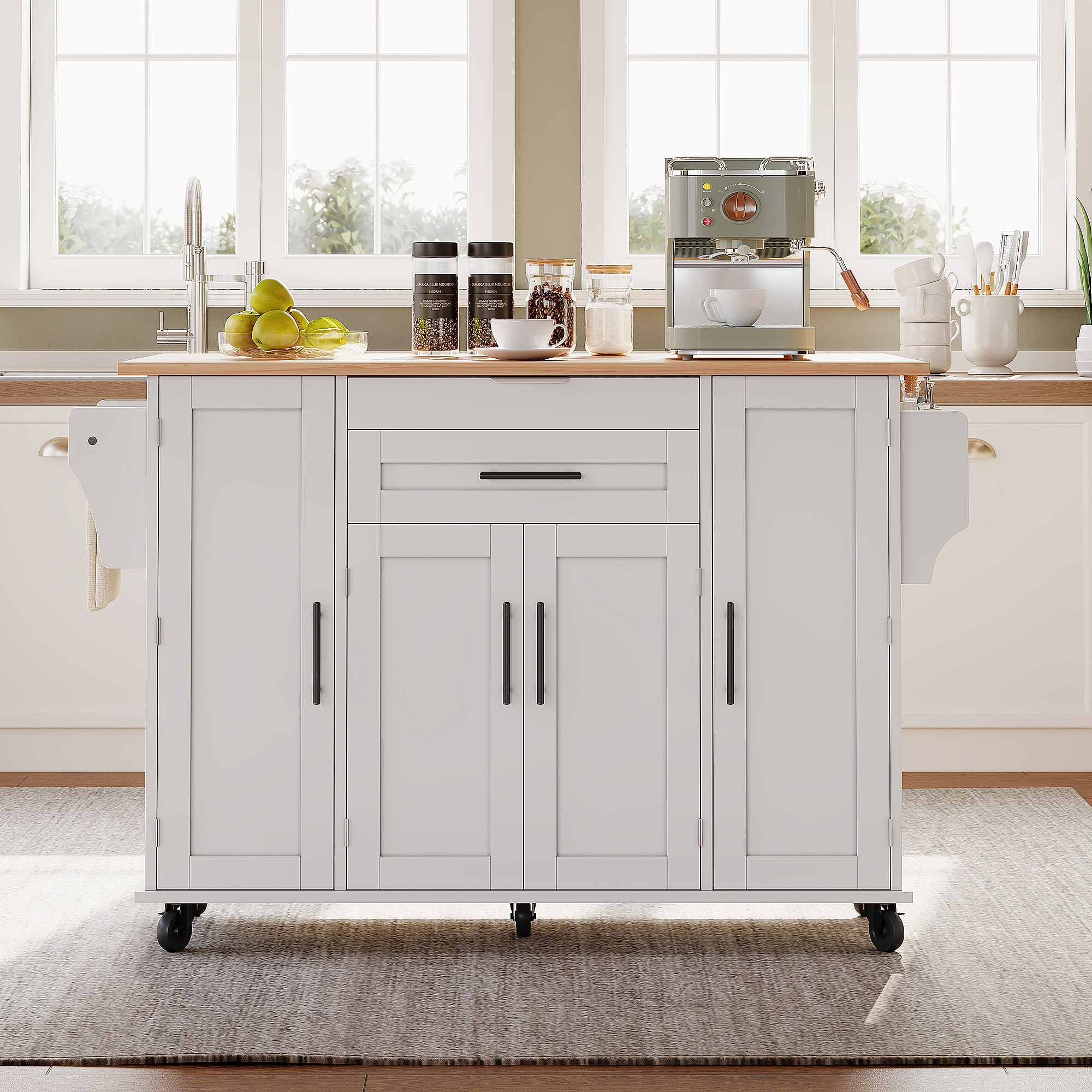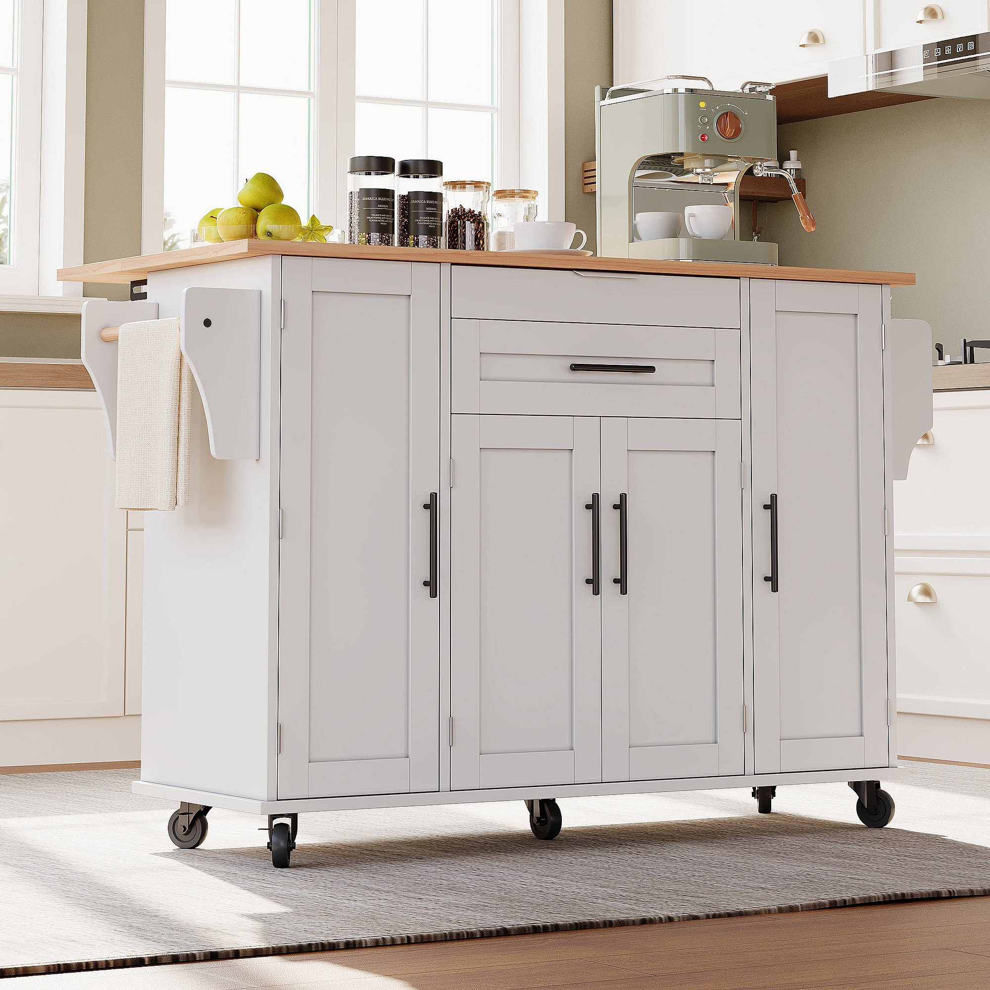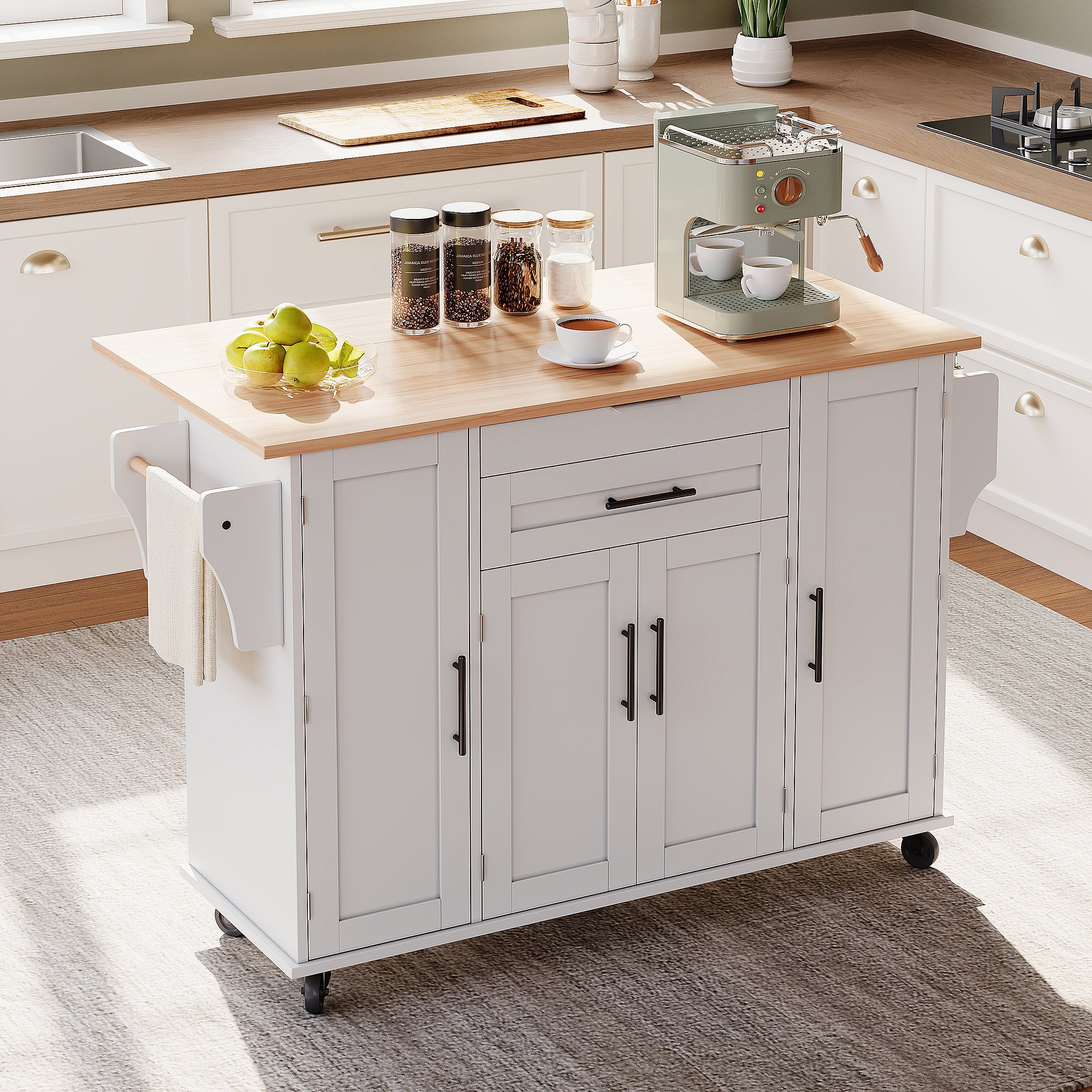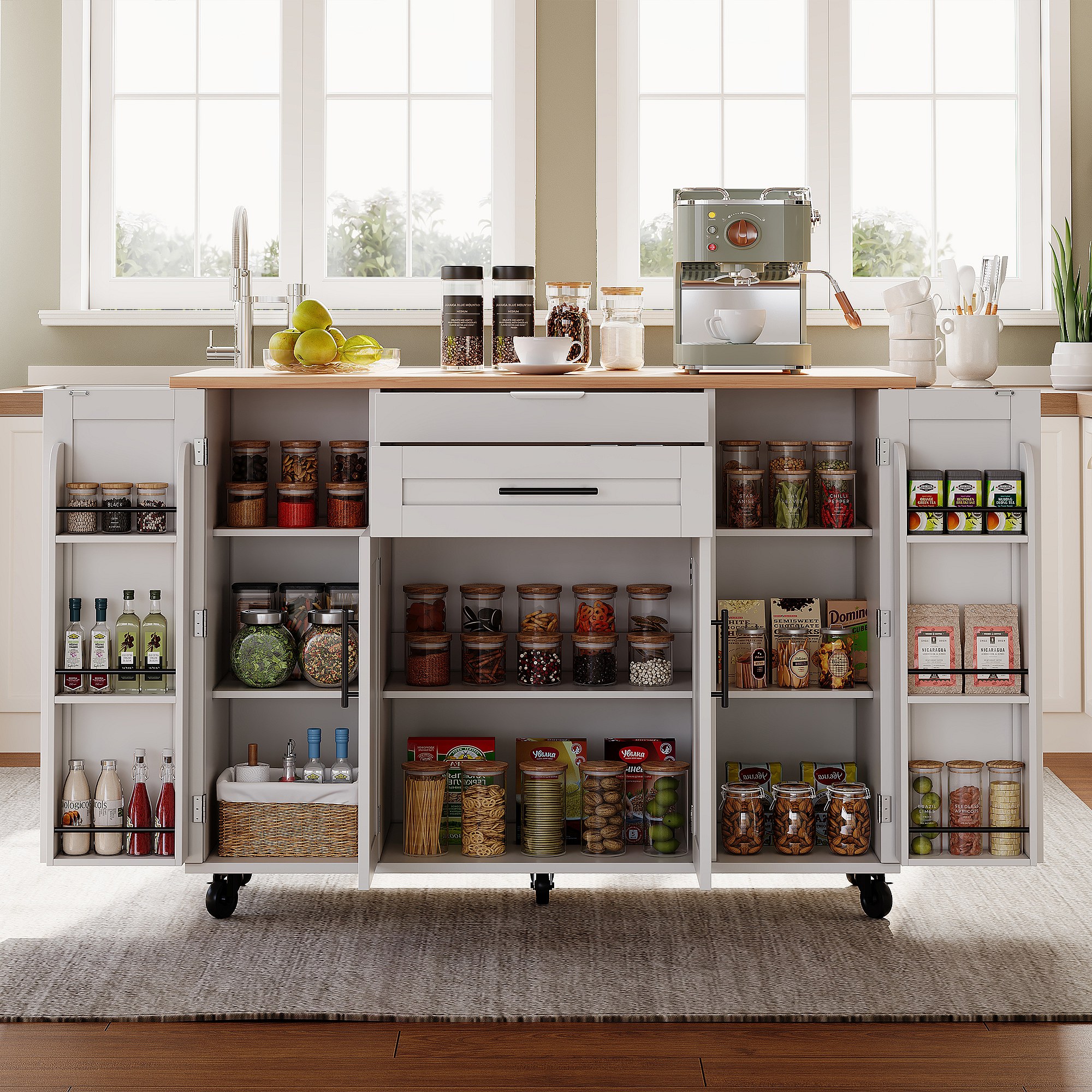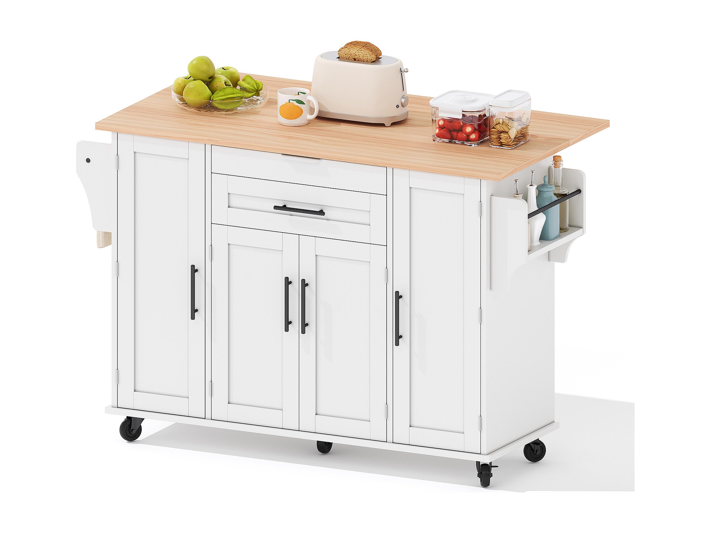 Mobile Kücheninsel - ausziehbare Arbeitsplatte - mit Gewürzregal und Handtuchhalter - mit 2 Schubladen und 4 Türen - MDF - Weiß