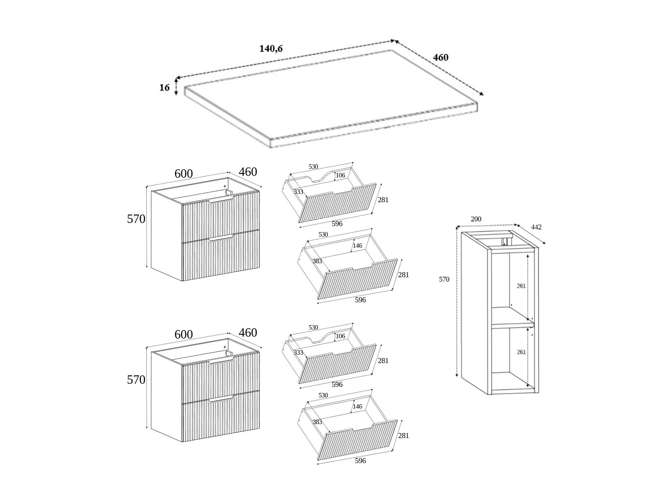 Mobiletto da bagno, bianco /nero, 140 (2 x 60 + 20) x 58,6 x 46 cm