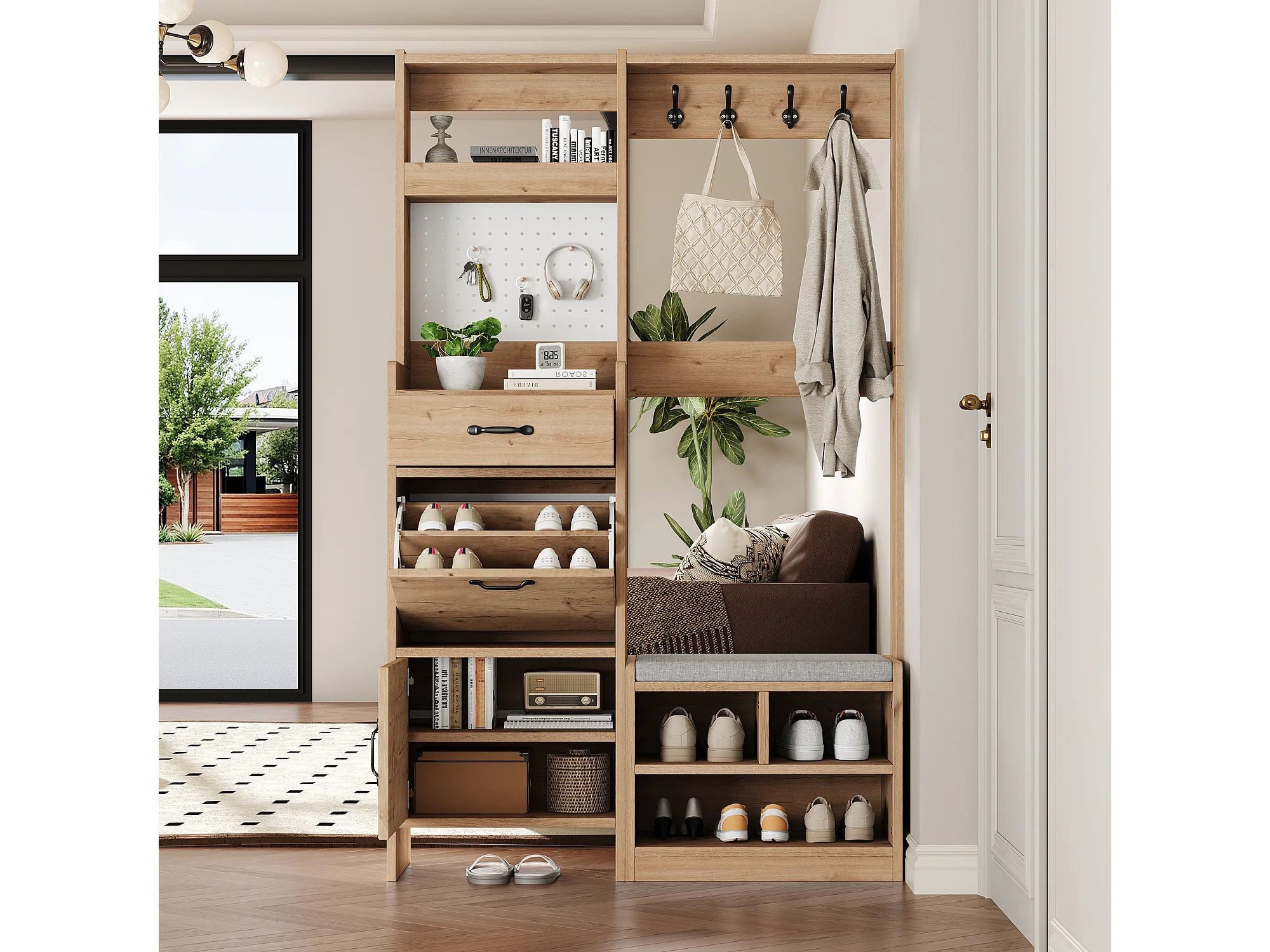 Moderne Eingangsgarderobe 80x35x185cm - mit 1 Schublade und 2 Türen - mit Schuhbank und Schuhschrank - Natur