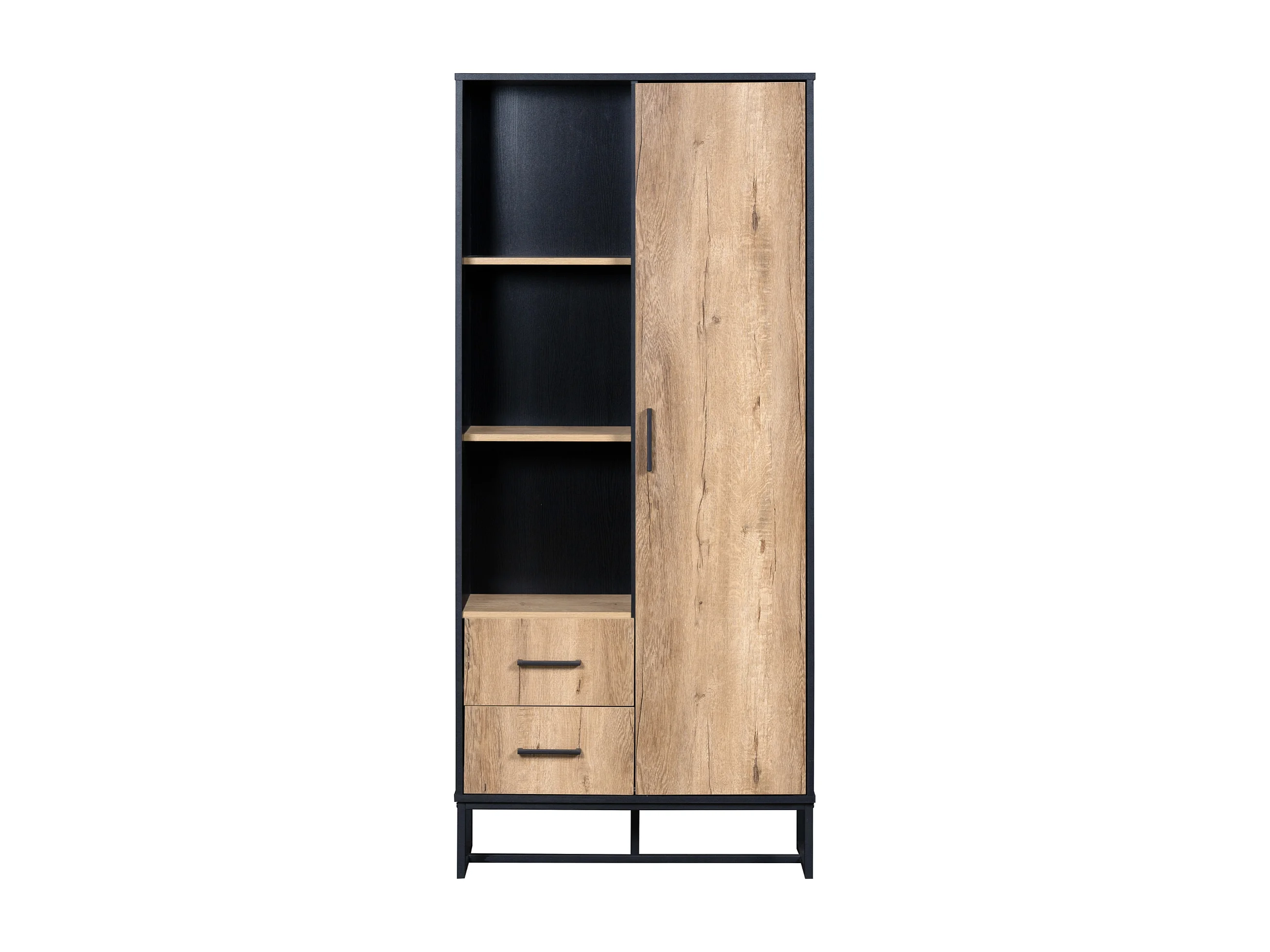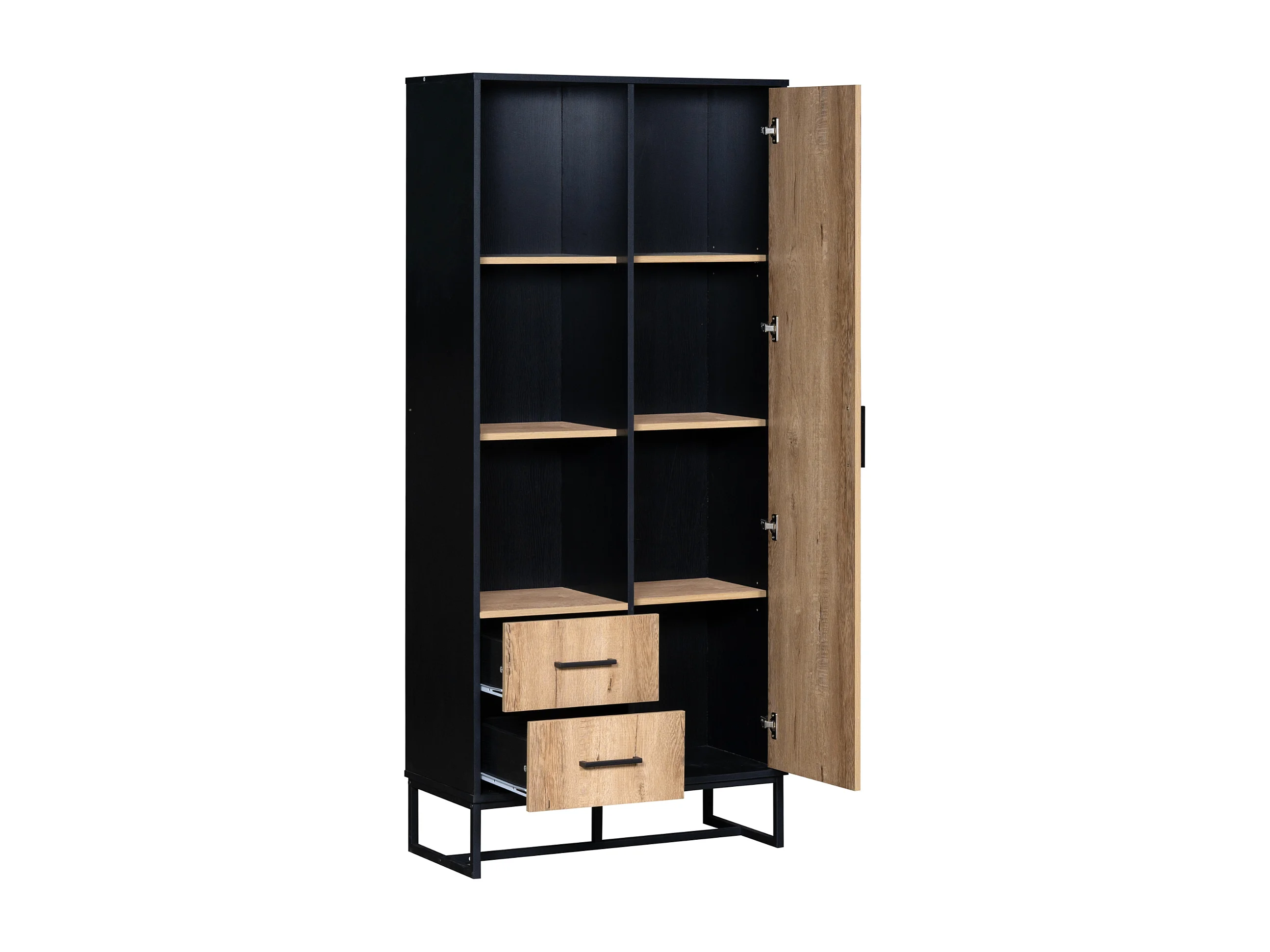 Moderne Vitrine 80x40x180 cm - Außenseite aus Holz, schwarzer Rahmen, mit Türen, 2 Schubladen und 3 offenen Fächern.