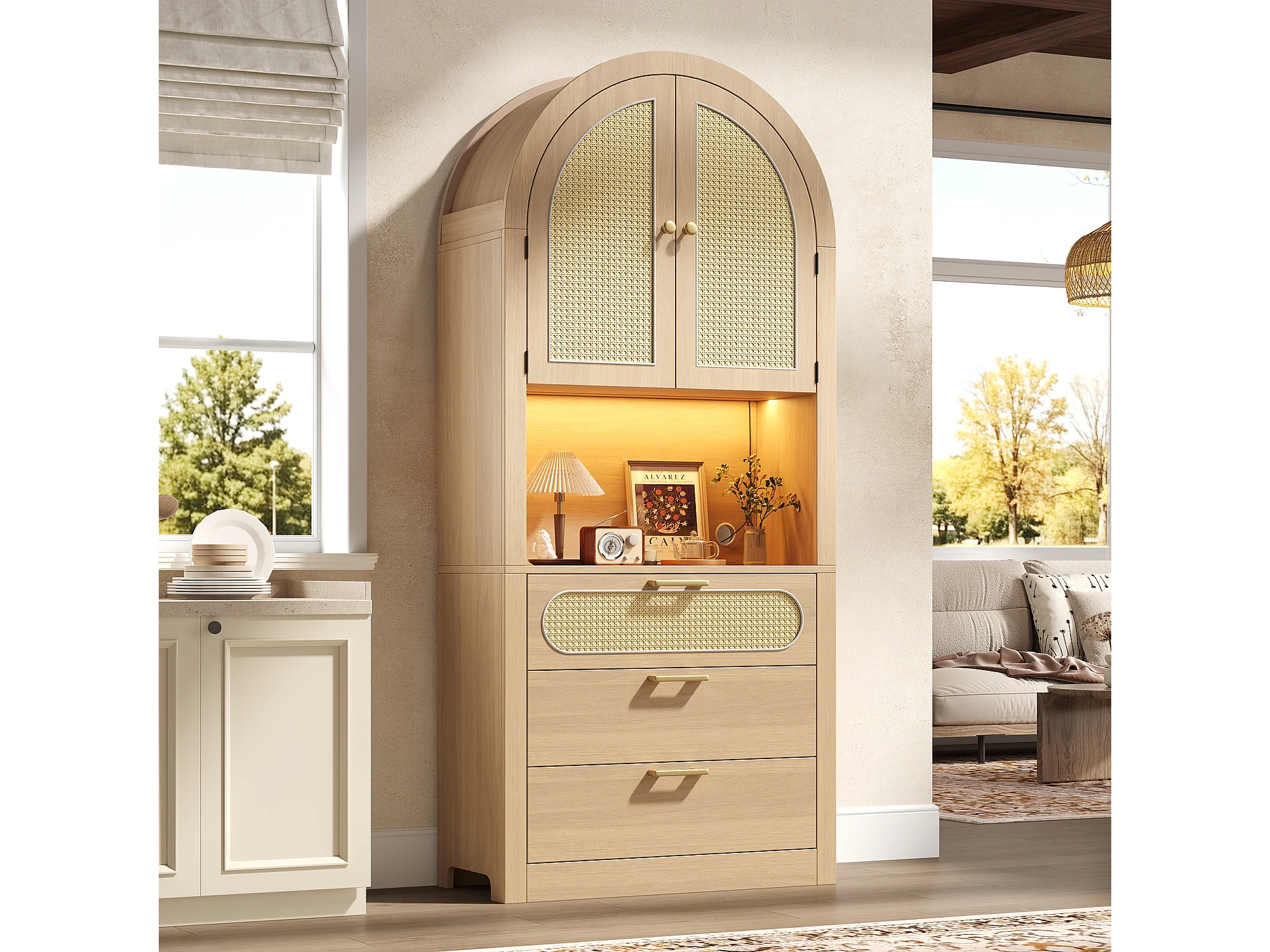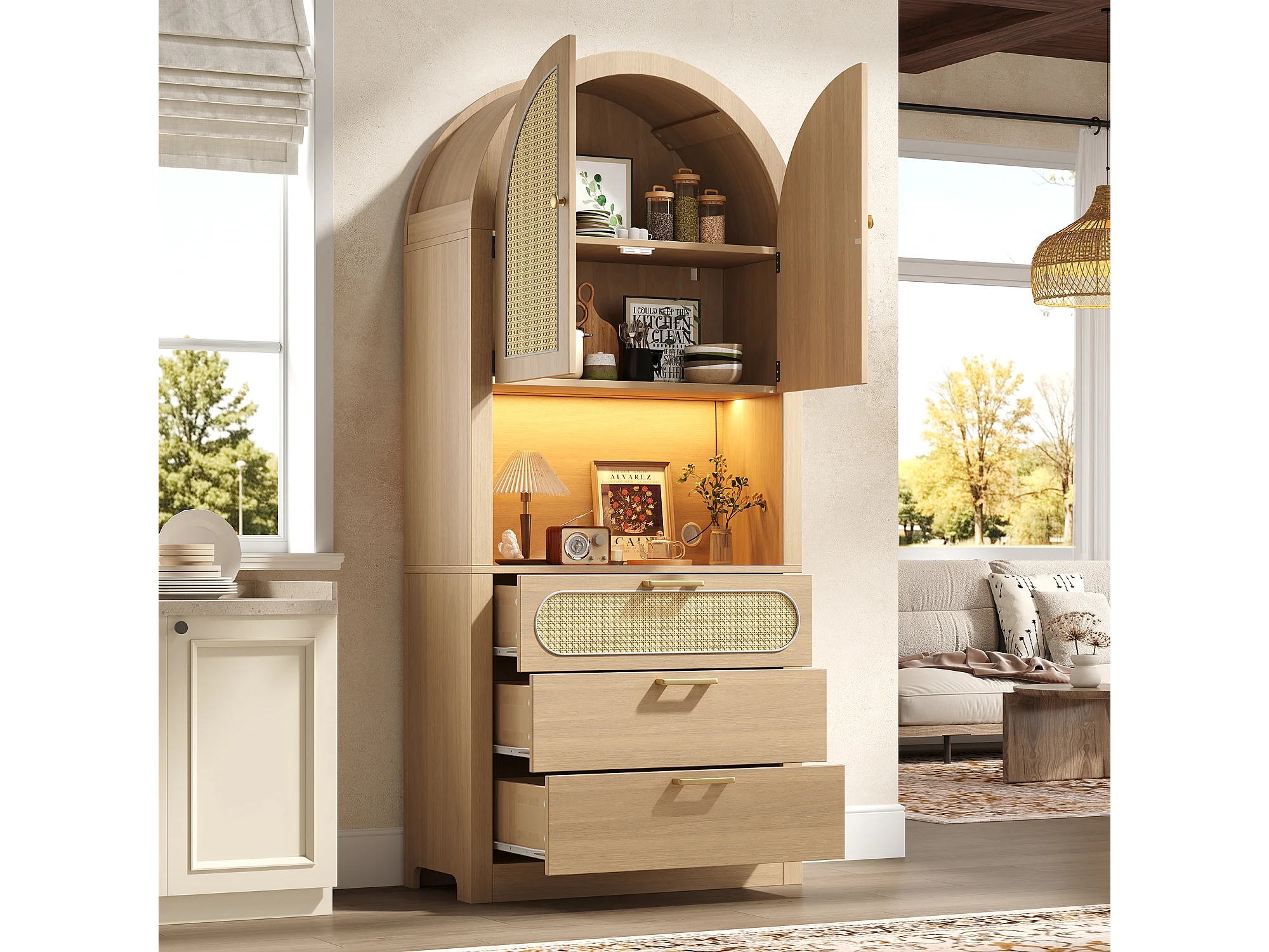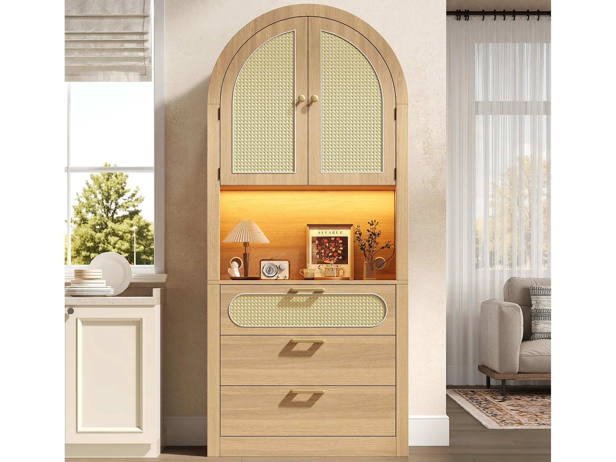 Moderne Vitrinen/Staufächer 80x35x180 cm - mit einstellbarer LED-Beleuchtung - mit 3 Schubladen und 2 Türen - Rattantüren - Helleiche