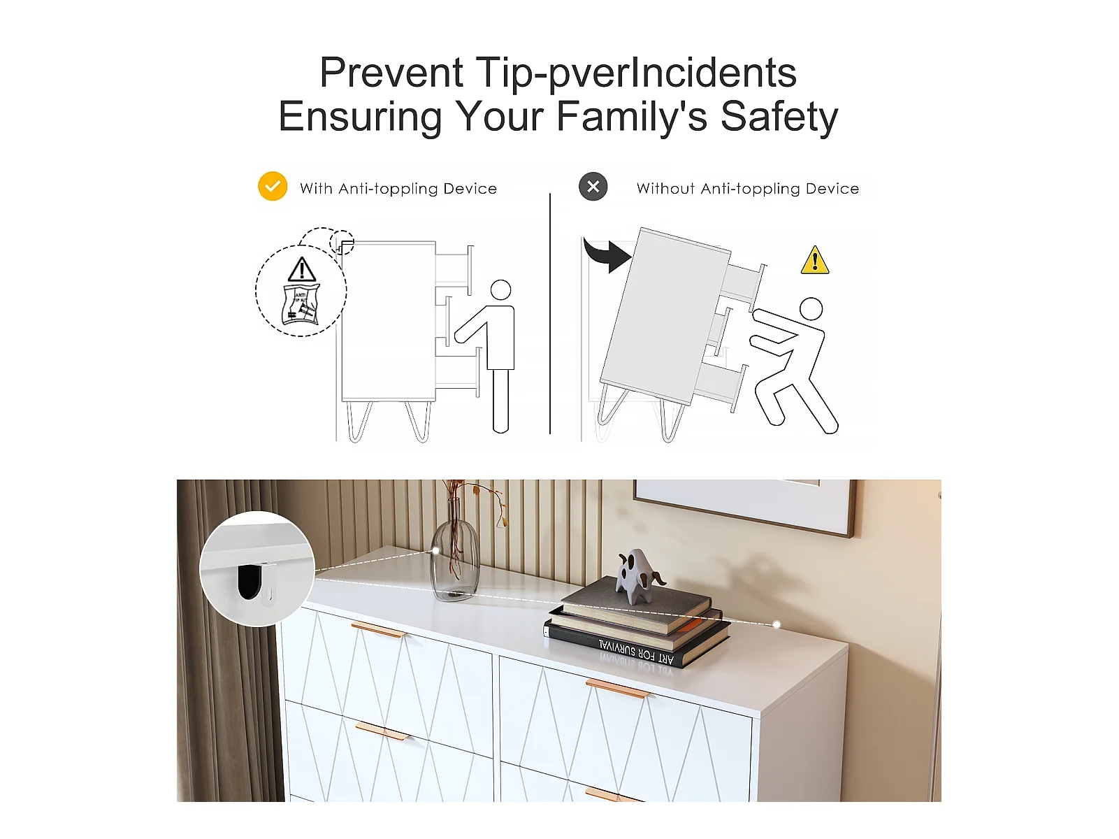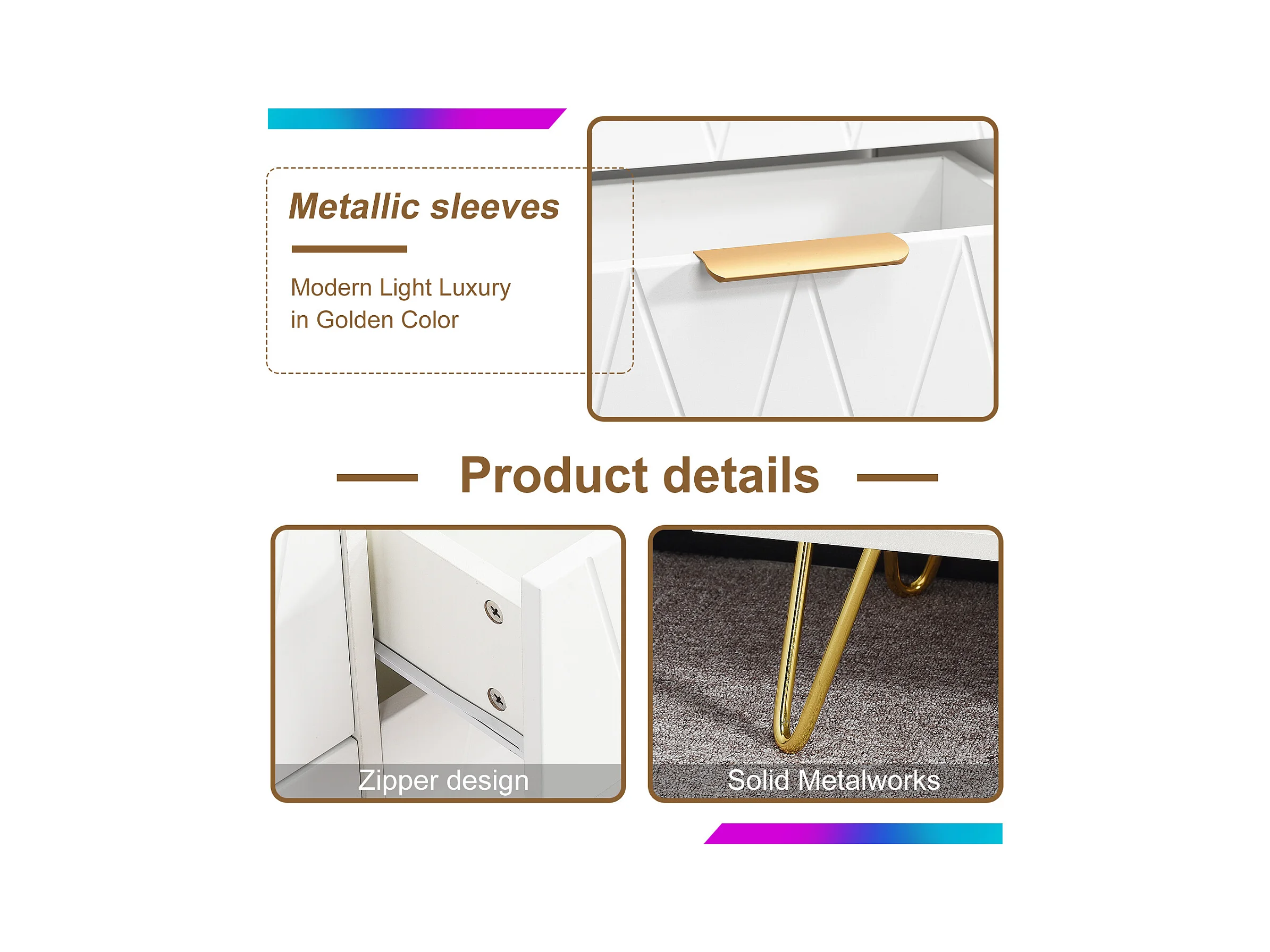 Moderne weiße Kommode mit 6 Schubladen im geometrischen Design und goldenen Griffen